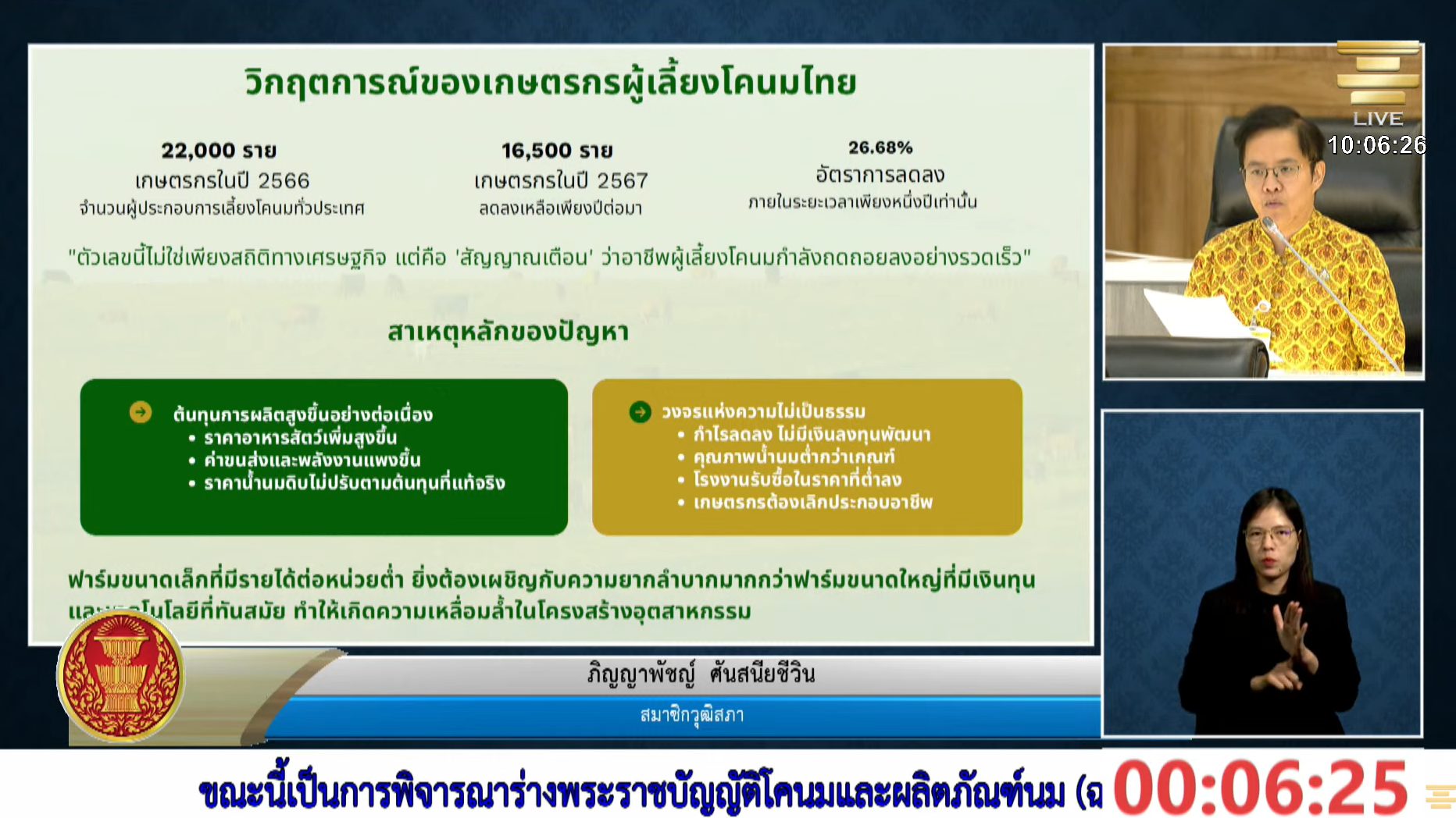 สมาชิกวุฒิสภา (สว.) หลายคนได้อภิปรายสนับสนุนร่างกฎหมายฉบับนี้ โดยนางสาวภิญญาพัชญ์ ศันสนียชีวิน สว. กล่าวว่า ปัจจุบัน จำนวนเกษตรกรผู้เลี้ยงโคนมของไทยลดลงอย่างน่ากังวล โดยในปี 2566 มีเกษตรกรโคนมกว่า 22,000 ราย แต่ในปี 2567 ลดลงเหลือเพียง 16,500 ราย คิดเป็น 26.68% โดยสาเหตุหลัก คือ ต้นทุนการผลิต ได้แก่ อาหารสัตว์ ค่าขนส่ง พลังงาน ที่สูงขึ้นอย่างต่อเนื่อง แต่ราคาซื้อน้ำนมดิบกลับไม่ปรับเพิ่มตามต้นทุนที่แท้จริง ทำให้ฟาร์มขนาดเล็กมีกำไรต่ำและบางส่วนต้องตัดสินใจเลิกอาชีพ อย่างไรก็ตาม แม้ว่าตนจะเห็นด้วยในหลักการ แต่เรื่องการเปิดเผยข้อมูลต้นทุนและราคา ต้องทำอย่างระมัดระวังไม่ให้การเปิดเผยข้อมูลกระทบต่อความสามารถในการแข่งขันของผู้ประกอบการในประเทศ โดยเฉพาะข้อมูลเชิงกลยุทธ์ของโรงงานหรือผู้ผลิต ขณะที่มาตรการคุ้มครองหรือสนับสนุนเกษตรกรรายย่อย จากผลกระทบจากการทำข้อตกลงการค้าเสรี (FTA) ไทยกับนิวซีแลนด์และออสเตรเลีย ยังไม่มีมาตรการเฉพาะ อาจส่งผลให้เกษตรกรรายย่อยจะไม่สามารถแข่งขันกับนมราคาถูกที่นำเข้าจากต่างประเทศได้ ทั้งนี้ ตนมีข้อเสนอแนะให้จัดตั้งกองทุนพัฒนาอุตสาหกรรมโคนม เพื่อสนับสนุนเกษตรกรรายย่อยในการปรับตัว พัฒนาเทคโนโลยี และยกระดับคุณภาพผลผลิต โดยเฉพาะผู้ที่ขาดทุนทรัพย์และความรู้ด้านนวัตกรรม รวมทั้งสนับสนุนการใช้นมสดในพื้นที่ในการดำเนินโครงการนมโรงเรียน เพื่อช่วยกระจายรายได้สู่ท้องถิ่น ข้อเสนอทั้งหมดนี้ไม่ใช่การปกป้องแบบปิดกั้น แต่คือ “การสร้างภูมิคุ้มกันที่เป็นธรรม” เพื่อให้เกษตรกรไทยสามารถแข่งขันได้อย่างมีศักดิ์ศรีในตลาดเสรี