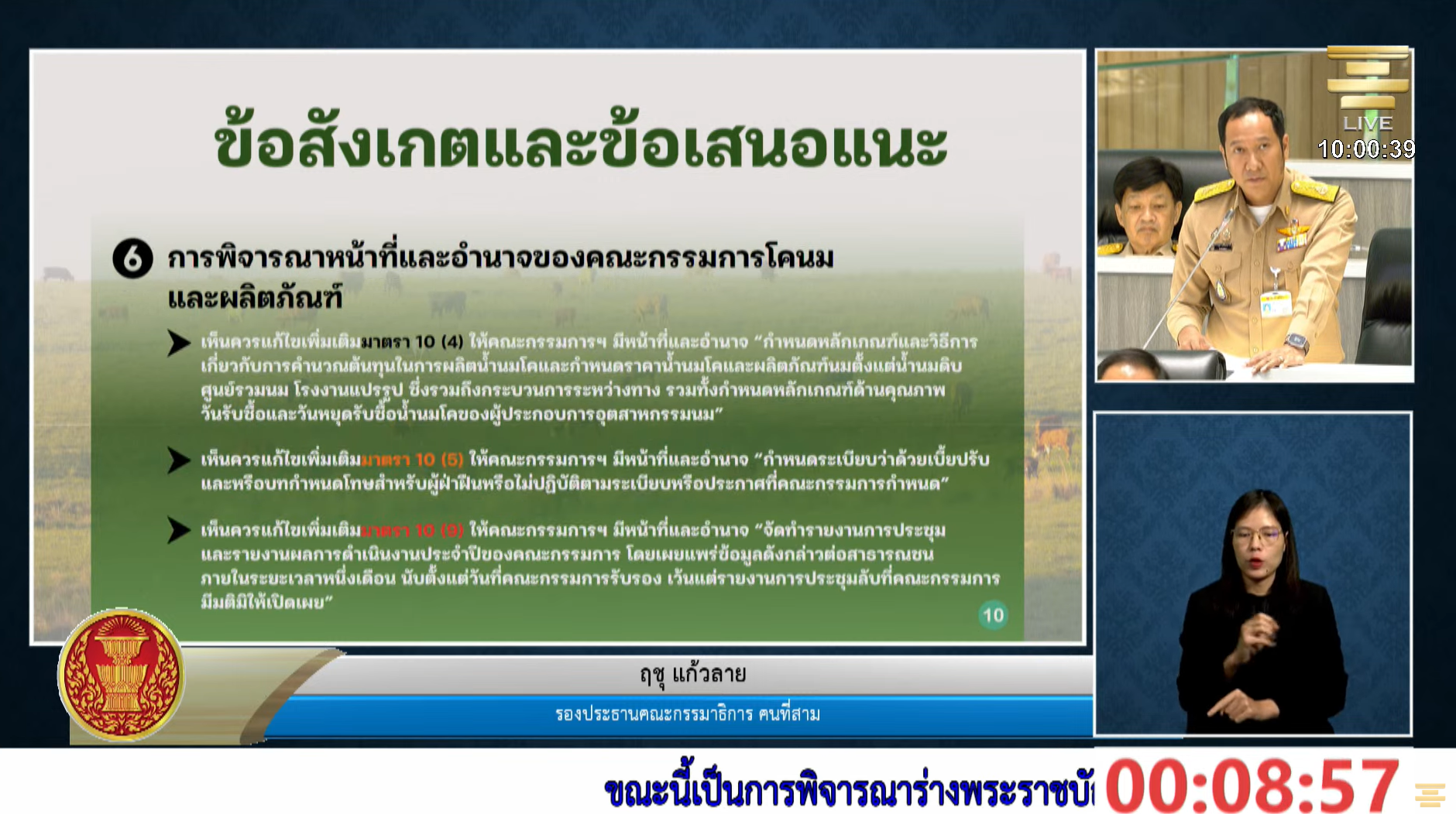 นายฤชุ แก้วลาย รองประธานคณะกรรมาธิการ (กมธ.) การเกษตรและสหกรณ์ วุฒิสภา กล่าวสรุปผลการศึกษาร่างกฎหมายโคนมฯ ของ กมธ. ว่า ร่างกฎหมายนี้มีเจตนาสำคัญในการเพิ่มอำนาจและปรับปรุงองค์ประกอบของคณะกรรมการโคนมและผลิตภัณฑ์นมให้สามารถบริหารจัดการอุตสาหกรรมนมได้อย่างครอบคลุมและมีประสิทธิภาพมากขึ้น โดยให้คณะกรรมการฯ ดังกล่าวมีอำนาจกำหนดราคาน้ำนมโคและผลิตภัณฑ์นม ตั้งแต่น้ำนมดิบ ศูนย์รวมนม โรงงานแปรรูป ซึ่งเดิมที่มีอำนาจเพียงการกำหนดราคาซื้อน้ำนมโคจากเกษตรกรเท่านั้น นอกจากนี้ ยังมีอำนาจกำหนดหลักเกณฑ์คุณภาพ วันรับซื้อ และวันหยุดรับซื้อน้ำนมโค และกำหนดเบี้ยปรับหรือบทลงโทษสำหรับผู้ฝ่าฝืนด้วย ทั้งนี้ ให้คณะกรรมการฯ จัดทำรายงานการประชุมและรายงานผลการดำเนินงานประจำปี โดยต้องเผยแพร่ต่อสาธารณะภายใน 1 เดือนนับแต่วันที่รับรอง และควรมีการประชุมอย่างน้อยปีละ 4 ครั้ง