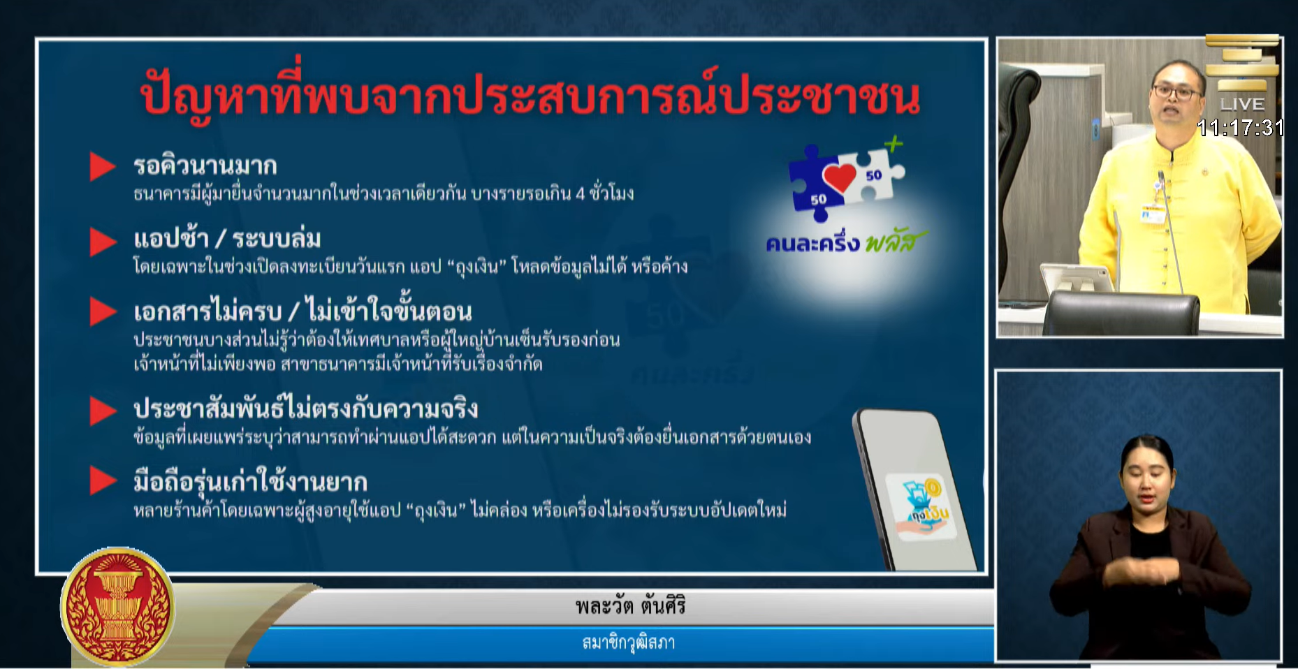 นายพละวัต ตันศิริ สมาชิกวุฒิสภา (สว.) ตั้งกระทู้ถามด้วยวาจาถามนายอนุทิน ชาญวีรกูล นายกรัฐมนตรี และรัฐมนตรีว่าการกระทรวงมหาดไทย ถึงการแก้ปัญหาการลงทะเบียนเข้าร่วมโครงการคนละครึ่งพลัส ภายหลังจากวันนี้ (20 ต.ค.68) ได้เปิดให้ประชาชนลงทะเบียนเพื่อรับสิทธิเป็นวันแรก ว่า ตั้งแต่ช่วงเช้าที่ผ่านมามีประชาชนทยอยลงทะเบียนรับสิทธิแล้วกว่า 17 ล้านราย จากจำนวนที่ตั้งเป้าไว้ 20 ล้านราย แต่ปัญหาที่เกิดขึ้นในขณะนี้ คือ มีผู้เข้าใช้งานจำนวนมากจนทำให้แอปพลิเคชัน “เป๋าตัง” โหลดช้า ค้าง จนระบบล่มหลายครั้ง และมีประชาชนจำนวนมากที่ต้องการใช้สิทธิ แต่ไม่สามารถลงทะเบียนออนไลน์ได้ เพราะต้องสมัครแอปพลิเคชันเป๋าตังก่อน จากนั้นจึงจะสมัครเข้าโครงการคนละครึ่งพลัสได้ ทำให้มีประชาชนที่ต้องการใช้สิทธิแต่ต้องลงทะเบียนใหม่ 4.6 แสนราย ต้องยืนยันตัวตนผ่านสาขาของธนาคารกรุงไทย ขณะที่อีกกว่า 4.5 แสนราย ไม่สามารถเข้าใช้งานแอปฯ เป๋าตังได้เนื่องจากลืมรหัสผ่าน ทำให้ต้องเข้าไปใช้บริการที่สาขาของธนาคารกรุงไทยเช่นกันบางรายต้องใช้เวลารอถึง 4 ชั่วโมง ตนขอให้ธนาคารกรุงไทย ประชาสัมพันธ์ไปยังประชาชนว่าสามารถแก้ไขผ่านระบบออนไลน์ได้ เพื่อลดความแออัด ส่วนผู้ประกอบการร้านค้าทั่วประเทศ ก็มีการลงทะเบียนจำนวนมากเช่นกัน จนเกิดความแออัด ดังนั้น ตนมีข้อเสนอแนะให้รัฐบาลปรับปรุงให้ร้านค้าสามารถลงทะเบียนออนไลน์เต็มรูปแบบ ทั้งแนบเอกสารและยืนยันตัวตนผ่านระบบ ได้โดยไม่ต้องไปธนาคาร รวมถึงตั้งจุดบริการชั่วคราวในชุมชน และจัดเจ้าหน้าที่อาสาช่วยเหลือผู้สูงอายุและร้านค้ารายย่อยด้วย นอกจากนี้ ตนขอให้มีการเก็บข้อมูลการใช้จ่ายเงิน และปริมาณเงินหมุนเวียนในระบบ เพื่อนำไปใช้ในการวางแผนเชิงนโยบายเพื่อออกมาตรการกระตุ้นกระตุ้นเศรษฐกิจในระยะยาวต่อไป