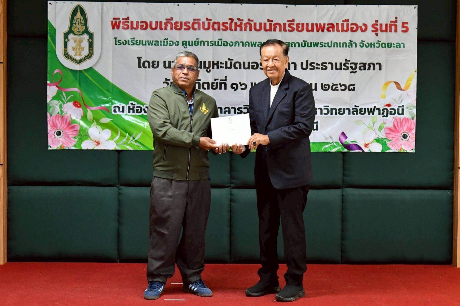 ประธานรัฐสภา ได้กล่าวให้โอวาทว่า รู้สึกยินดีและเป็นเกียรติอย่างยิ่งที่ได้มาเป็นประธานมอบเกียรติบัตรให้กับนักเรียนพลเมือง ศูนย์พัฒนาการเมืองภาคพลเมือง จังหวัดยะลา ซึ่งมูลนิธิศูนย์กลางอิสลามเพื่อการพัฒนายะลา ร่วมกับศูนย์พัฒนาการเมืองภาคพลเมือง จังหวัดยะลา ได้จัดขึ้นในครั้งนี้ ขอแสดงความยินดี และชื่นชมนักเรียนพลเมือง รุ่นที่ 5 ทุกคน ที่มุ่งมั่นตั้งใจศึกษาอบรมในโครงการโรงเรียนพลเมือง รุ่นที่ 5 ประจำปีงบประมาณ พ.ศ. 2568 หลักสูตรพลเมืองกับการจัดการพื้นที่ด้วยกระบวนการนโยบายสาธารณะ จนประสบความสำเร็จและจบหลักสูตร แม้ว่าแต่ละคนจะมีที่มาแตกต่างกัน ทั้งภาคราชการ ภาคเอกชน หรือภาคประชาสังคมก็ตาม แต่ทุกคนต่างมีเจตจำนงร่วมกันคือ การเป็นพลังสำคัญในการขับเคลื่อนสังคม และการมีบทบาทสนับสนุนเกี่ยวกับการพัฒนาการเมืองและธำรงรักษาไว้ซึ่งการปกครองในระบอบประชาธิปไตยอันมีพระมหากษัตริย์ทรงเป็นประมุข ดังนั้น จึงถือเป็นหน้าที่และภารกิจอันสำคัญ ที่ทุกคนจะมีโอกาสได้นำความรู้ที่ได้รับทั้งภาคทฤษฎีและภาคปฏิบัติจากการศึกษาอบรม นำไปต่อยอดในบทบาทหน้าที่ของตนเอง เพื่อความก้าวหน้าขององค์กร สังคม และประเทศชาติ และเพื่อประโยชน์สุขของประชาชนโดยรวม ประการสำคัญ ความรู้จะเป็นประโยชน์ได้อย่างแท้จริงก็ต่อเมื่ออยู่กับผู้ที่มีคุณธรรม มีสำนึกรับผิดชอบ มีความซื่อสัตย์สุจริต และถือประโยชน์ส่วนรวมเป็นสำคัญ