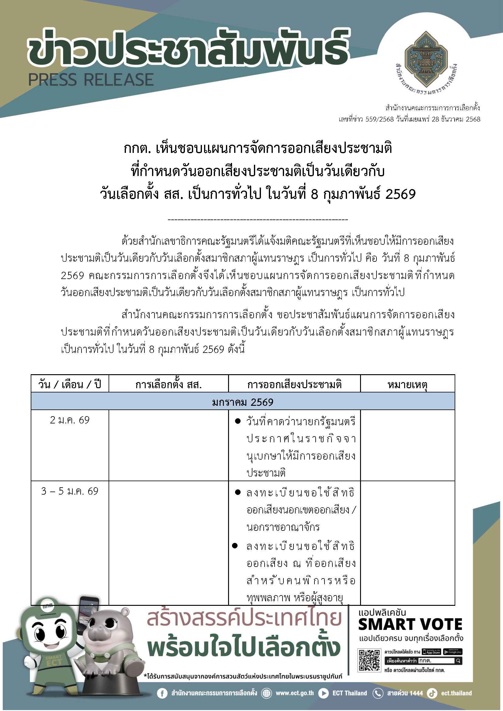 สำนักงาน กกต. ขอประชาสัมพันธ์แผนการจัดการออกเสียงประชามติที่กำหนดวันออกเสียงประชามติเป็นวันเดียวกับวันเลือกตั้งสมาชิกสภาผู้แทนราษฎรเป็นการทั่วไป ในวันที่ 8 กุมภาพันธ์ 2569 ดังนี้