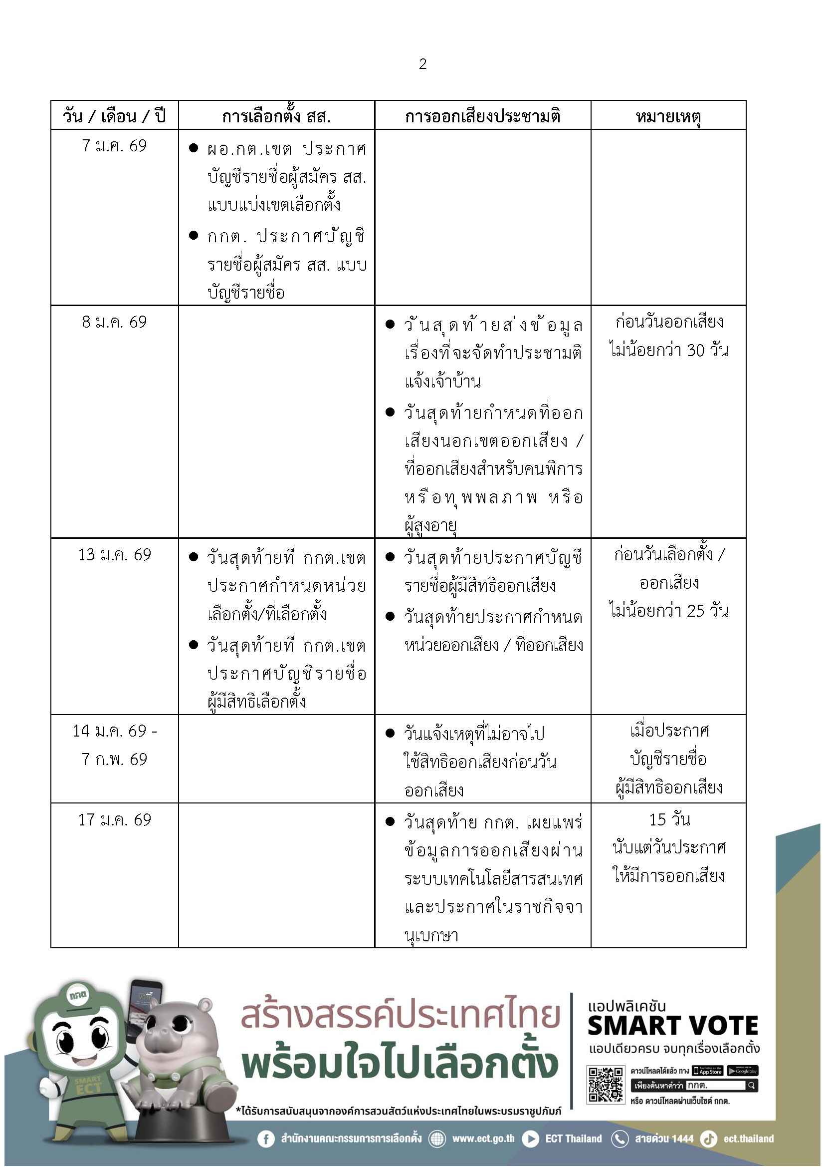 ขณะที่การลงคะแนนเลือกตั้งล่วงหน้าในเขตเลือกตั้ง เลือกตั้งล่วงหน้านอกเขตเลือกตั้งและเลือกตั้ง ณ ที่เลือกตั้งสำหรับผู้พิการหรือทุพพลภาพหรือผู้สูงอายุ ในวันที่ 1 กุมภาพันธ์ และกำหนดให้วันที่ 1-7 กุมภาพันธ์ เป็นวันที่แจ้งเหตุที่ไม่อาจไปใช้สิทธิเลือกตั้งก่อนวันเลือกตั้ง และ 4 กุมภาพันธ์ 2569 จะมีการประกาศจำนวนผู้ลงทะเบียนใช้สิทธิเลือกตั้งนอกราชอาณาจักรแยกตามประเทศ และจำนวนผู้ลงทะเบียนขอใช้สิทธิออกเสียงประสานมตินอกราชอาณาจักรแยกตามประเทศ และมีการเลือกตั้ง สส. และออกเสียงประชามติพร้อมกันในวันที่ 8 กุมภาพันธ์ 2569