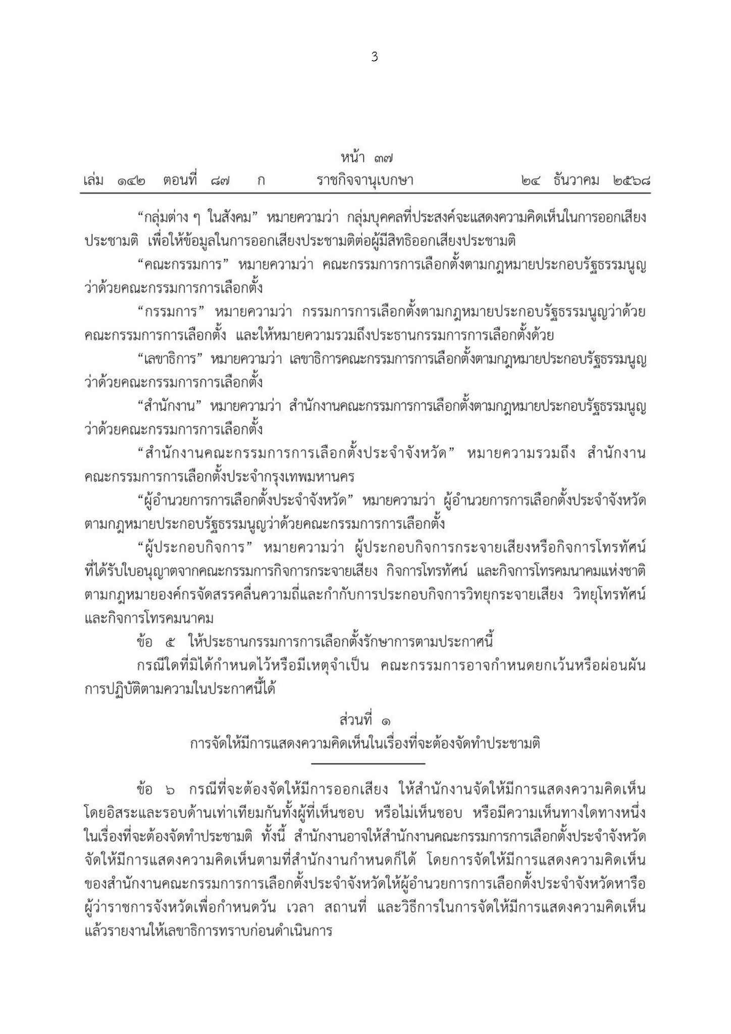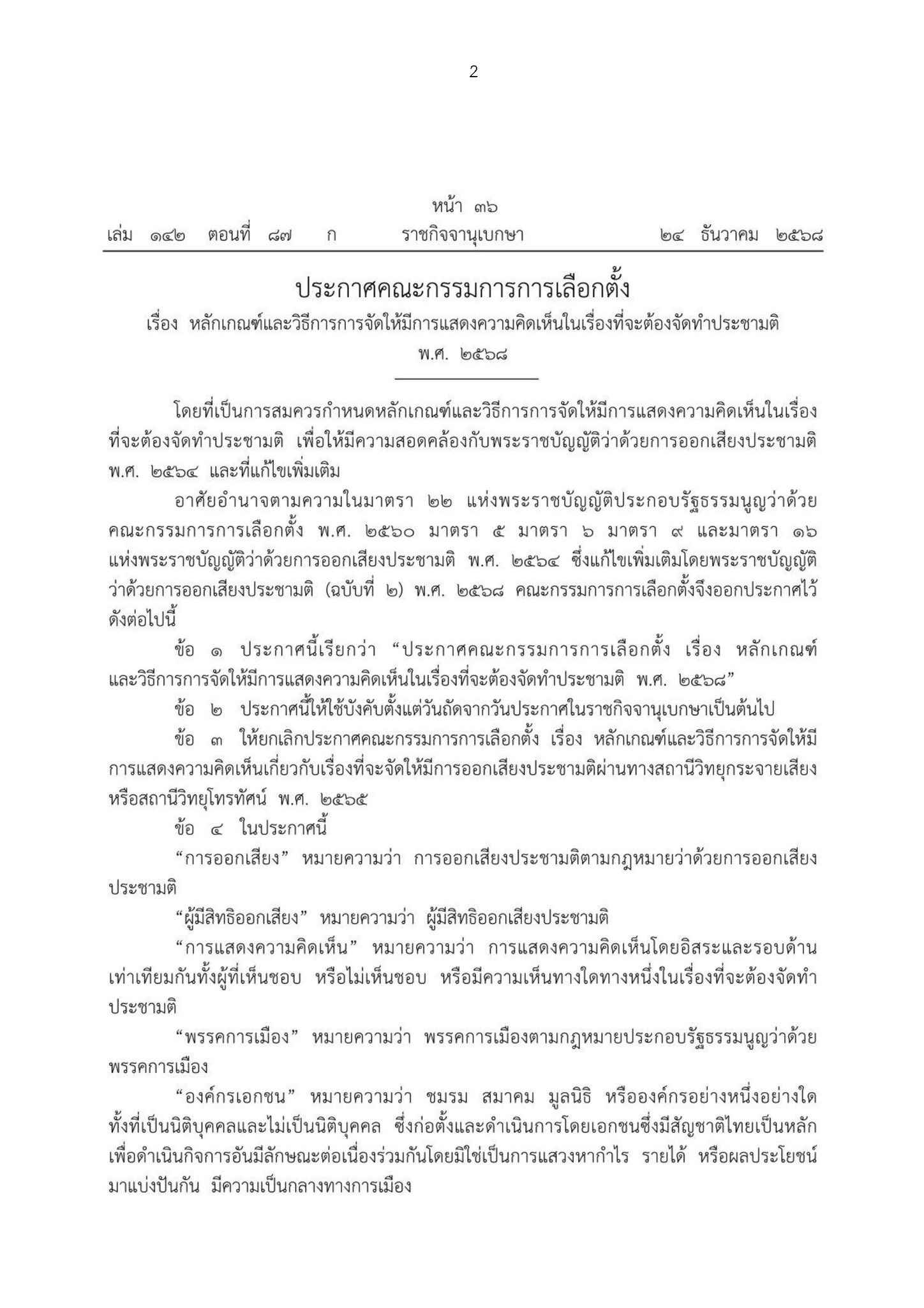 สำนักงานคณะกรรมการการเลือกตั้ง เผยแพร่ประกาศคณะกรรมการการเลือกตั้ง (กกต.) เรื่อง หลักเกณฑ์และวิธีการการจัดให้มีการแสดงความคิดเห็นในเรื่องที่จะต้องจัดทำประชามติ พ.ศ. 2568 ซึ่งกำหนดแนวทางการแสดงความคิดเห็นโดยเสรี เสมอภาพ และเท่าเทียมกัน ทั้งผู้เห็นชอบ หรือไม่เห็นชอบ หรือมีความเห็นทางใดทางหนึ่งในเรื่องที่จะต้องจัดทำประชามติ เพื่อให้มีความสอดดคล้องกับพระราชบัญญัติว่าด้วยการออกเสียงประชามติ พ.ศ. 2564 และที่แก้ไขเพิ่มเติม