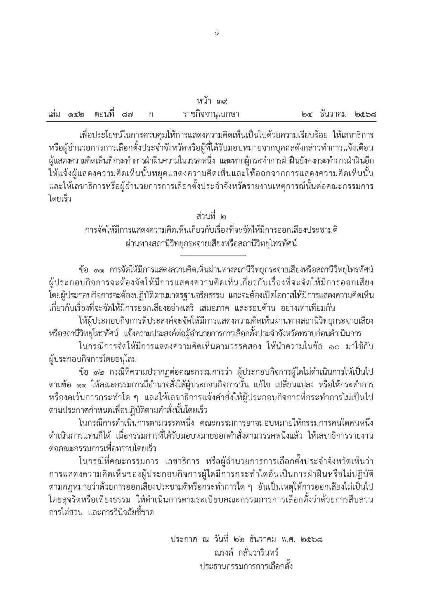 โดยประกาศฉบับนี้ได้กำหนดแนวทางการจัดเวทีแสดงความคิดเห็นทั้งในพื้นที่จังหวัดและผ่านสื่อกระจายเสียงและโทรทัศน์ พร้อมมาตรการควบคุมเพื่อป้องกันการละเมิดจริยธรรมและการแสดงความเห็นที่อาจก่อให้เกิดความวุ่นวาย สาระสำคัญของประกาศ ได้แก่ การจัดเวทีแสดงความคิดเห็นต้องดำเนินการโดยผู้อำนวยการสำนักงาน กกต. ประจำจังหวัด หรือผู้แทนที่ได้รับมอบหมาย และผู้แสดงความคิดเห็นต้องปฏิบัติตามจริยธรรมวิชาชีพ ห้ามแสดงความเห็นในลักษณะเสียดสี ก้าวร้าว หรือกล่าวหาโดยไม่มีมูล พร้อมกำหนดให้ผู้ประกอบกิจการวิทยุกระจายเสียงและโทรทัศน์ต้องแจ้งความประสงค์ต่อ กกต. ก่อนดำเนินการ หากฝ่าฝืน กกต.มีอำนาจสั่งปรับปรุง ระงับ หรือยกเลิกการดำเนินการ และอาจดำเนินการทางกฎหมายหากเกิดความเสียหาย