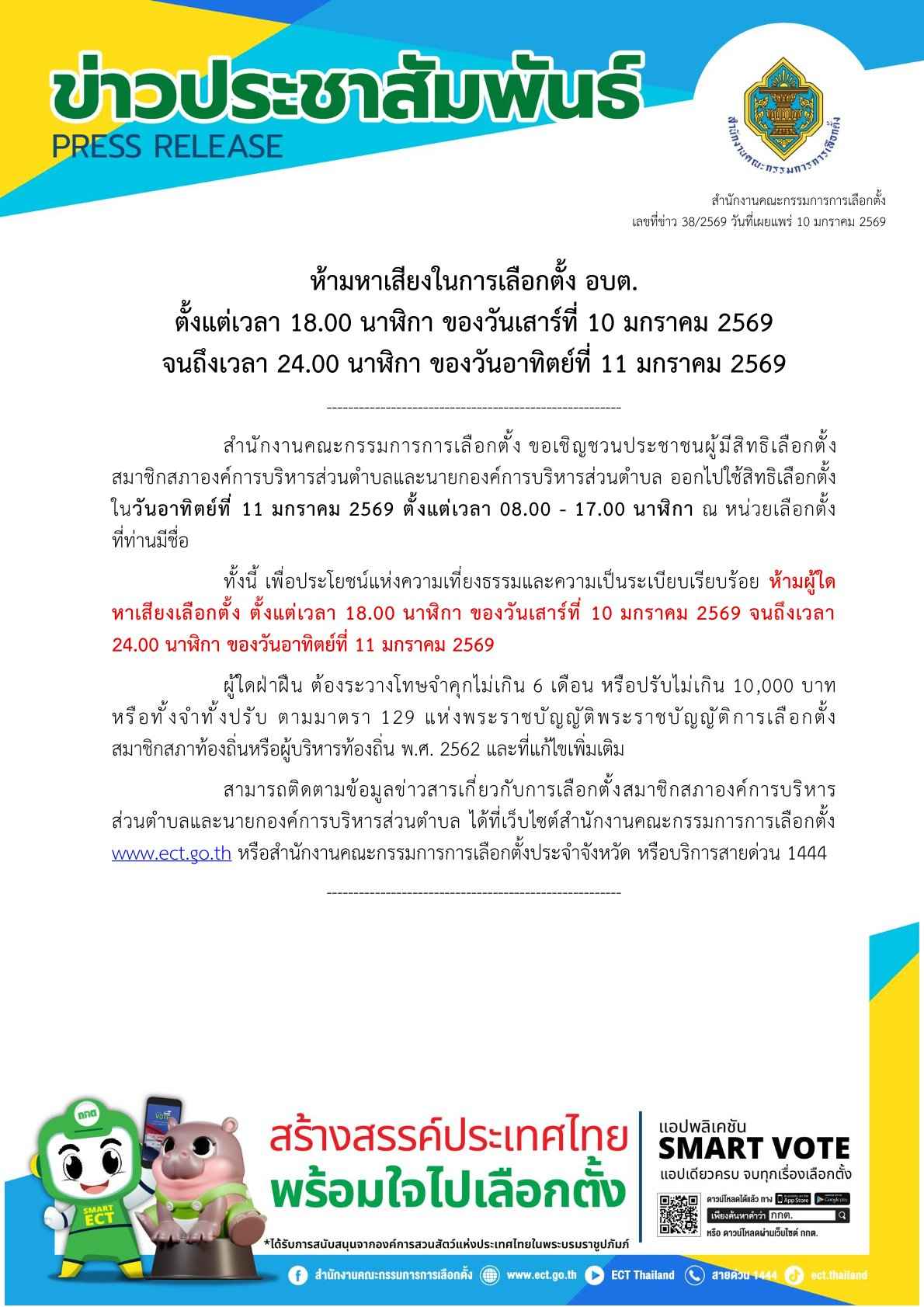 10 ม.ค. 69 - สำนักงาน กกต. เตือนห้ามหาเสียงเลือกตั้ง อบต. ตั้งแต่ 18.00 น. ของวันนี้ จนถึง 24.00 น. ของวันเลือกตั้ง พร้อมเชิญชวนประชาชนออกมาใช้สิทธิ