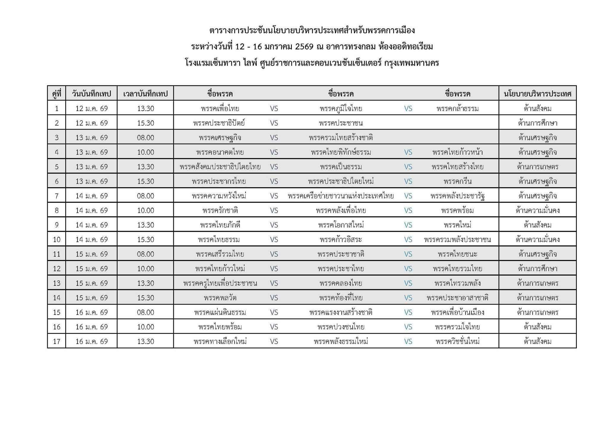สำนักงานคณะกรรมการการเลือกตั้ง (กกต.) เผยแพร่ข่าวประชาสัมพันธ์เลขที่ 40/2569 เรื่องการจัดเวทีประชันนโยบายบริหารประเทศสำหรับพรรคการเมือง ด้วยสำนักงาน กกต. ได้ดำเนินการจัดเวทีประชันนโยบายบริหารประเทศสำหรับพรรคการเมืองในการเลือกตั้งสมาชิกสภาผู้แทนราษฎร (สส.) ตามมาตรา 81แห่งพระราชบัญญัติประกอบรัฐธรรมนูญว่าด้วยการเลือกตั้ง สส. พ.ศ. 2561 มีพรรคการเมืองที่แจ้งความประสงค์เข้าร่วมเวทีประชันนโยบายบริหารประเทศสำหรับพรรคการเมือง จำนวน 49 พรรคการเมือง และได้กำหนดให้มีการบันทึกเทปการประชันนโยบายฯ ในวันที่ 12 มกราคม พ.ศ. 2569 เวลา 13.30 – 17.00 นาฬิกา และวันที่ 13 – 16 มกราคม พ.ศ. 2569 เวลา 08.00 – 17.00 นาฬิกา ณ อาคารทรงกลม ห้องออดิทอเรียม โรงแรมเซ็นทารา ไลฟ์ ศูนย์ราชการและคอนเวนชันเซ็นเตอร์ แจ้งวัฒนะ แขวงทุ่งสองห้อง เขตหลักสี่ กรุงเทพมหานคร เพื่อนำไปออกอากาศทางสถานีวิทยุโทรทัศน์และสถานีวิทยุกระจายเสียง ระหว่างวันที่ 2 – 6 กุมภาพันธ์ พ.ศ. 2569 สำหรับตารางการออกอากาศ กกต. จะแจ้งให้ทราบต่อไป