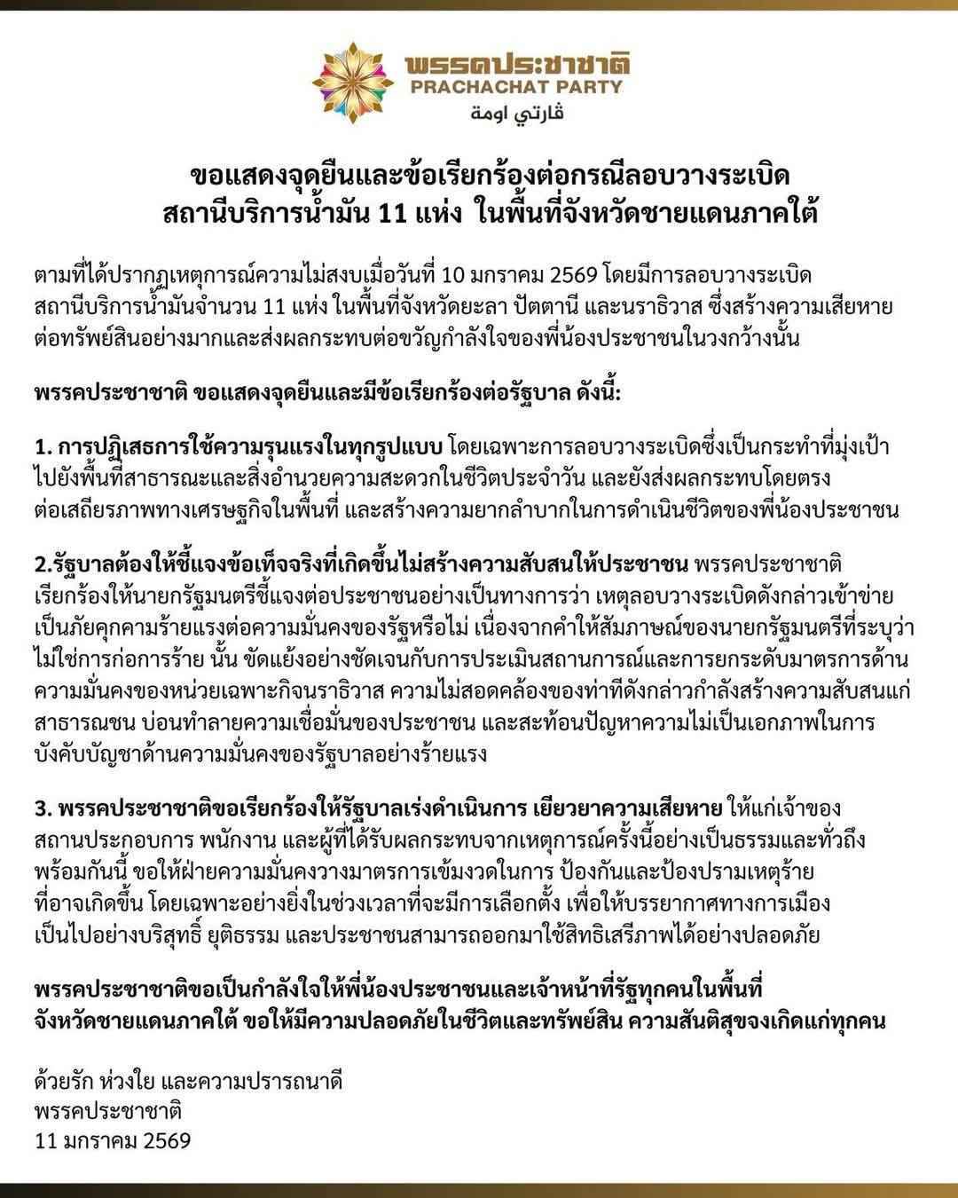 พรรคประชาชาติออกแถลงการณ์แสดงจุดยืนและข้อเรียกร้องต่อรัฐบาลกรณีเกิดเหตุลอบวางระเบิดสถานีบริการน้ำมัน ในพื้นที่จังหวัดชายแดนภาคใต้ โดยระบุว่า ตามที่ได้ปรากฏเหตุการณ์ความไม่สงบเมื่อวันที่ 10 มกราคม 2569 มีการลอบวางระเบิดสถานีบริการน้ำมันจำนวน 11 แห่ง ในพื้นที่จังหวัดยะลา ปัตตานี และนราธิวาส สร้างความเสียหายต่อทรัพย์สินอย่างมากและส่งผลกระทบต่อขวัญกำลังใจของประชาชนในวงกว้างนั้น