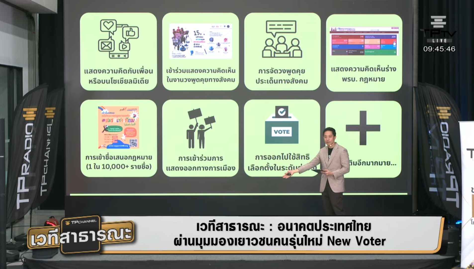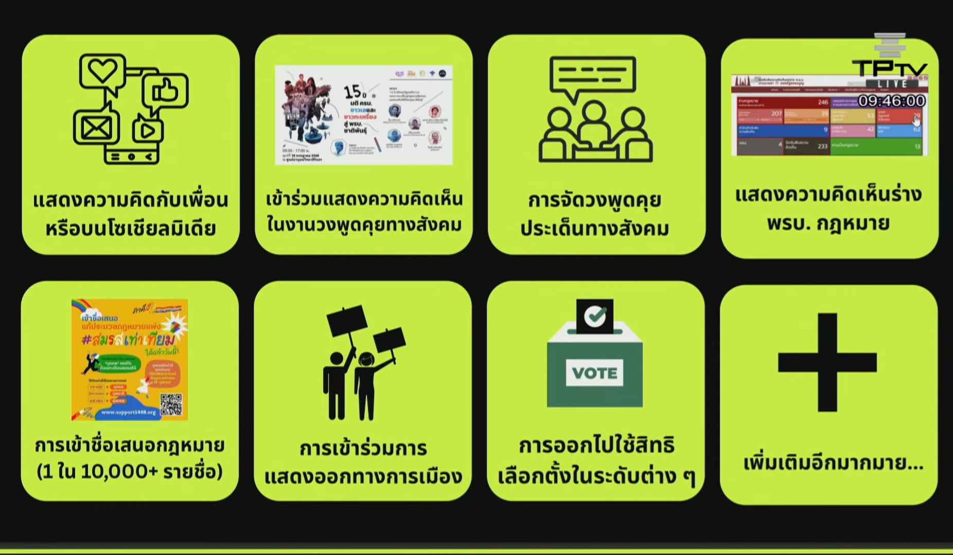 ประธาน กมธ.การพัฒนาการเมืองฯ วุฒิสภา กล่าวทิ้งท้ายแนะแนวทางการมีส่วนร่วมทางการเมืองของ New Voter อาทิ แสดงความคิดเห็นกับเพื่อนหรือบนโซเชียลมีเดีย เข้าร่วมแสดงความคิดเห็นในงานวงพูดคุยทางสังคม การจัดวงพูดคุยประเด็นทางสังคม แสดงความคิดเห็นต่อร่างกฎหมาย การเข้าชื่อเสนอกฎหมาย การเข้าร่วมการแสดงออกทางการเมือง และการออกไปใช้สิทธิ์เลือกตั้งในระดับต่าง ๆ พร้อมกล่าวย้ำว่า ขอให้พลเมืองคนรุ่นใหม่ที่มีสิทธิเลือกตั้ง สส. ครั้งแรก ออกไปใช้สิทธิเลือกตั้งในวันที่ 8 ก.พ.69 ให้มากที่สุด และใช้สิทธิออกเสียงประชามติเพื่อให้โอกาสประเทศไทยได้มีโอกาสแก้ไขโครงสร้างทางการเมืองอีกครั้ง