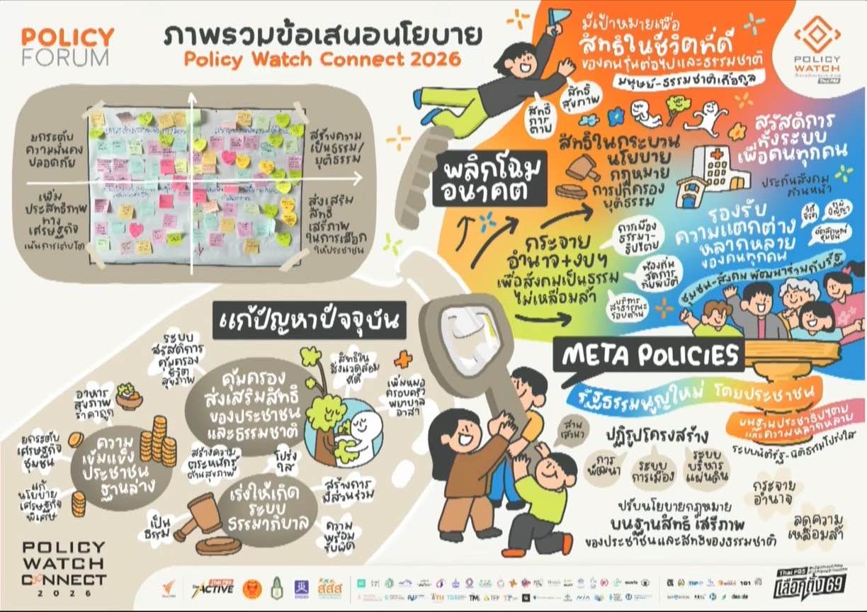 ด้าน นายกฤษฎา บุญชัย เลขาธิการสถาบันชุมชนท้องถิ่นพัฒนา ผู้ประสานงานเครือข่าย Thai Climate Justice for All (TCJA) ในฐานะตัวแทนผู้นำเสนอนโยบาย ระบุว่าจาก 12 เวทีที่ผ่านมา สามารถสังเคราะห์เป็นข้อเสนอนโยบายจากภาคประชาชนรวม 80 ประเด็น ซึ่งเกิดจากประสบการณ์จริง และบทเรียนชีวิตของผู้คนในสังคม ถูกกลั่นออกมาเป็นปัญญารวมหมู่ โดยมุ่งหวังไม่เพียงแก้ปัญหาเฉพาะหน้า แต่ต้องการสร้างจุดเปลี่ยนเชิงโครงสร้างของประเทศ