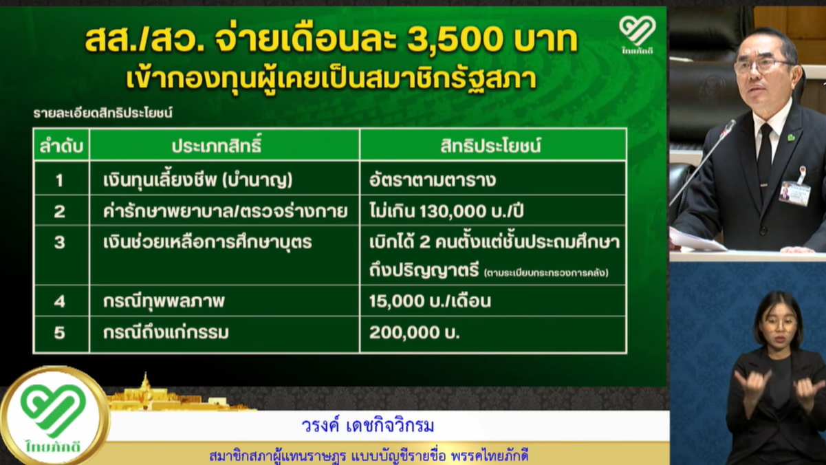 ต่อมา สมาชิกสภาผู้แทนราษฎร (สส.) ได้อภิปรายต่อรายงาน เริ่มที่นายแพทย์ วรงค์ เดชกิจวิกรม สส.แบบบัญชีรายชื่อ พรรคไทยภักดี อภิปรายว่า จริงอยู่ว่ากองทุนฯ ส่วนหนึ่งเป็นการให้สมาชิกรัฐสภาจ่ายเงิน สมทบเดือนละ 3,500 บาท เพื่อแลกกับสิทธิประโยชน์ในเชิงสวัสดิการ 5 สิทธิ คือ เงินทุนเลี้ยงชีพ (บำนาญ) ค่ารักษาพยาบาล/ตรวจร่างกาย ปีละไม่เกิน 130,000 บาท เงินช่วยเหลือการศึกษาบุตร เบิกได้ 2 คน ตั้งแต่ชั้นประถมศึกษาถึงปริญญาตรี กรณีทุพพลภาพได้รับเงิน 15,000 บาทต่อเดือน และกรณีถึงแก่กรรมได้รับเงิน 200,000 บาท ซึ่งมองว่าเป็นกองทุนฯ ที่ให้สวัสดิการมากเกินไป และอยากเสนอแนะว่าหากปรับลดสวัสดิการตรงส่วนใดได้ก็ควรปรับลด ไม่เช่นนั้นกองทุนฯ อาจจะขาดทุนจนไม่สามารถดำเนินการต่อได้ โดยยกตัวอย่างสิทธิในการได้รับเงินบำนาญเริ่มต้น 21,300 บาทต่อเดือน หากเป็น สส. เพียง 1 เดือน แต่ไม่ถึง 1 ปี ก็จะได้รับบำนาญไปตลอดชีวิต ซึ่งเห็นว่านี่เป็นการเอาเปรียบประชาชนมากเกินไป