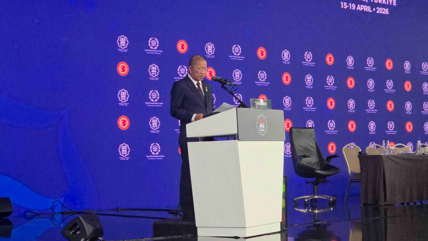 นายมงคล สุระสัจจะ ประธานวุฒิสภา กล่าวถ้อยแถลงต่อที่ประชุมสมัชชาสหภาพรัฐสภา (IPU) ครั้งที่ 152 และการประชุมอื่น ๆ ที่เกี่ยวข้อง ระหว่างวันที่ 15-19 เมษายน 2569 ณ นครอิสตันบูล สาธารณรัฐตุรกี โดยเน้นบทบาทของรัฐสภา ในฐานะเสาหลักแห่งความหวังและความเป็นธรรม ท่ามกลางความท้าทายของโลกยุคปัจจุบัน ทั้งความขัดแย้งทางภูมิรัฐศาสตร์ การเปลี่ยนแปลงสภาพภูมิอากาศ และความก้าวหน้าของเทคโนโลยี โดยเฉพาะปัญญาประดิษฐ์ (AI) โดยมีประเด็นสำคัญ ได้แก่ บทบาทรัฐสภาต้องเสริมสร้างความเชื่อมั่นของประชาชน ยึดหลักพหุภาคีนิยม สิทธิมนุษยชน และความเป็นธรรม เพื่อรับมือความท้าทายระดับโลก แนวทางของประเทศไทยมุ่งสร้างความยุติธรรมที่ครอบคลุม ผ่านการปฏิรูปกฎหมายและระบบสวัสดิการ ลดความเหลื่อมล้ำ โดยเพิ่มโอกาสทางการศึกษาและพัฒนาทักษะ ส่งเสริมบทบาทสตรีในรัฐสภาบูรณาการเป้าหมายการพัฒนาที่ยั่งยืน (SDGs) ไปสู่การออกกฎหมาย