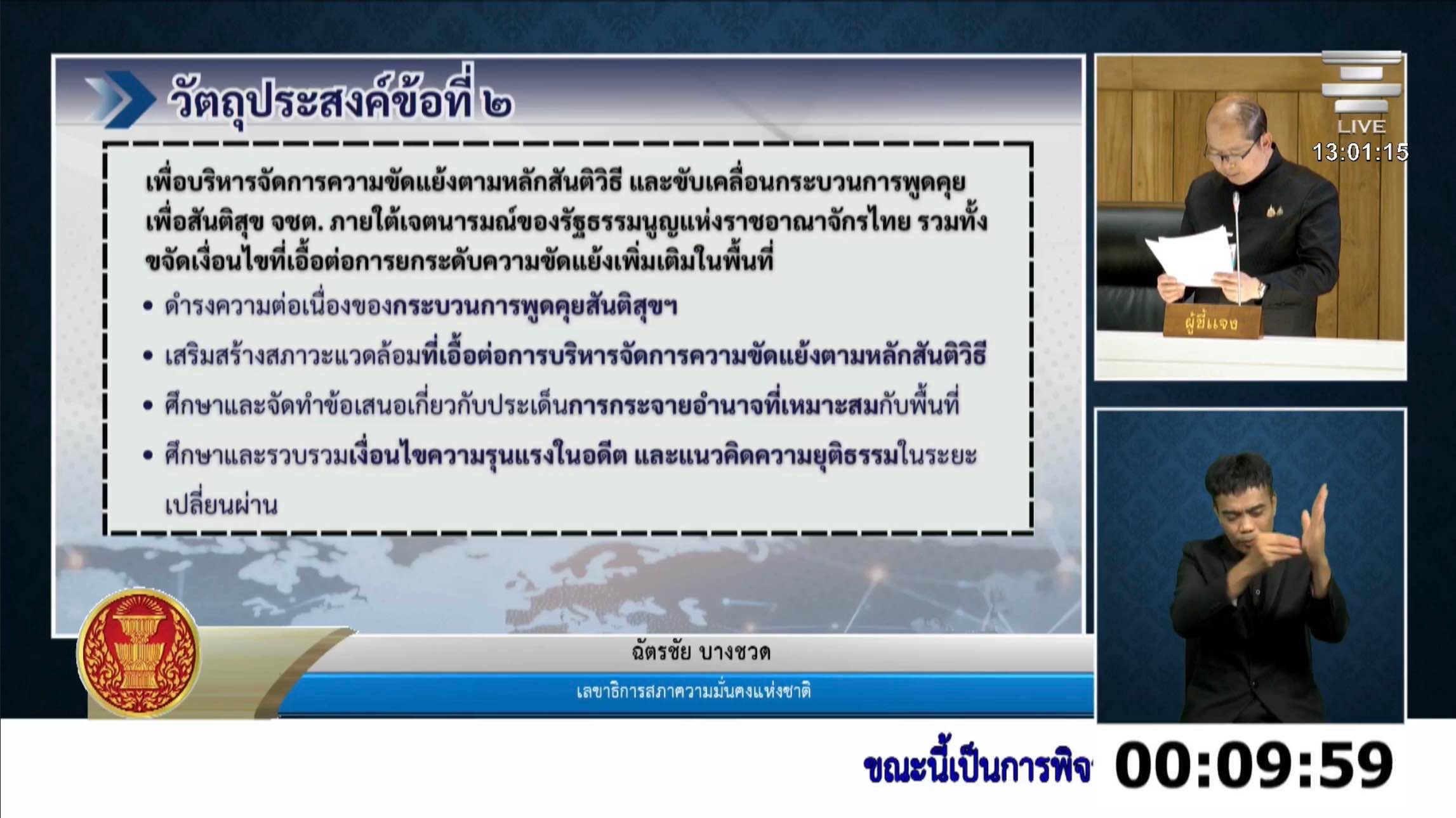 ที่ประชุมวุฒิสภา พิจารณาร่างนโยบายการบริหารและการพัฒนาจังหวัดชายแดนภาคใต้ พ.ศ. 2568 - 2570 ตามมาตรา 4 แห่งพระราชบัญญัติการบริหารราชการจังหวัดชายแดนภาคใต้ พ.ศ. 2553 ซึ่งคณะรัฐมนตรีให้ความเห็นชอบและเสนอให้รัฐสภารับทราบ เพื่อใช้เป็นกรอบแนวทางให้หน่วยงานของรัฐนำไปขับเคลื่อนการแก้ไขปัญหาในพื้นที่อย่างเป็นระบบและต่อเนื่อง ขณะเดียวกัน นายฉัตรชัย บางชวด เลขาธิการสภาความมั่นคงแห่งชาติ (สมช.) ในฐานะที่ สมช. เป็นหน่วยงานจัดทำร่างนโยบายดังกล่าว ชี้แจงว่าสถานการณ์ในพื้นที่จังหวัดชายแดนภาคใต้ยังคงมีความรุนแรงเกิดขึ้นอย่างต่อเนื่อง ควบคู่กับความพยายามสร้างความตึงเครียดและบั่นทอนความเชื่อมั่นต่อภาครัฐ รวมถึงการขยายตัวของความขัดแย้งในสังคมและวัฒนธรรม จึงจำเป็นต้องกำหนดนโยบายที่ชัดเจนและสอดคล้องกับสถานการณ์ปัจจุบัน นโยบายการบริหารและการพัฒนาจังหวัดชายแดนภาคใต้ในระยะ 3 ปี กำหนดวิสัยทัศน์ให้จังหวัดชายแดนภาคใต้เข้าสู่ภาวะปกติที่ปราศจากความรุนแรง ได้รับการพัฒนาบนพื้นฐานของความหลากหลายทางวัฒนธรรม และการมีส่วนร่วมของทุกภาคส่วน โดยมีวัตถุประสงค์ 8 ประการ และประเด็นนโยบาย 38 ประเด็น