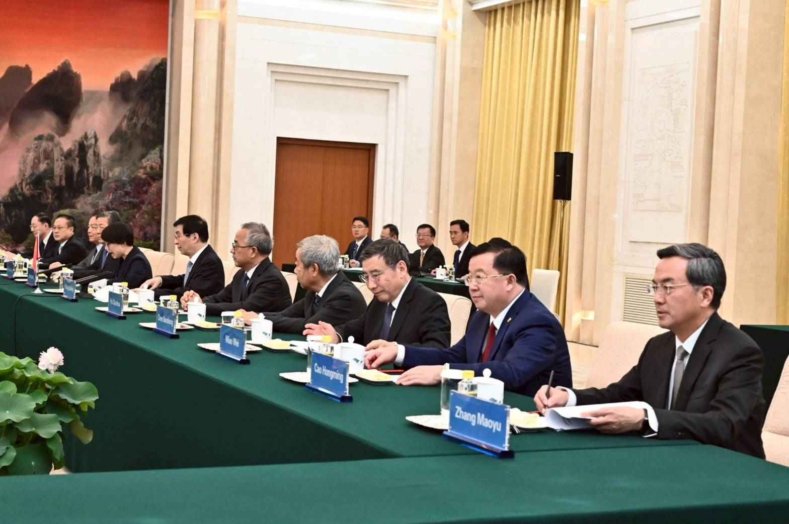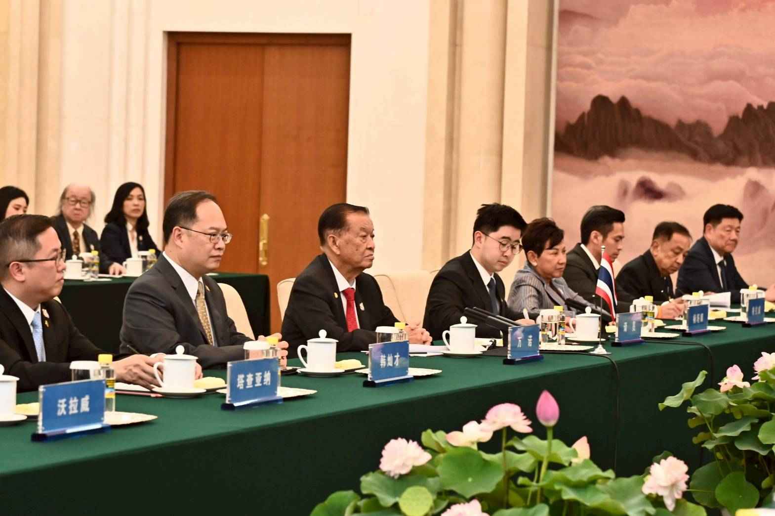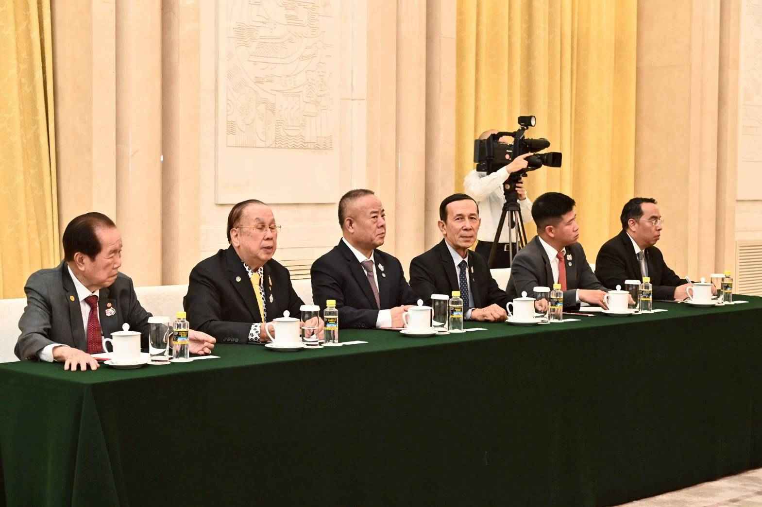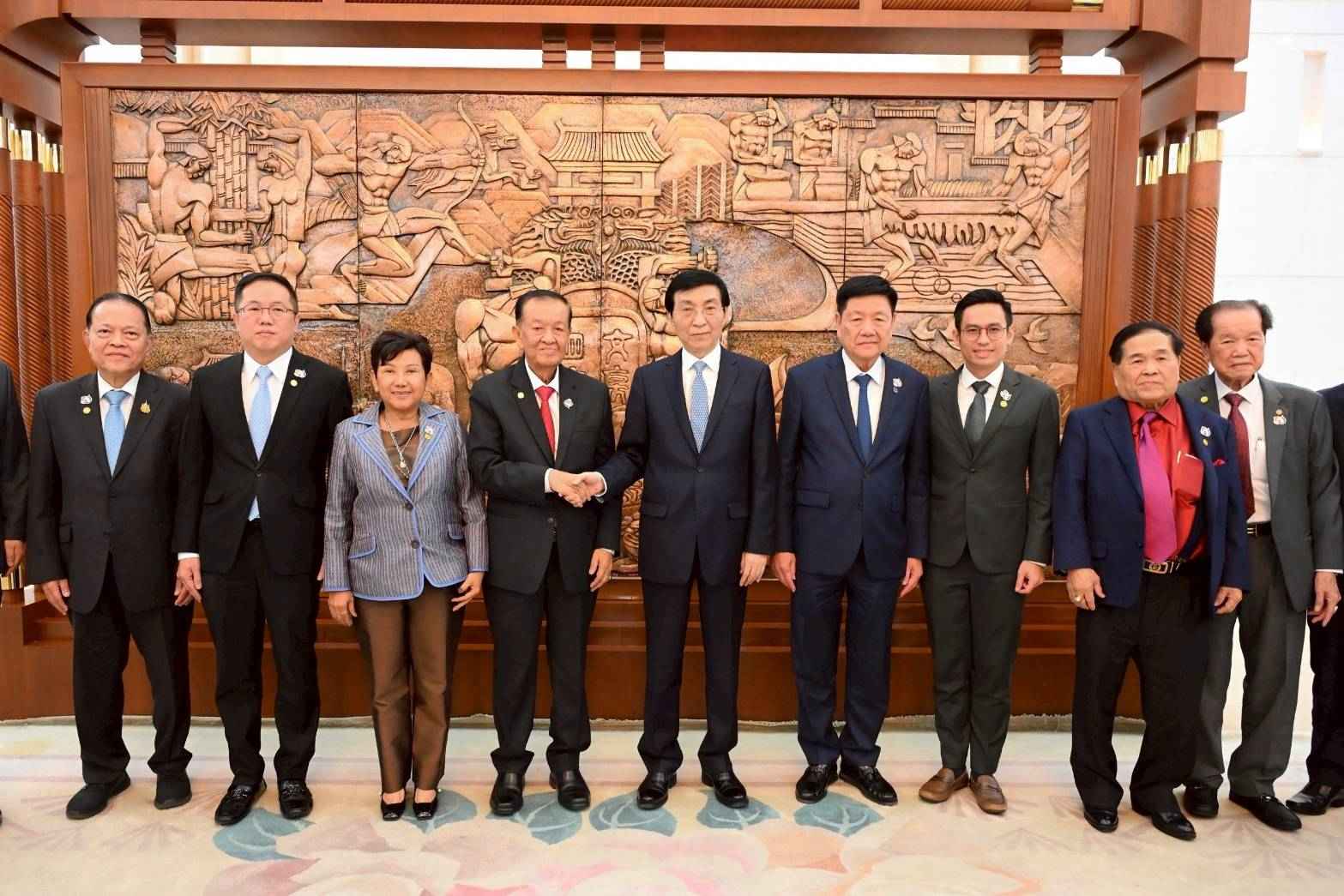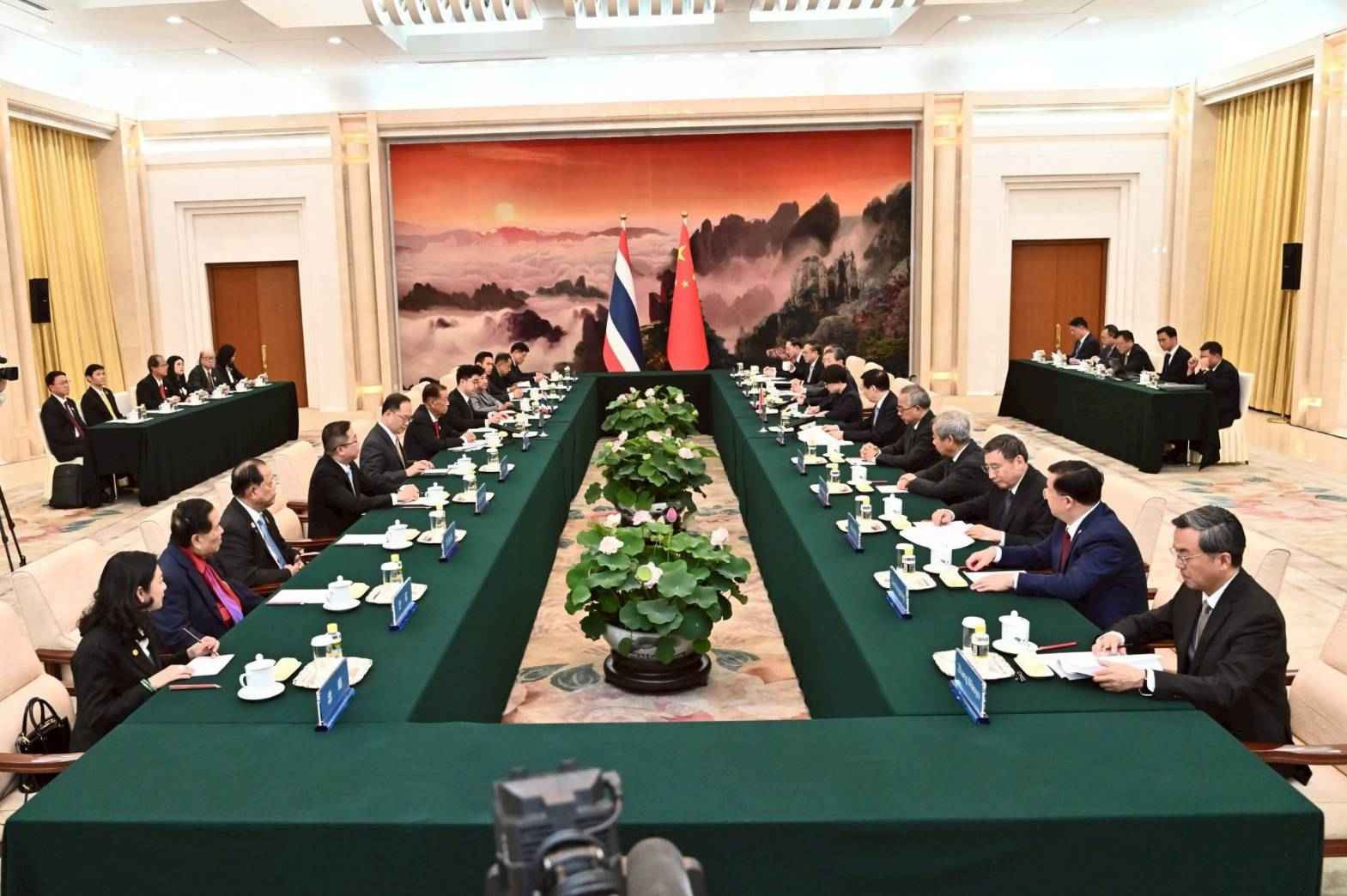 โดย ประธานรัฐสภาและประธานสภาผู้แทนราษฎร ได้กล่าวขอบคุณที่ให้การต้อนรับอย่างดียิ่ง และกล่าวชื่นชมประธานสภาที่ปรึกษาฯ ว่าเป็นผู้มีความรู้ความสามารถ ดำรงตำแหน่งสมาชิกถาวรกรมการเมือง (โปลิตบูโร) มานานกว่า 10 ปี และเป็นมันสมองให้แก่ประธานาธิบดีจีนถึง 3 คน นอกจากนี้ ยังเคยเป็นคณบดีและอาจารย์ในมหาวิทยาลัยอีกด้วย การมาเยือนจีนครั้งนี้ถือเป็นครั้งที่ 2 ซึ่งเมื่อปี 2541 เคยเดินทางมาเยือนแล้วเป็นครั้งแรก ได้รับการต้อนรับอย่างดีจากนายเจียง เจ๋อหมิน ประธานาธิบดี (ในขณะนั้น) และนายหลี่ เผิง ประธานสภาประชาชนแห่งชาติจีน (ในขณะนั้น) การแลกเปลี่ยนการเยือนของผู้นำระดับสูงมีมาอย่างสม่ำเสมอ อาทิ ฝ่ายจีน นายสี จิ้นผิง ประธานาธิบดีจีน เคยเดินทางไปเยือนไทยหลายครั้ง ส่วนฝ่ายไทย สมเด็จพระกนิษฐาธิราชเจ้า กรมสมเด็จพระเทพรัตนราชสุดาฯ สยามบรมราชกุมารี เสด็จฯ เยือนจีนมากถึง 55 ครั้ง นายกรัฐมนตรีหลายท่าน เคยเดินทางมาเยือนและประชุมที่จีนเช่นเดียวกัน และในวันที่ 30 มิถุนายน 2568 สถานเอกอัครราชทูตจีนประจำประเทศไทยมีกำหนดจัดงานเฉลิมฉลองความสัมพันธ์ทางการทูต ณ ศูนย์ประชุมแห่งชาติสิริกิติ์อีกด้วย ความสัมพันธ์ด้านรัฐสภา ในเดือนกรกฎาคม 2568 กลุ่มมิตรภาพสมาชิกรัฐสภาไทย-จีน จะเดินทางมาเยือนจีน ความสัมพันธ์ด้านเศรษฐกิจ มูลค่าการค้าระหว่างกันในปี 2567 มีจำนวนกว่า 1 แสนล้านเหรียญสหรัฐฯ นักลงทุนจากจีนมาลงทุนในไทยเป็นอันดับ 3 ของนักลงทุนต่างชาติ ด้านการท่องเที่ยว นักท่องเที่ยวจีนเดินทางไปท่องเที่ยวที่ประเทศไทยมากเป็นอันดับ 1 ของจำนวนนักท่องเที่ยวต่างชาติ ด้านการคมนาคม ทั้งสองประเทศมีโครงการรถไฟความเร็วสูง ซึ่งจะแล้วเสร็จในอีกประมาณ 2 - 3 ปีข้างหน้า ทำให้การไปมาหาสู่สะดวกมากยิ่งขึ้น ด้านการศึกษา จีนมาเปิดสถาบันขงจื๊อในไทยมากถึง 16 แห่ง และได้ส่งครูอาสาสมัครมาสอนภาษาจีนที่ประเทศไทยจำนวนมาก สำหรับการปราบปรามการพนันออนไลน์และมิจฉาชีพที่เกี่ยวกับคอลเซ็นเตอร์ ได้รับความร่วมมืออย่างดีจากฝ่ายจีน และกล่าวชื่นชมนโยบายแก้ไขปัญหาความยากจนที่สำเร็จได้ภายในระยะเวลาอันสั้น พร้อมฝากความปรารถนาดีไปยังนายสี จิ้นผิง ประธานาธิบดีจีน