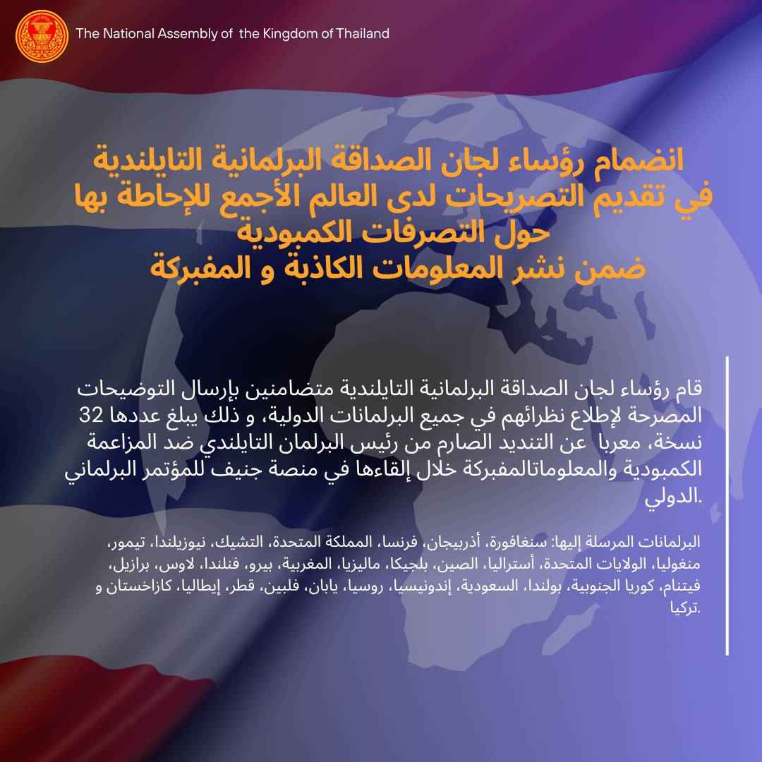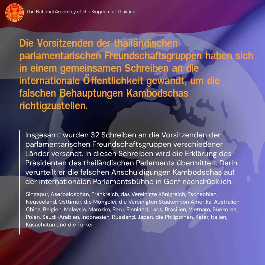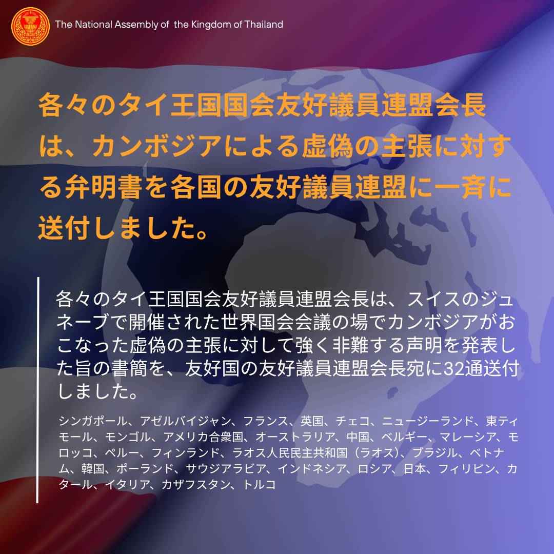 ประธานกลุ่มมิตรภาพสมาชิกรัฐสภาไทยระหว่างประเทศ ได้ส่งหนังสือจำนวน 32 ฉบับถึงประธานกลุ่มมิตรภาพรัฐสภาประเทศต่างๆ เพื่อแจ้งแถลงการณ์ของประธานรัฐสภาไทยประณามการกล่าวอ้างเท็จของประเทศกัมพูชาบนเวทีสหภาพรัฐสภา (Inter-Parliamentary Union: IPU) ซึ่งจัดขึ้น ณ นครเจนีวา สมาพันธรัฐสวิส สำหรับรายชื่อประเทศที่ได้รับหนังสือประกอบด้วย สิงคโปร์, อาเซอร์ไบจาน, ฝรั่งเศส, สหราชอาณาจักร, สาธารณรัฐเช็ก, นิวซีแลนด์, ติมอร์-เลสเต, มองโกเลีย, สหรัฐอเมริกา, ออสเตรเลีย, จีน, เบลเยียม, มาเลเซีย, โมร็อกโก, เปรู, ฟินแลนด์, สปป.ลาว, บราซิล, เวียดนาม, เกาหลีใต้, โปแลนด์, ซาอุดีอาระเบีย, อินโดนีเซีย, รัสเซีย, ญี่ปุ่น, ฟิลิปปินส์, กาตาร์, อิตาลี, คาซัคสถาน และตุรกี