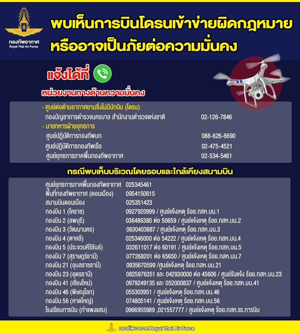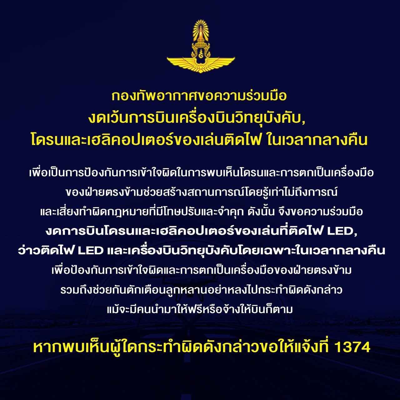 กองทัพอากาศแจ้งข้อมูลต่อสื่อมวลชน เผยแพร่ข้อมูลสู่สาธารณะ ในการขอความร่วมมืองดเว้นการบินเครื่องบินวิทยุบังคับ โดรนและเฮลิคอปเตอร์ของเล่นติดไฟในเวลากลางคืน เนื่องจากปัจจุบันมีการระงับการบินโดรนแต่ยังมีการพบเห็นโดรนบินอยู่ในหลายพื้นที่ในเวลากลางคืน ซึ่งมีการตรวจพบว่าเป็นโดรนและเฮลิคอปเตอร์ของเล่นติดไฟ LED ซึ่งอาจทำให้เข้าใจผิดกับผู้พบเห็น ทั้งนี้ อาจเกิดจากความเข้าใจผิด หรือกลุ่มผู้ไม่หวังดีสร้างสถานการณ์ของฝ่ายตรงข้าม ดังนั้น เพื่อเป็นการป้องกันการเข้าใจผิดในการพบเห็นโดรนและการตกเป็นเครื่องมือของฝ่ายตรงข้ามช่วยสร้างสถานการณ์โดยรู้เท่าไม่ถึงการณ์ และเสี่ยงทำผิดกฎหมายที่มีโทษปรับและจำคุก กองทัพอากาศจึงขอความร่วมมืองดการบินโดรนและเฮลิคอปเตอร์ของเล่นที่ติดไฟ LED ว่าวติดไฟ LED และเครื่องบินวิทยุบังคับโดยเฉพาะในเวลากลางคืนเพื่อป้องกันการเข้าใจผิดและการตกเป็นเครื่องมือของฝ่ายตรงข้าม รวมถึงช่วยกันตักเตือนลูกหลานอย่าหลงไปกระทำผิดดังกล่าวแม้จะมีคนนำมาให้ฟรีหรือจ้างให้บินก็ตาม ตลอดจนหากพบเห็นผู้ใดกระทำผิดดังกล่าวขอให้แจ้งที่ 1374