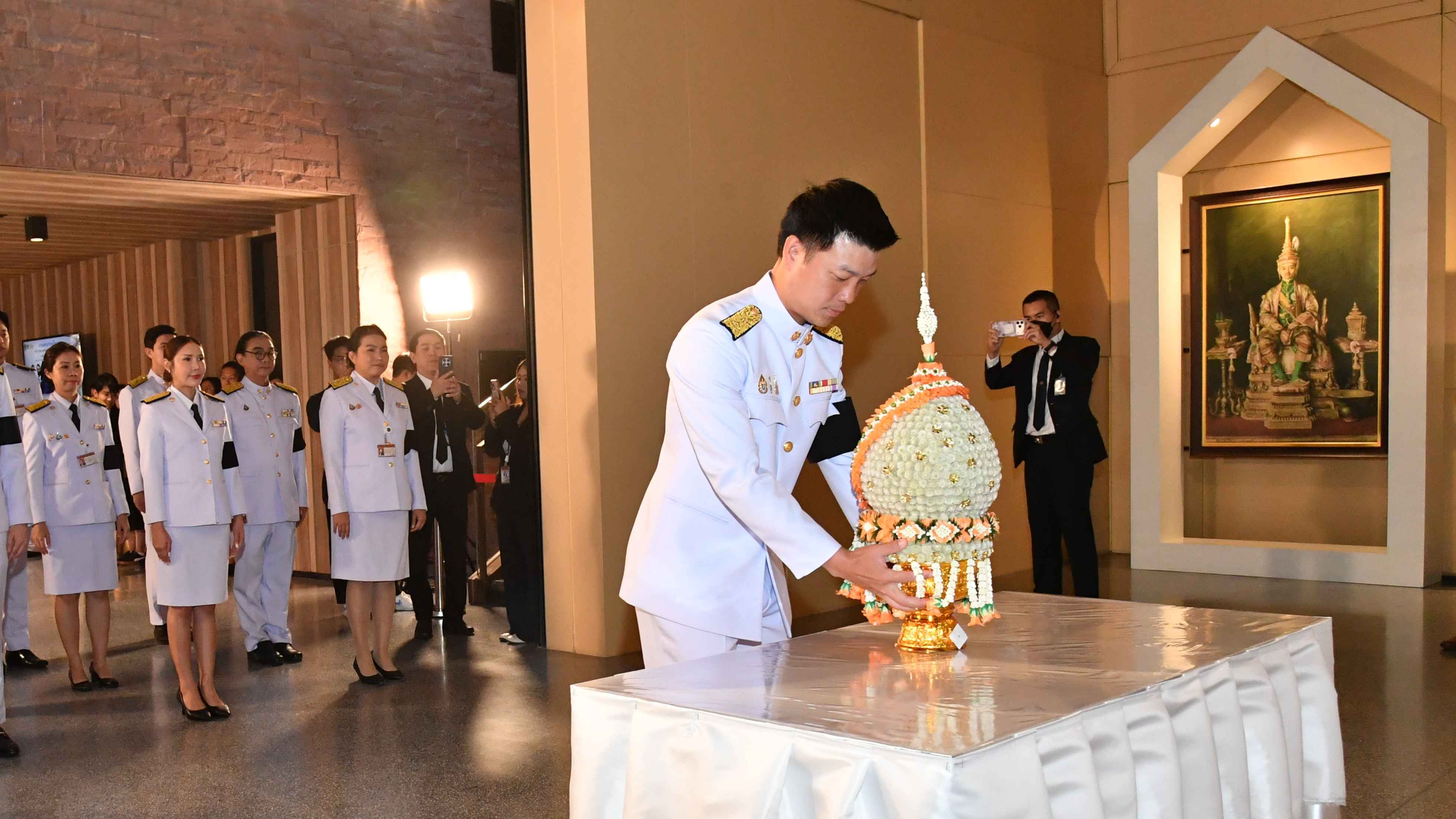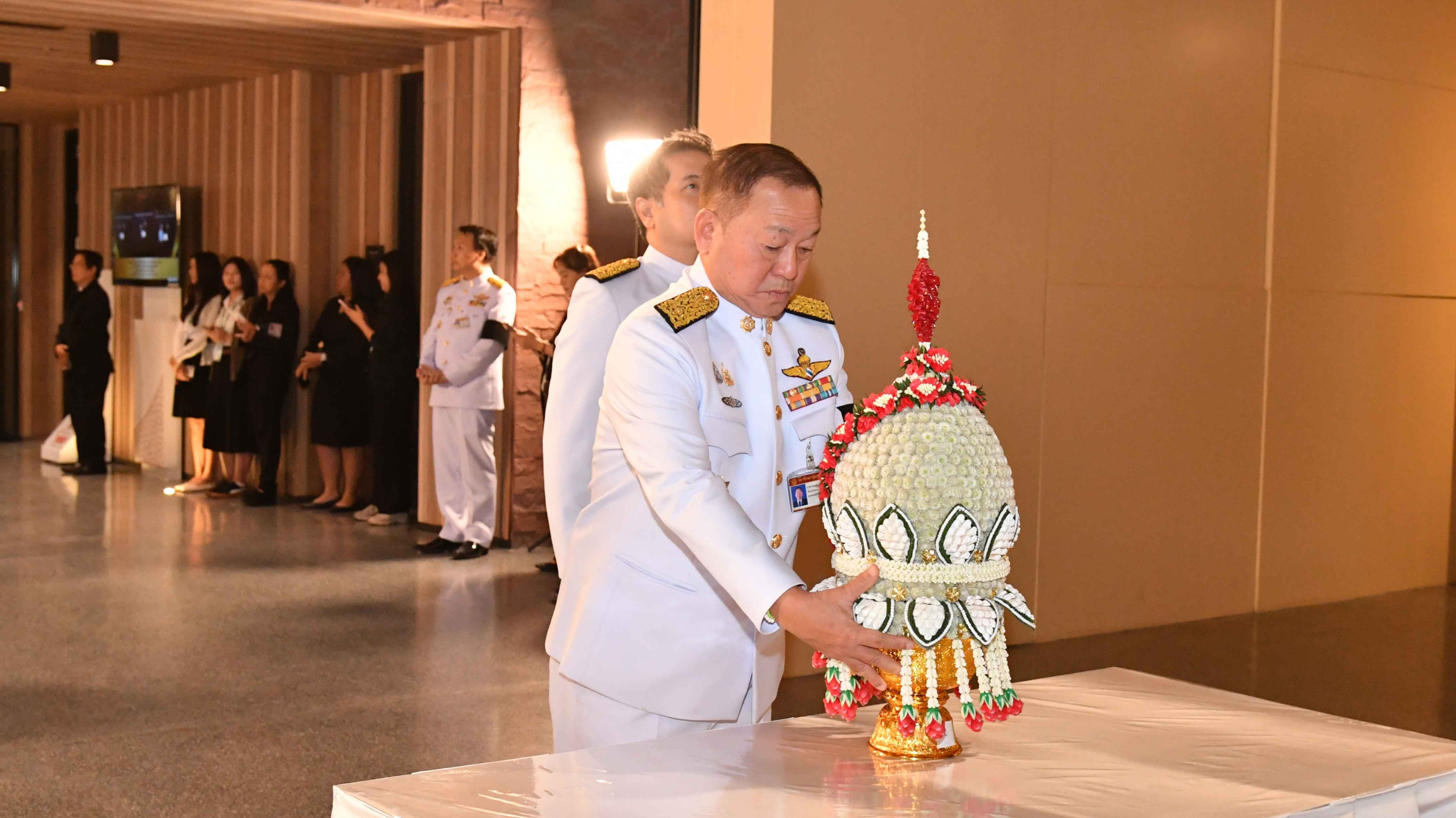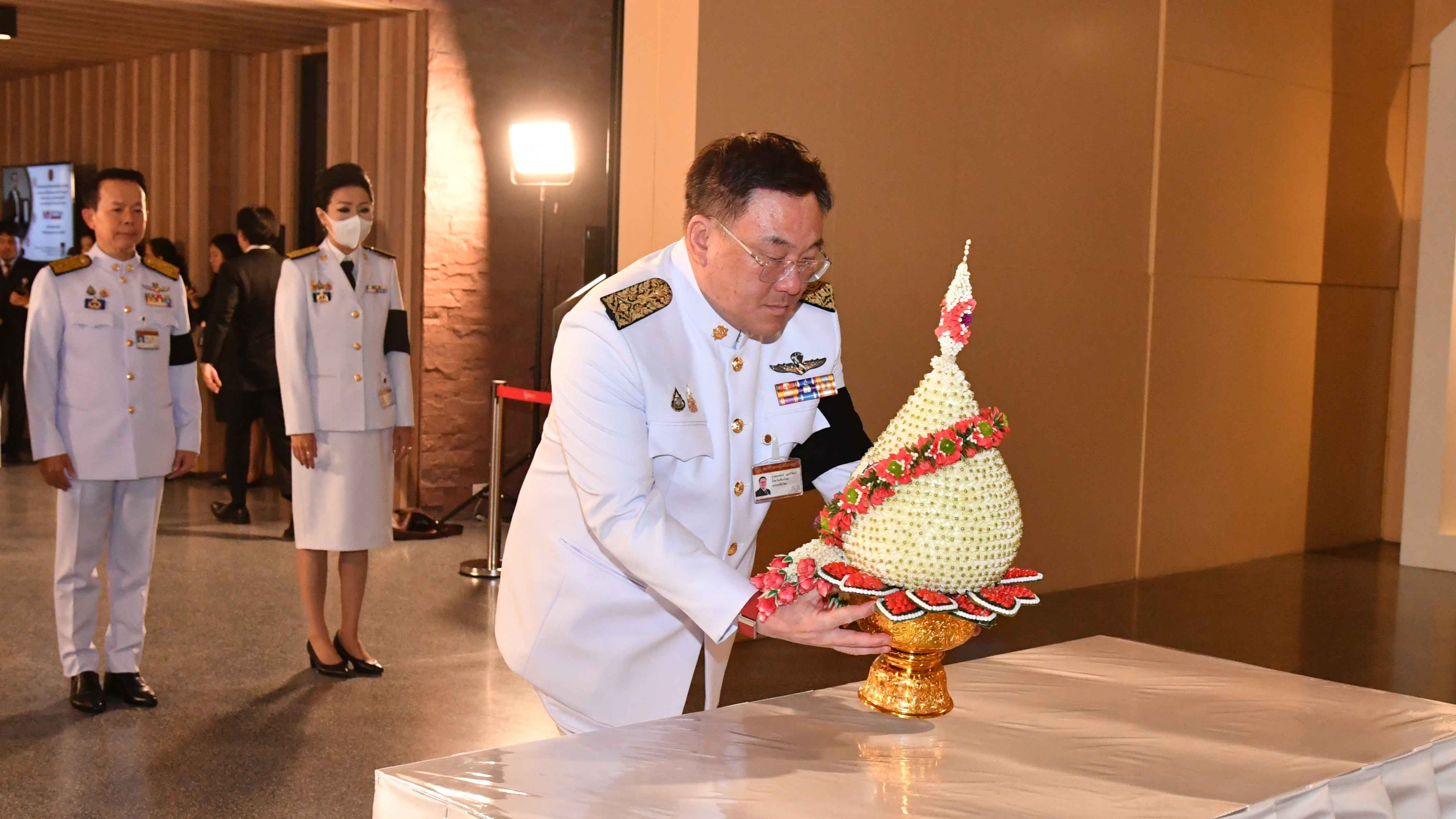 ขณะที่ รองศาสตราจารย์ ดร.อิสระ เสรีวัฒนวุฒิ เลขาธิการสถาบันพระปกเกล้า วางพานประดับพุ่มดอกไม้ถวายบังคมพระบรมราชานุสาวรีย์พระบาทสมเด็จพระปกเกล้าเจ้าอยู่หัว ในนาม “สถาบันพระปกเกล้า”