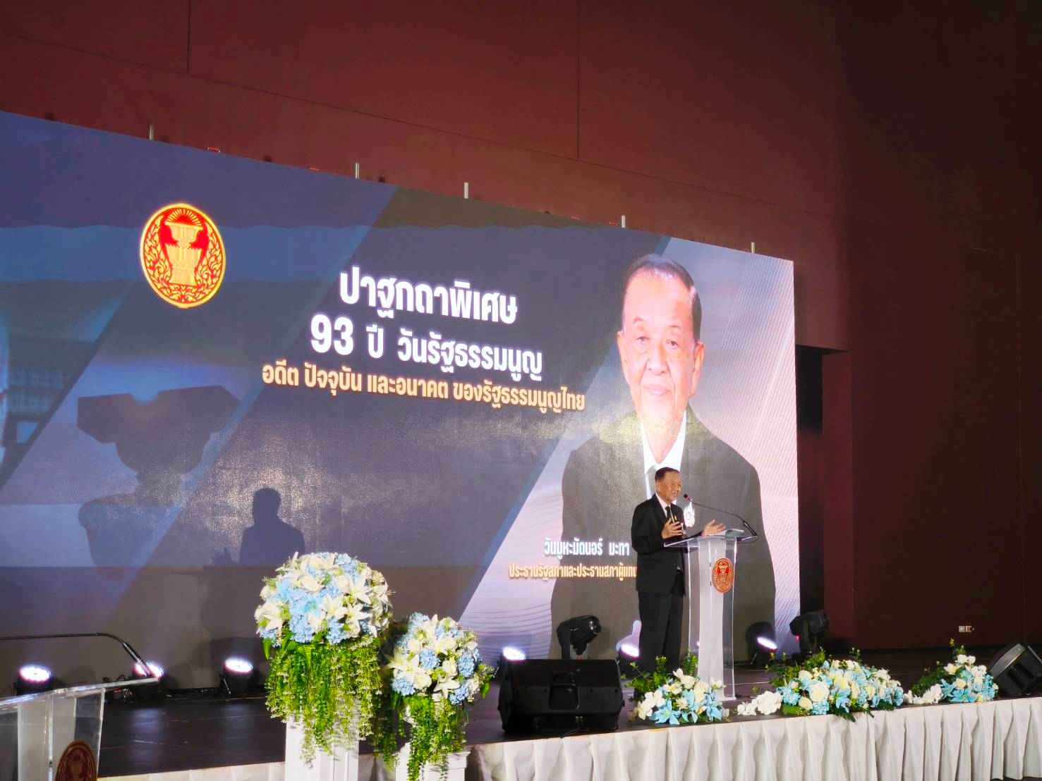 ประธานรัฐสภากล่าวปาฐกถาพิเศษ 93 ปี วันรัฐธรรมนูญ อดีต ปัจจุบัน และอนาคตของรัฐธรรมนูญไทย โดยชี้ว่า ในช่วงกว่า 93 ปีที่ผ่านมา ประเทศไทยมีรัฐธรรมนูญมากกว่า 20 ฉบับ ส่วนใหญ่เกิดขึ้นหลังการรัฐประหาร ส่งผลให้รัฐธรรมนูญขาดความต่อเนื่องและไม่อาจเป็นหลักประกันสิทธิและเสถียรภาพทางการเมืองได้อย่างแท้จริง พร้อมกันนี้ ประธานรัฐสภากล่าวให้เห็นภาพเปรียบเทียบว่า หากรัฐธรรมนูญเปรียบเสมือนมนุษย์คนหนึ่ง อายุ 93 ปี ถือว่าอยู่ในวัยชรา แต่ยังคงถูกทำร้ายซ้ำแล้วซ้ำเล่า ถูกฉีก ถูกยกเลิก และถูกเขียนขึ้นใหม่หลายครั้ง ทั้งที่ความผิดพลาดไม่ได้อยู่ที่ตัวบทกฎหมาย แต่อยู่ที่ผู้ใช้อำนาจไม่เคารพกติกาและไม่ยึดโยงกับประชาชน