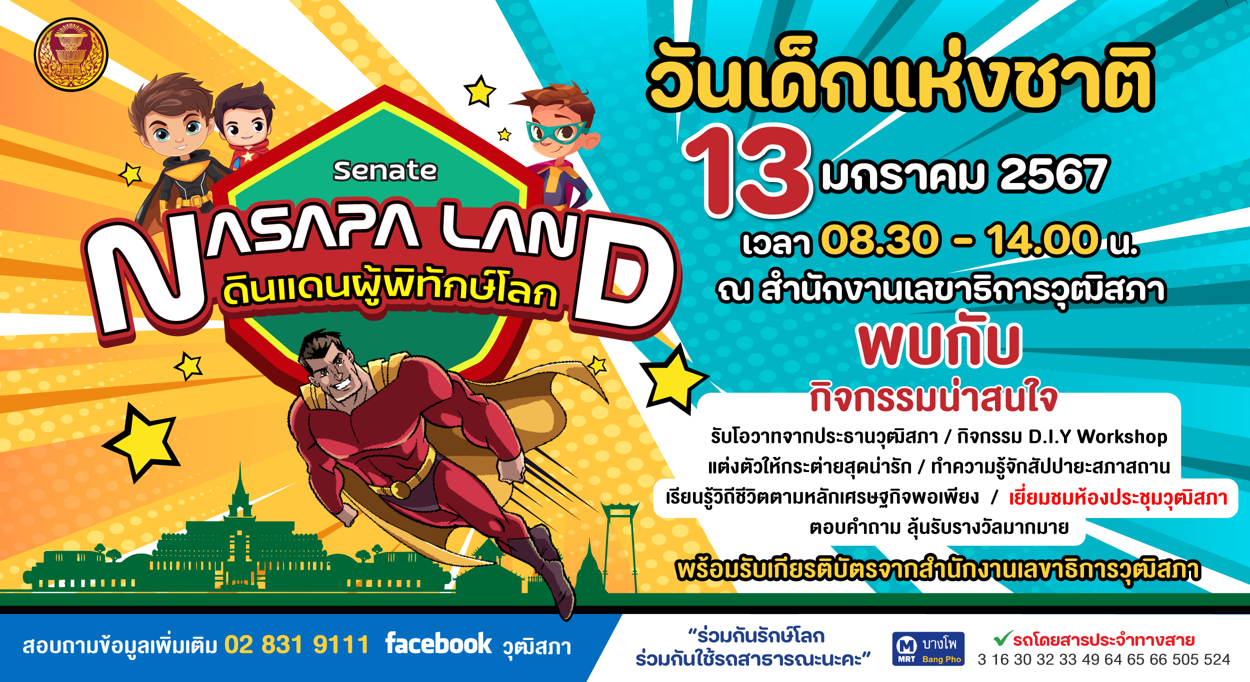 นอกจากนี้ มีกิจกรรมที่สำนักงานเลขาธิการวุฒิสภาจัดขึ้นภายใต้ชื่อ Senate NASAPA LAND ดินแดนผู้พิทักษ์โลก จัดขึ้นบริเวณอาคารรัฐสภา ฝั่งวุฒิสภา ตั้งแต่เวลา 09.00 น. – 14.00 น. โดยศาสตราจารย์พิเศษพรเพชร วิชิตชลชัย ประธานวุฒิสภา จะเป็นประธานในพิธีเปิด พร้อมกล่าวให้โอวาทแก่เด็กและเยาวชน โดยน้อง ๆ ที่เข้าร่วมงานจะได้ร่วมกิจกรรมจิตอาสาเพื่อสังคม ได้รับสมุด ชุดเครื่องเขียนพระราชทาน และเข็มกลัดยุวชนจิตอาสา ได้ทำความรู้จักสัปปายะสภาสถาน เยี่ยมชมห้องประชุมวุฒิสภา ร่วมถ่ายภาพกับบัลลังก์ประธานรัฐสภา กิจกรรม D.I.Y Workshop แต่งตัวให้กระต่ายสุดน่ารัก เรียนรู้วิถีชีวิตตามหลักเศรษฐกิจพอเพียง และตอบคำถามลุ้นรับรางวัลมากมายตลอดทั้งวัน นอกจากนี้น้อง ๆ ที่เข้าร่วมงานจะได้รับเกียรติบัตรจากสำนักงานเลขาธิการวุฒิสภาด้วย