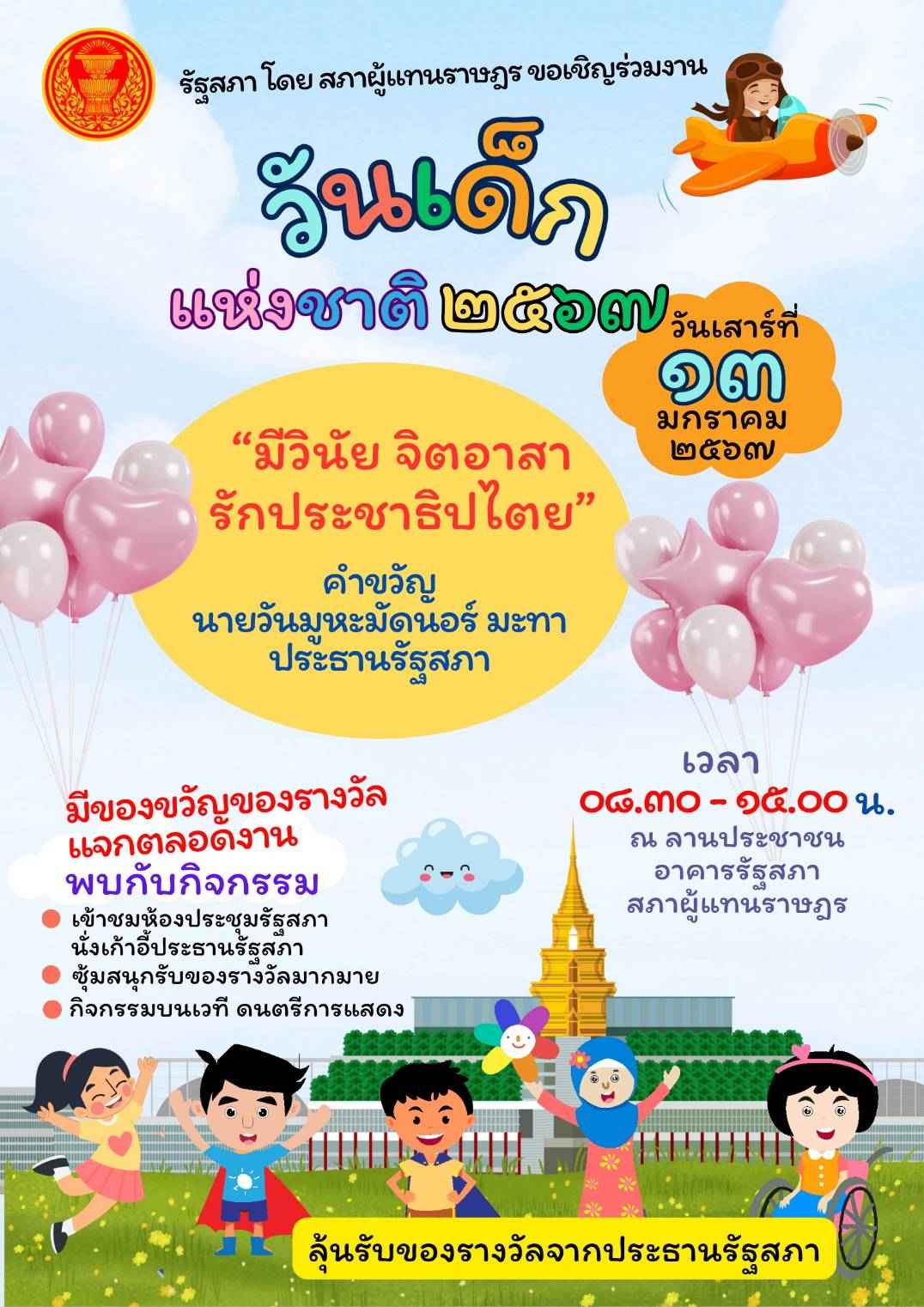 รัฐสภา ขอเชิญชวนผู้ปกครองพาบุตรหลานร่วมงานวันเด็กแห่งชาติ ประจำปี 2567 ที่อาคารรัฐสภา ในวันเสาร์ ที่ 13 ม.ค. นี้ ตั้งแต่เวลา 08.30 – 15.00 น. ร่วมเปิดโลกแห่งการเรียนรู้ตามคำขวัญที่ นายวันมูหะมัดนอร์ มะทา ประธานรัฐสภา และประธานสภาผู้แทนราษฎรมอบให้กับเด็กและเยาวชนไทยว่า มีวินัย จิตอาสา รักประชาธิปไตย โดยสำนักงานเลขาธิการสภาผู้แทนราษฎรจัดกิจกรรมให้เข้าชมห้องประชุมรัฐสภา นั่งเก้าอี้ประธานรัฐสภา รวมทั้งยังมีกิจกรรมเปิดพื้นที่ เปิดความคิดเพื่อเด็ก เยาวชน ร่วมสนุกกับกิจกรรมบนเวทีเสริมความรู้ด้านการเมืองการปกครอง ดนตรี การแสดง เกมส์เสริมความรู้ บริเวณลานประชาชน ลุ้นรับของขวัญจากประธานรัฐสภา และรางวัลอื่น ๆ อีกมากมายตลอดทั้งวัน