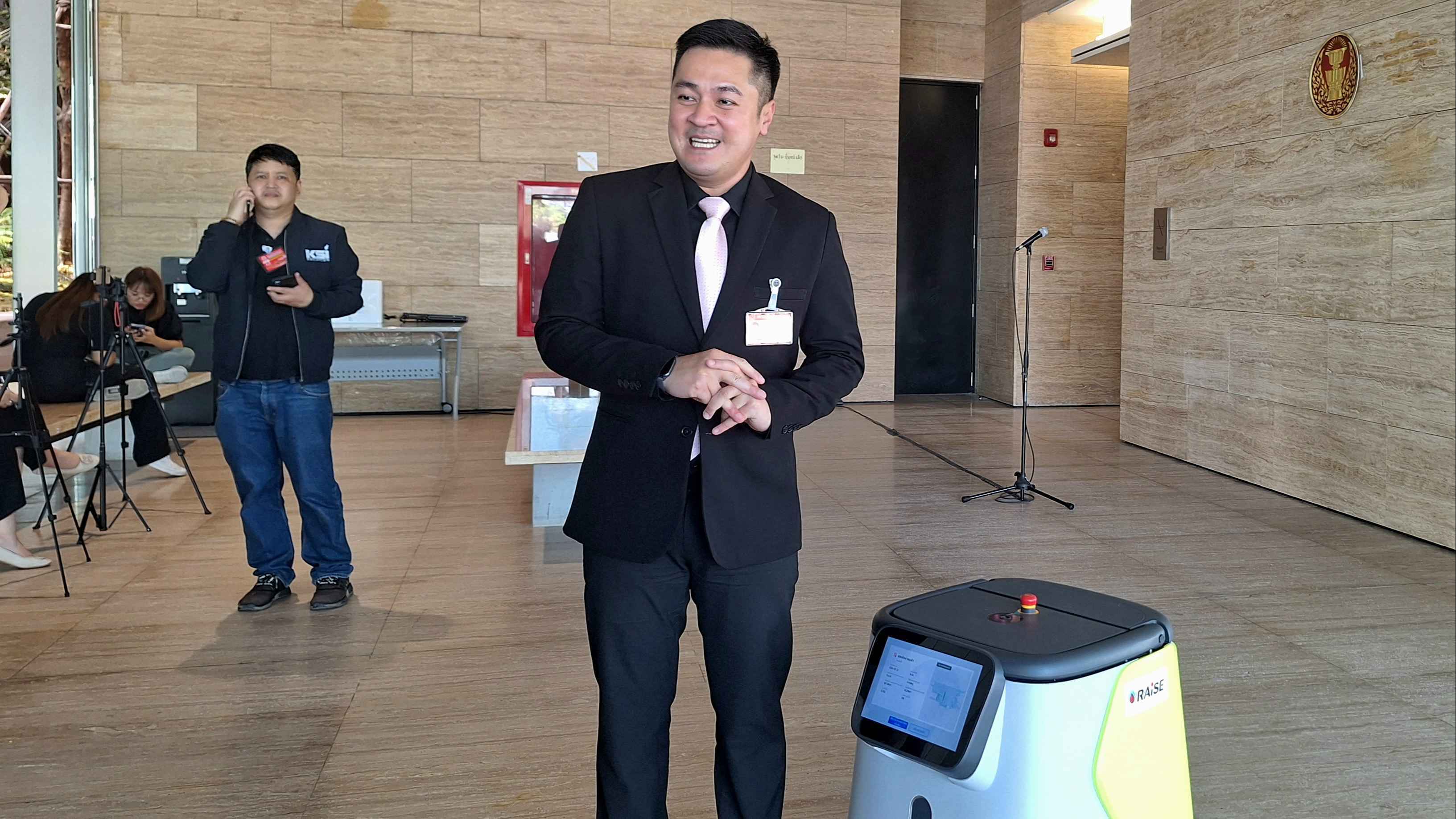 นายปดิพัทธ์ สันติภาดา รองประธานสภาผู้แทนราษฎร คนที่หนึ่ง สังเกตการณ์การทำงานของหุ่นยนต์ทำความสะอาดอัจฉริยะ บริเวณจุดรับยื่นหนังสือ ศาลาแก้ว ชั้น 1 อาคารรัฐสภา