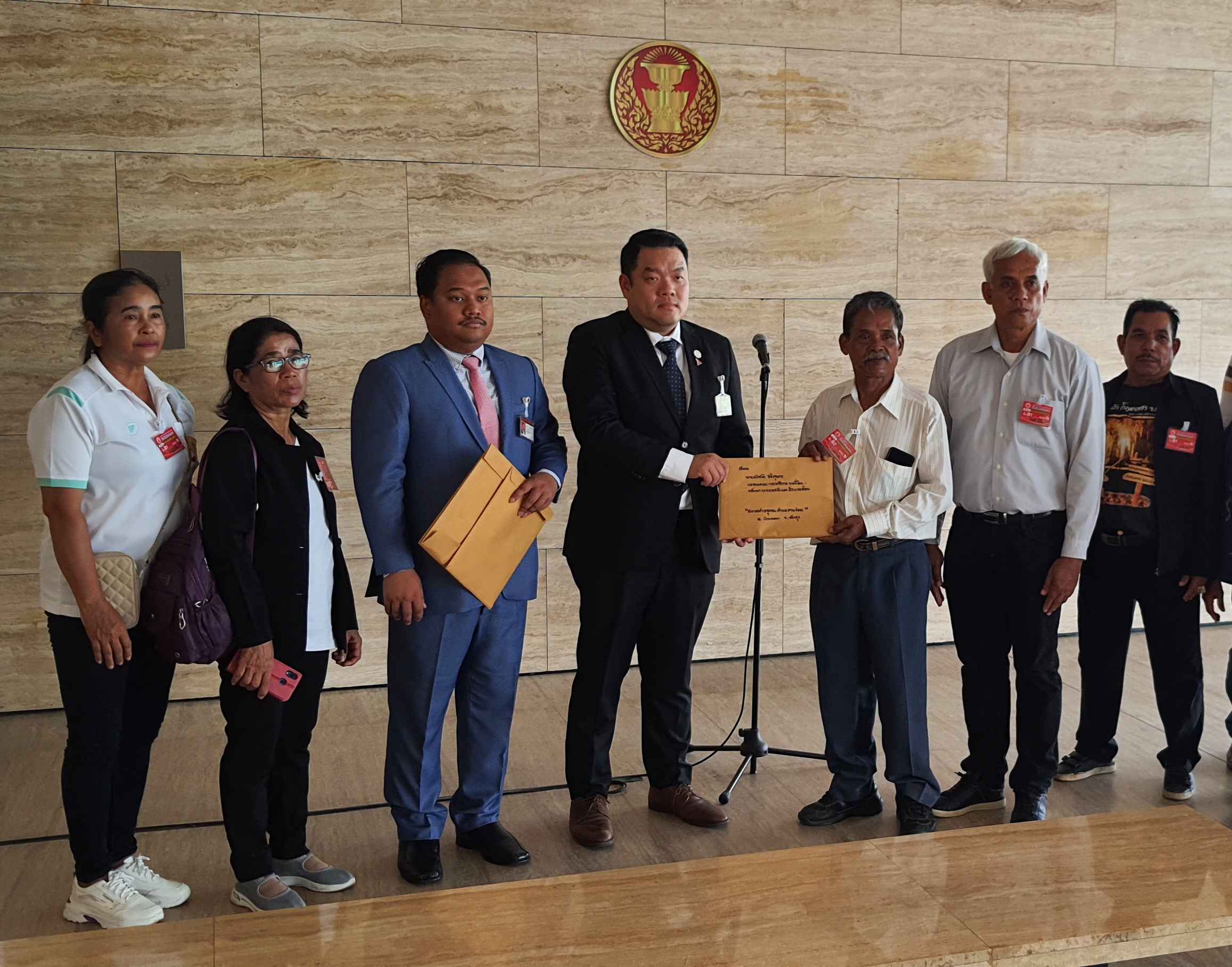 และเรื่องที่สอง คณะกรรมการกลุ่มสมานฉันท์เพื่อชาติ และเครือข่ายเกษตรก้าวหน้าชัยบุรีรักถิ่น จำนวน 250 ราย ในพื้นที่สวนปาล์มที่หมดสัญญาเช่า แปลงบริษัท พันศรี จำกัด แปลงป่าสงวนแห่งชาติป่าบ้านหมากและป่าปากพัง ท้องที่ตำบลไทรทอง ตำบลคลองน้อย และตำบลชัยบุรี อำเภอชัยบุรี จังหวัดสุราษฎร์ธานี จำนวนเนื้อที่ 4,100 ไร่ ขอให้ กมธ. พิจารณาแก้ปัญหาความเดือดร้อนของราษฎรผู้ยากไร้ ไม่มีที่ดินทำกิน หรือมีไม่พอทำกิน เพื่อนำไปสู่การแก้ปัญหาที่ยืดเยื้อมานานอย่างจริงจังและเป็นรูปธรรม