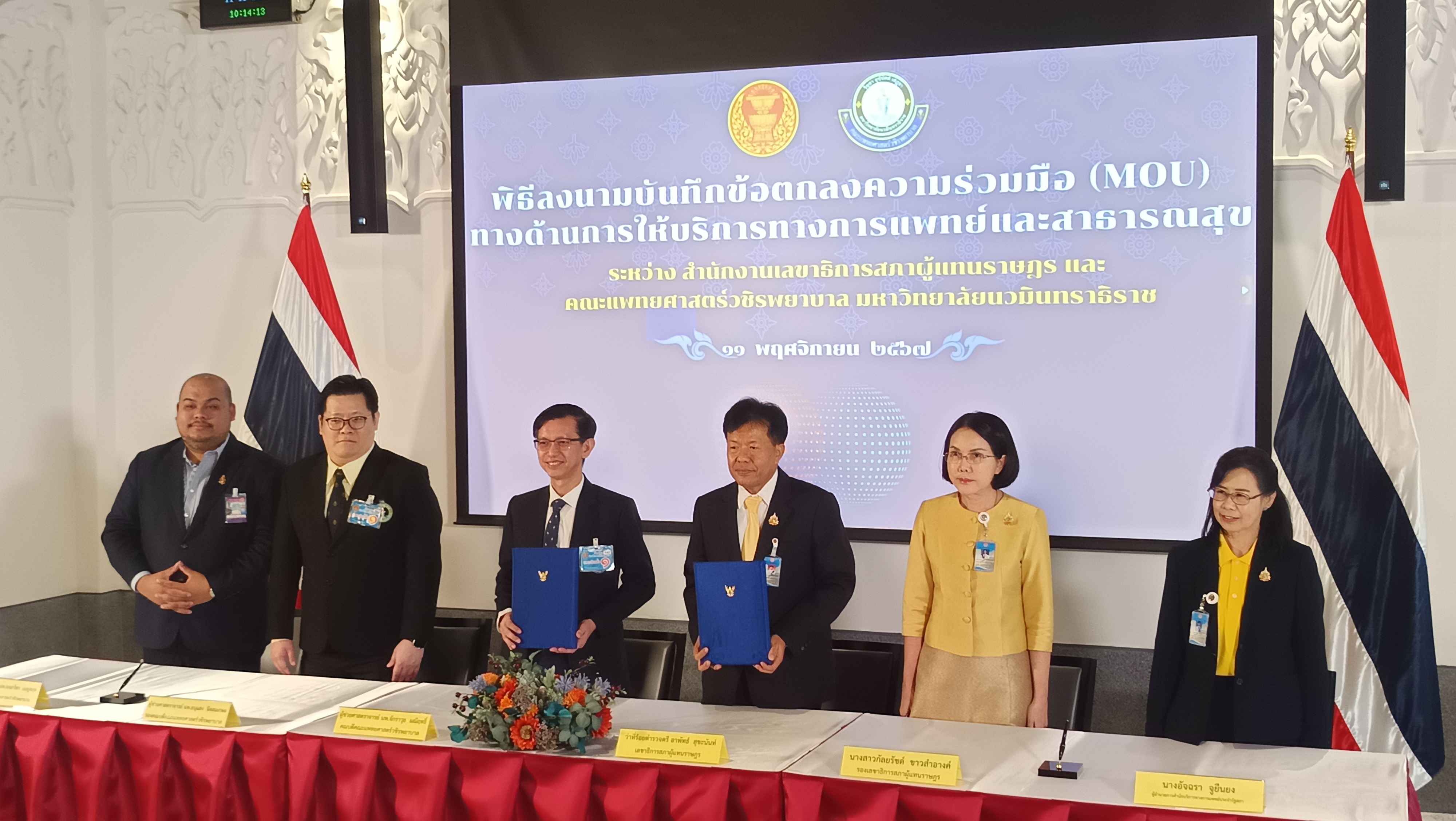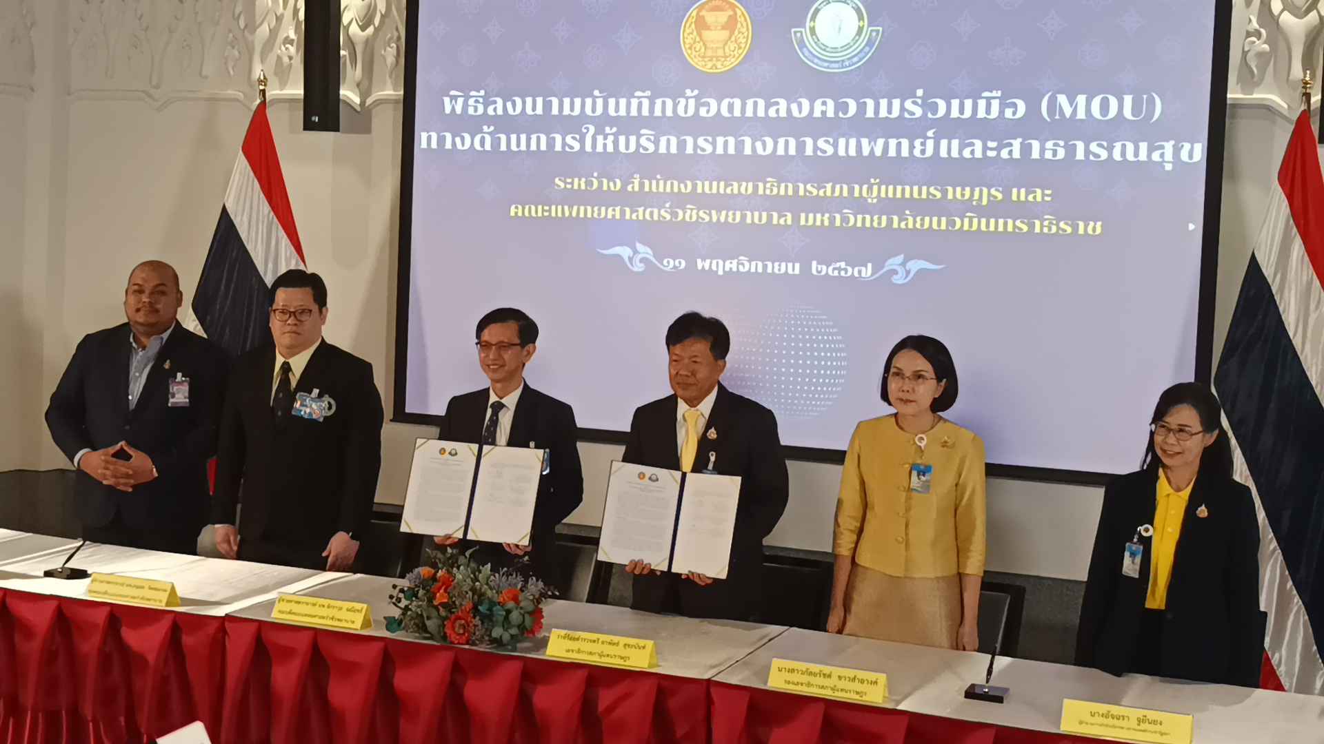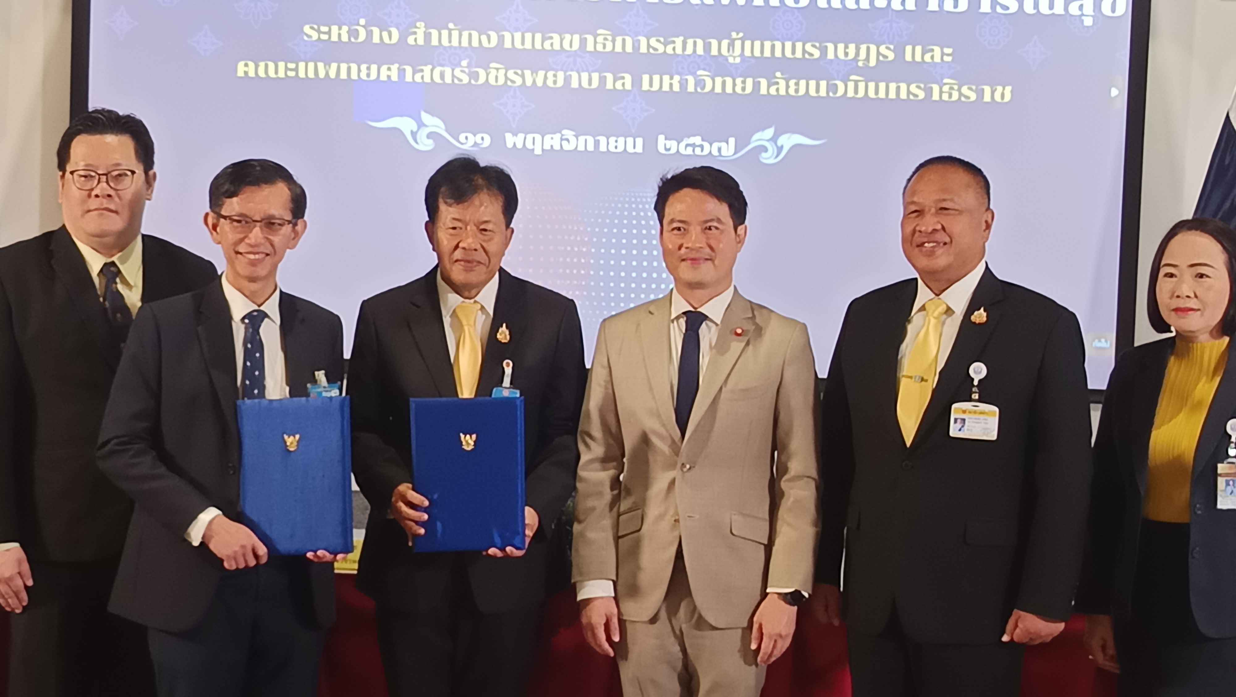 จากนั้น เป็นพิธีลงนามบันทึกข้อตกลงความร่วมมือทางการแพทย์และสาธารณสุข ระหว่าง สำนักงานเลขาธิการสภาผู้แทนราษฎร ประกอบด้วย ว่าที่ร้อยตำรวจตรี อาพัทธ์ สุขะนันท์ เลขาธิการสภาผู้แทนราษฎร ผศ.นพ.จักราวุธ มณีฤทธิ์ คณบดีคณะแพทยศาสตร์วิชิรพยาบาล มหาวิทยาลัยนวมินทราธิราช นางสาวกัลยรัชต์ ขาวสำอางค์ รองเลขาธิการสภาผู้แทนราษฎร นางอัจฉรา จูยืนยง ผู้อำนวยการสำนักบริการทางการแพทย์ของรัฐสภา ผศ.นพ.อนุแสง จิตสมเกษม รองคณะบดีคณะแพทยศาสตร์วชิรพยาบาล และ ผศ.นพ.นนธวัชร เบญจกุล ผู้ช่วยคณะแพทยศาสตร์วชิรพยาบาล ลงนามเป็นสักขีพยาน