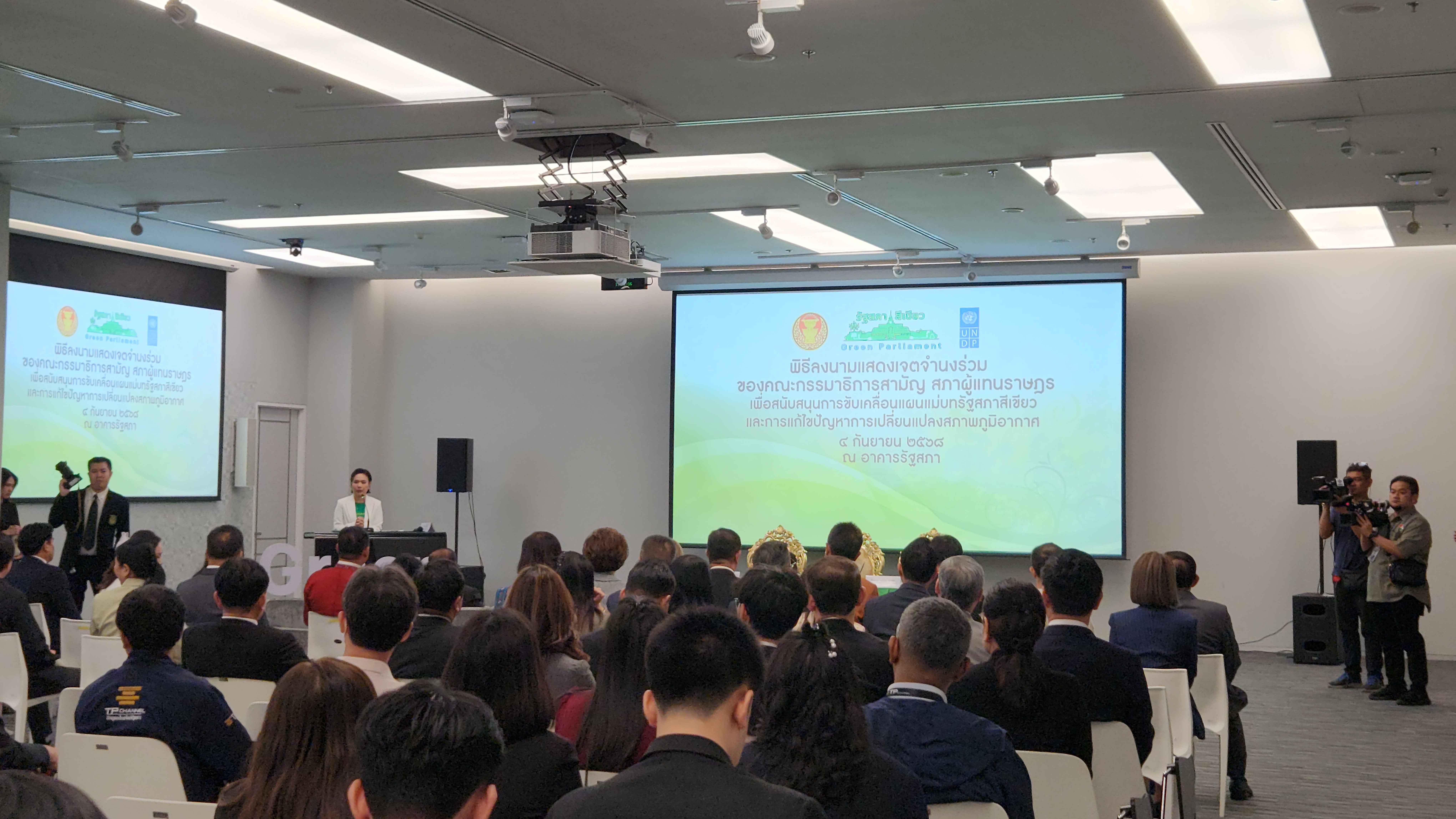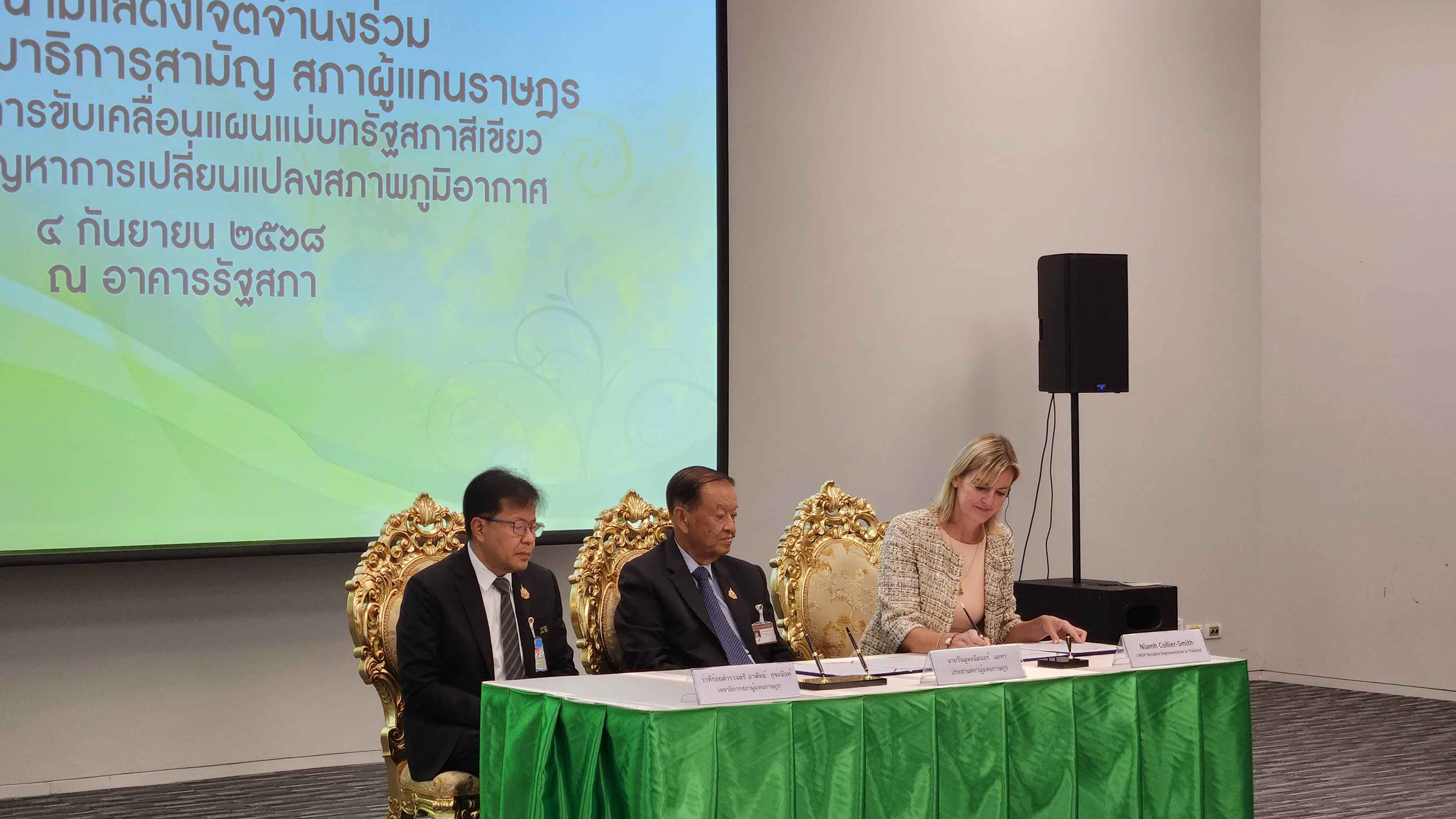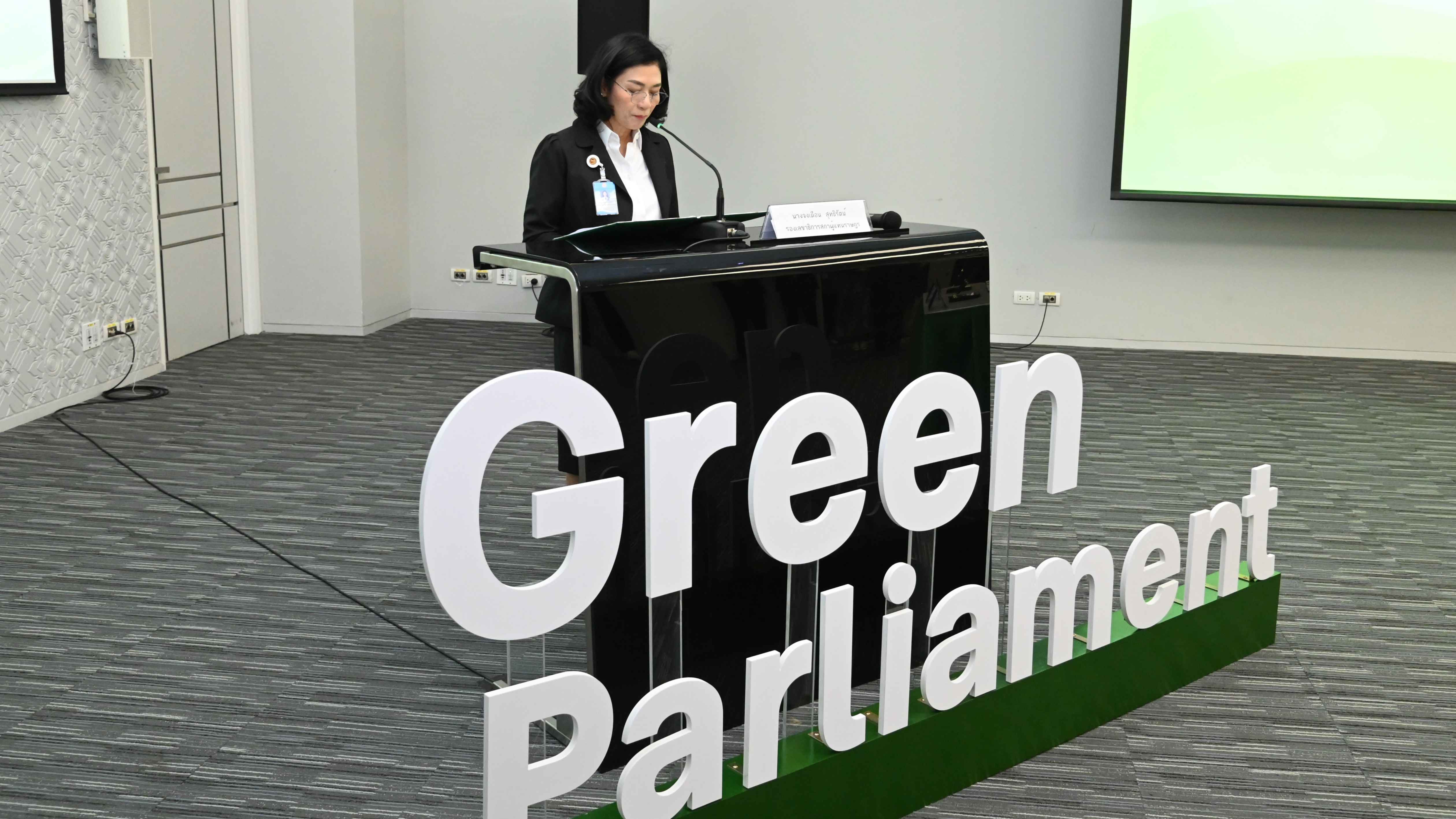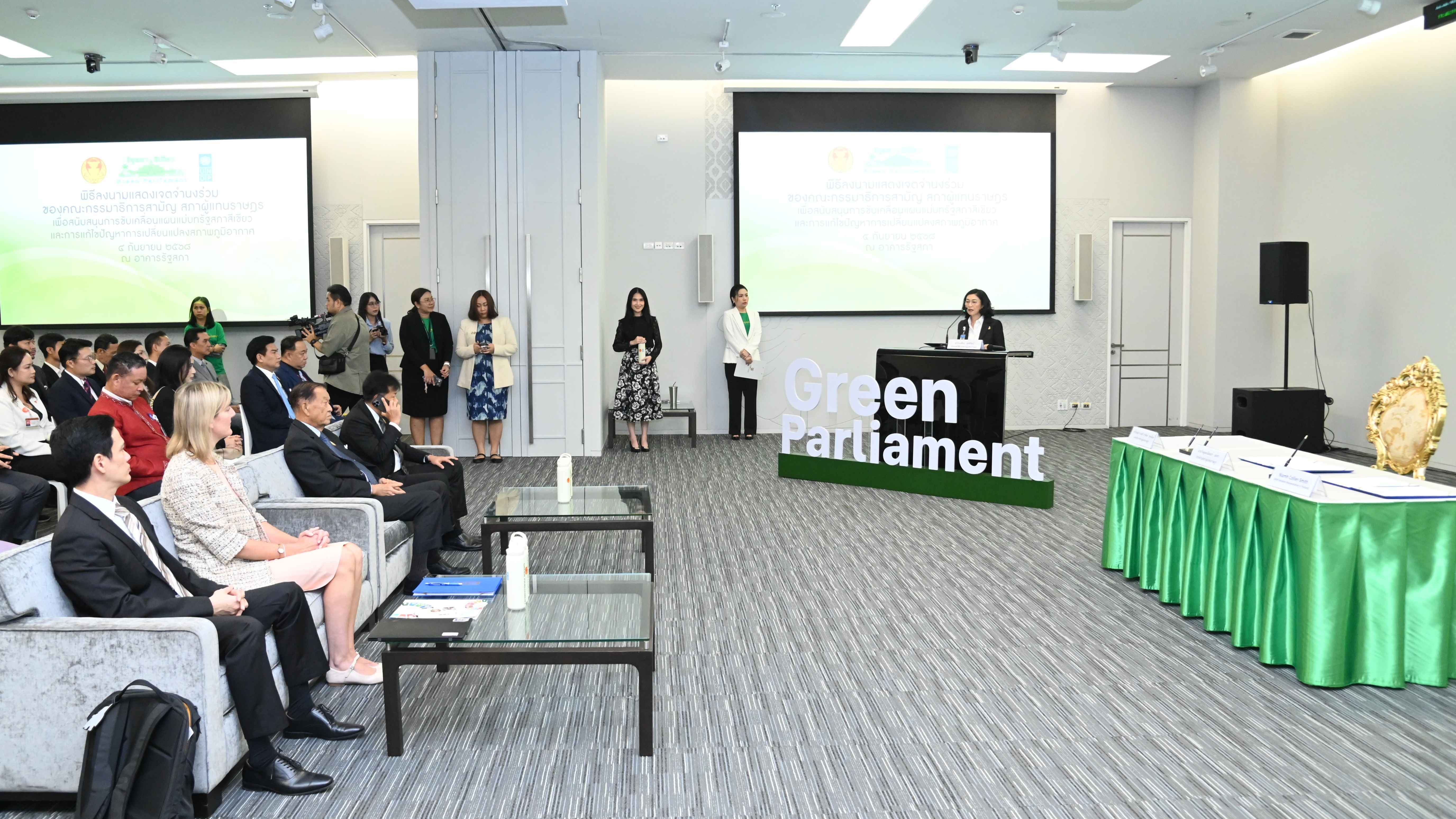 นางจงเดือน สุทธิรัตน์ รองเลขาธิการสภาผู้แทนราษฎร ในฐานะประธานคณะกรรมการขับเคลื่อนสำนักงานเลขาธิการสภาผู้แทนราษฎร สู่การเป็น Green Parliament กล่าวถึงวัตถุประสงค์ในการลงนามครั้งนี้ว่า ปัจจุบันปัญหาการเปลี่ยนแปลงสภาพภูมิอากาศและสิ่งแวดล้อมเป็นความท้าทายสำคัญของโลกที่ส่งผลกระทบต่อสิ่งแวดล้อม เศรษฐกิจ และคุณภาพชีวิตของประชาชน รัฐสภาในฐานะองค์กรนิติบัญญัติที่มีบทบาทสำคัญในการกำหนดนโยบายสาธารณะ กำกับดูแลและผลักดันเป้าหมายการพัฒนาที่ยั่งยืนจึงจำเป็นต้องเป็นต้นแบบของการเปลี่ยนแปลงสู่ความยั่งยืน ด้วยเหตุนี้สำนักงานเลขาธิการสภาผู้แทนราษฎร โดยคณะกรรมการขับเคลื่อนสำนักงานเลขาธิการสู่การเป็น Green Parliament ร่วมกับคณะกรรมาธิการสามัญ 35 คณะ และ UNDP จึงได้ร่วมกันจัดพิธีลงนามแสดงเจตจำนงร่วมเพื่อยืนยันความมุ่งมั่นในการสนับสนุนและผลักดันแผนแม่บทรัฐสภาสีเขียว พ.ศ. 2568 - 2575 ให้เกิดผลอย่างเป็นรูปธรรม การลงนามครั้งนี้มีเป้าหมายเพื่อเสริมสร้างความตระหนักรู้และความเข้าใจต่อปัญหาสภาพภูมิอากาศและสิ่งแวดล้อม ส่งเสริมการบริหารจัดการพลังงานและทรัพยากรอย่างมีประสิทธิภาพและยั่งยืน รวมทั้งสนับสนุนให้คณะกรรมาธิการดำเนินการใต้แนวคิดรัฐสภาสีเขียว นอกจากนี้ยังมุ่งส่งเสริมการลดการใช้พลาสติกแบบใช้ครั้งเดียว การใช้วัสดุที่เป็นมิตรกับสิ่งแวดล้อม เพื่อให้รัฐสภาไทยเป็นต้นแบบด้านการจัดการทรัพยากรที่มีประสิทธิภาพและเป็นมิตรต่อสิ่งแวดล้อม ความร่วมมือนี้จะดำเนินอย่างต่อเนื่องตามกรอบระยะเวลาของแผนแม่บท แม้จะไม่ก่อให้เกิดภาระผูกพันทางกฎหมาย แต่ก็สะท้อนถึงเจตจำนงร่วมของทุกฝ่ายให้ก้าวสู่การเป็น Green Parliament อย่างแท้จริง ตนเชื่อมั่นว่า การลงนามในวันนี้จะเป็นจุดเริ่มต้นสำคัญของการขับเคลื่อนรัฐสภาไทย ให้มีบทบาทเชิงรุกในการแก้ไขการเปลี่ยนแปลงทางสภาพภูมิอากาศและสิ่งแวดล้อมและเป็นแบบอย่างแห่งความยั่งยืนต่อสังคมไทยและประชาคมโลก