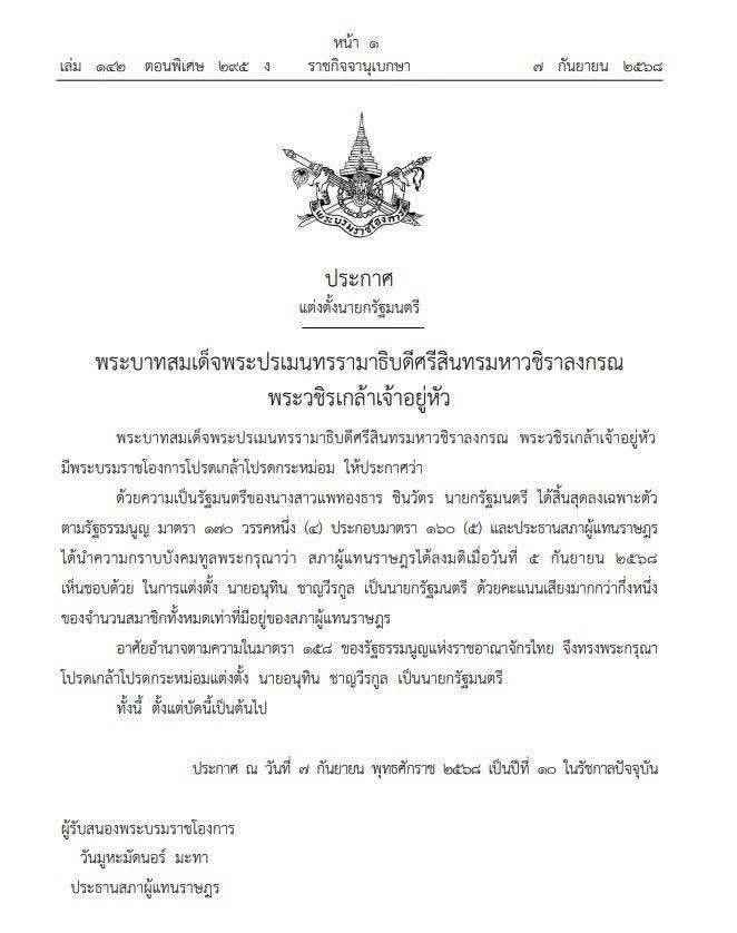 อาศัยอำนาจตามความในมาตรา 158 ของรัฐธรรมนูญแห่งราชอาณาจักรไทย จึงทรงพระกรุณาโปรดเกล้าโปรดกระหม่อมแต่งตั้ง นายอนุทิน ชาญวีรกูล เป็นนายกรัฐมนตรี ทั้งนี้ ตั้งแต่บัดนี้เป็นต้นไป ประกาศ ณ วันที่ 7 กันยายน พุทธศักราช 2568 เป็นปีที่ 10 ในรัชกาลปัจจุบัน ผู้รับสนองพระบรมราชโองการ นายวันมูหะมัดนอร์ มะทา ประธานสภาผู้แทนราษฎร
