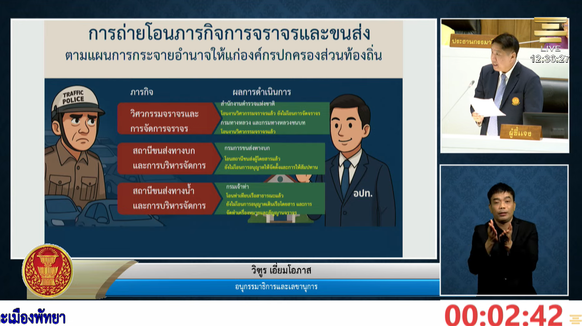 นายอภินันท์ เผือกผ่อง รองประธาน กมธ. กล่าวถึงการถ่ายโอนภารกิจให้กับ อปท. ตามพระราชบัญญัติ (พ.ร.บ.) กำหนดแผนและขั้นตอนการกระจายอำนาจฯ พ.ศ. 2542 และแผนปฏิบัติการฉบับที่ 1 (พ.ศ. 2544) และฉบับที่ 2 (พ.ศ. 2551) ว่า ตามกฎหมายได้กำหนดให้มีการถ่ายโอน 3 ภารกิจหลัก ที่สำคัญ ได้แก่ 1. ภารกิจด้านวิศวกรรมจราจร 2. ภารกิจในด้านการบริหารจัดการจราจร และ 3. ภารกิจด้านการขนส่งทางบกและทางน้ำ ซึ่งภารกิจดังกล่าวอยู่ภายใต้ความรับผิดชอบของ 5 หน่วยงาน ได้แก่ สำนักงานตำรวจแห่งชาติ กรมการขนส่งทางบก กรมทางหลวง กรมทางหลวงชนบท และกรมเจ้าท่า แม้จะมีความพยายามดำเนินการมา กว่า 20 ปี แต่การถ่ายโอนภารกิจกลับมีความล่าช้า และมีความคืบหน้าเพียงประมาณ 40% เท่านั้น โดยเฉพาะภารกิจการจัดการจราจรที่สำนักงานตำรวจแห่งชาติต้องถ่ายโอน และภารกิจการบริหารจัดการสถานีขนส่ง เช่น การพิจารณาสัมปทานเดินรถ ยังไม่มีการถ่ายโอน รวมถึงการอนุญาตเดินเรือโดยสารและการจัดทำสัญญาณจราจรทางน้ำที่ยังไม่ถ่ายโอนจากกรมเจ้าท่าให้ กทม. และเมืองพัทยา ความล่าช้าดังกล่าวส่งผลให้เกิดปัญหาด้านการจราจรและการขนส่งในพื้นที่ดังกล่าว