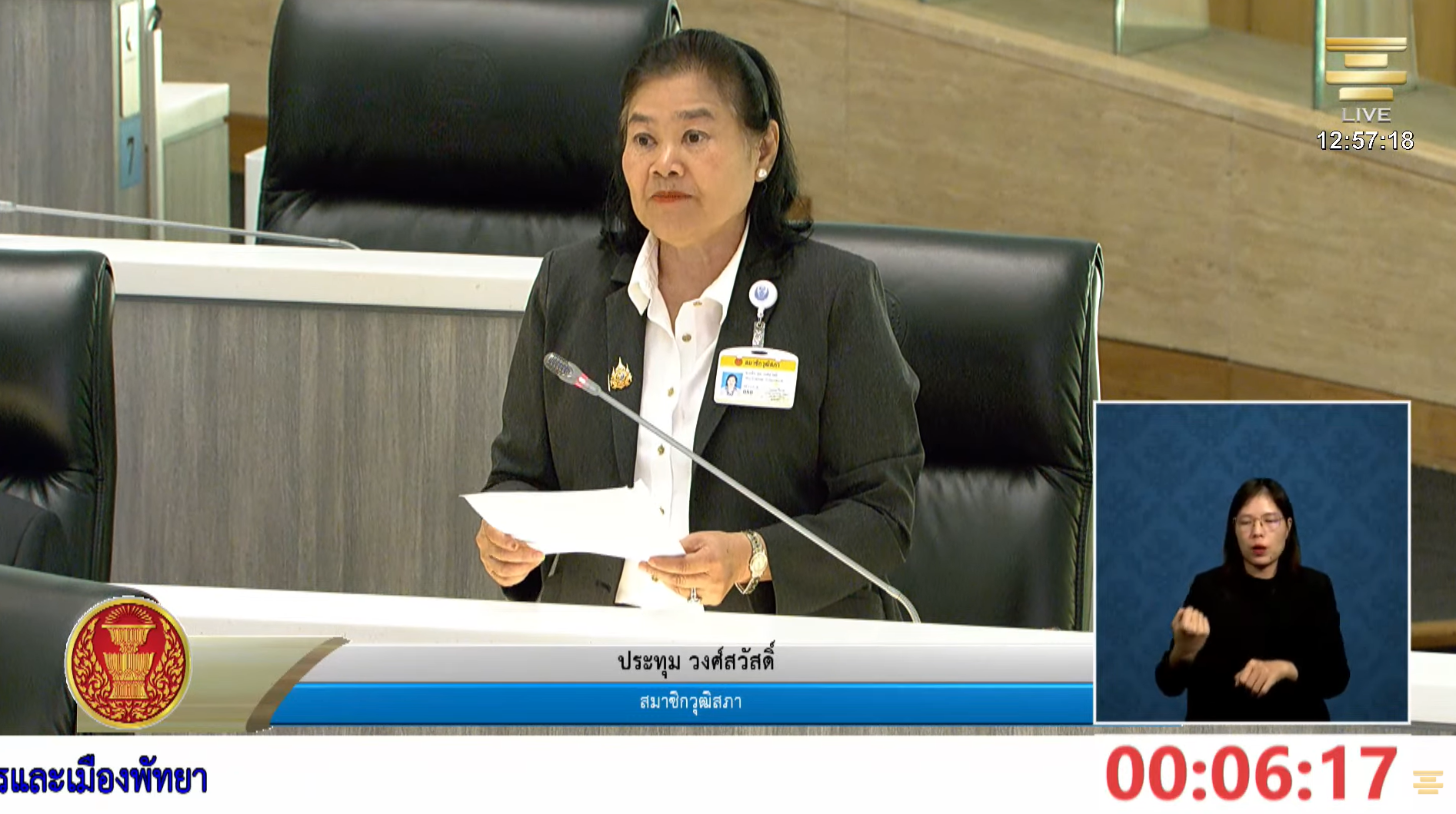 นางประทุม วงศ์สวัสดิ์ สมาชิกวุฒิสภา (สว.) จังหวัดชลบุรี กล่าวถึงปัญหาการจราจร ในตัวเมืองพัทยา ว่า ปัจจุบันประสบปัญหาการจราจรติดขัดบนถนนสุขุมวิท ปัญหาการจอดรถกีดขวางบนถนนเลียบชายหาดที่ประชาชนไม่เกรงกลัวกฎหมาย แม้ว่าเทศบาลเมืองพัทยามีสิทธิ์ออกกฎหมายห้ามจอดแต่ไม่มีสิทธิ์เปรียบเทียบปรับ