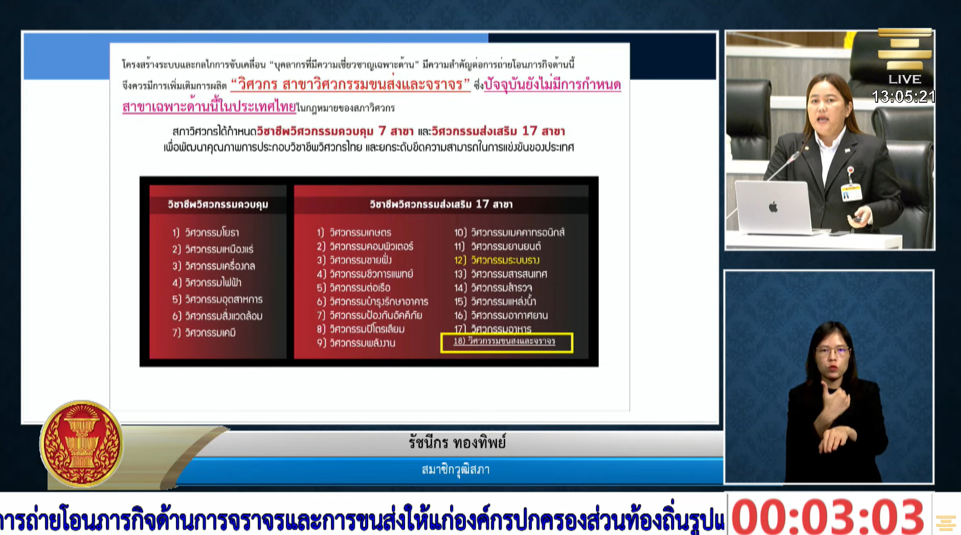 นางสาวรัชนีกร ทองทิพย์ สว. จังหวัดพังงา กล่าวด้วยว่า การถ่ายโอนภารกิจด้านจราจรอย่างเดียวอาจไม่เพียงพอต่อการเป็นเมืองที่ดีได้ เนื่องจากการบริหารจัดการเมืองต้องมีการประสานความสัมพันธ์ระหว่างการวางผังเมืองและการออกแบบระบบขนส่งมวลชน ซึ่งปัญหาหลักอาจอยู่ที่ องค์ความรู้และนโยบายสาธารณะของส่วนกลางที่ยังใช้มาตรฐาน Highway Capacity Manual (HCM) ฉบับปี 1994 ซึ่งเป็นมาตรฐานเดิม อีกทั้งวิศวกรรมขนส่งและจราจร ยังไม่ได้ถูกกำหนดให้เป็นวิชาชีพควบคุมในประเทศไทย ดังนั้นจึงควรมีการเริ่มผลิตบุคลากรเฉพาะด้านนี้เพื่อให้พร้อมกับการถ่ายโอนภารกิจในอนาคต