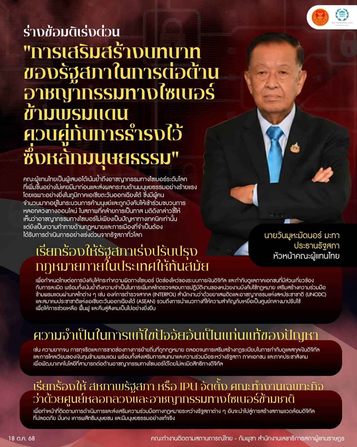 คณะทำงานติดตามสถานการณ์ไทย-กัมพูชา สำนักงานเลขาธิการสภาผู้แทนราษฎร เผยแพร่ร่างข้อมติเร่งด่วน "การเสริมสร้างบทบาทของรัฐสภาในการต่อต้านอาชญากรรมทางไซเบอร์ข้ามพรมแดน ควบคู่กับการธำรงไว้ซึ่งหลักมนุษยธรรม" โดยคณะผู้แทนไทยที่มีนายวันมูหะมัดนอร์ มะทา ประธานรัฐสภา ในฐานะหัวหน้าคณะผู้แทนไทย ได้เน้นย้ำถึงอาชญากรรมทางไซเบอร์ระดับโลกที่เพิ่มขึ้นอย่างไม่เคยมีมาก่อน และส่งผลกระทบด้านมนุษยธรรมอย่างร้ายแรง โดยเฉพาะอย่างยิ่งในภูมิภาคเอเชียตะวันออกเฉียงใต้ ซึ่งมีผู้คนจำนวนมากอยู่ในกระบวนการค้ามนุษย์และถูกบังคับให้เข้าร่วมขบวนการหลอกลวงทางออนไลน์ ในสภาพที่คล้ายการเป็นทาส มติดังกล่าวชี้ให้เห็นว่าอาชญากรรมทางไซเบอร์ไม่เพียงเป็นปัญหาทางเทคนิคเท่านั้น แต่ยังเป็นความท้าทายด้านกฎหมายและการเมืองที่จำเป็นต้องได้รับการดำเนินการอย่างเร่งด่วนจากรัฐสภาทั่วโลก