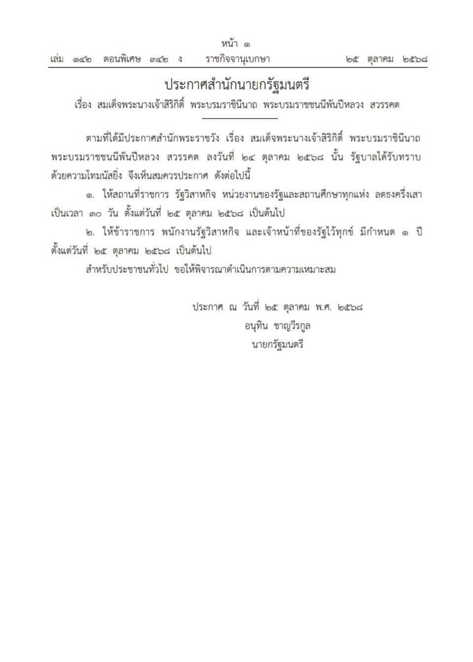 ทั้งนี้ ราชกิจจานุเบกษาได้เผยแพร่ประกาศสำนักนายกรัฐมนตรี ลงวันที่ 25 ตุลาคม 2568 ลงนามโดย นายอนุทิน ชาญวีรกูล นายกรัฐมนตรี เป็นแนวทางปฏิบัติจากรัฐบาลในการประกาศให้สถานที่ราชการ รัฐวิสาหกิจ หน่วยงานของรัฐและสถานศึกษาทุกแห่ง ลดธงครึ่งเสา เป็นเวลา 30 วัน ตั้งแต่วันที่ 25 ตุลาคม 2568 เป็นต้นไป และให้ข้าราชการ พนักงานรัฐวิสาหกิจ และเจ้าหน้าที่ของรัฐไว้ทุกข์ มีกำหนด 1 ปี ตั้งแต่วันที่ วันที่ 25 ตุลาคม 2568 เป็นต้นไป สำหรับประชาชนทั่วไป ขอให้พิจารณาดำเนินการตามความเหมาะสม