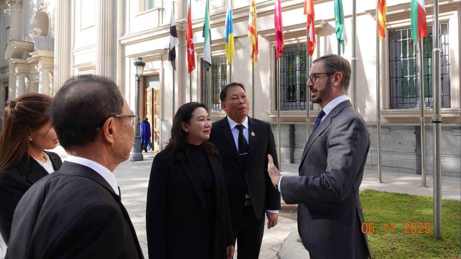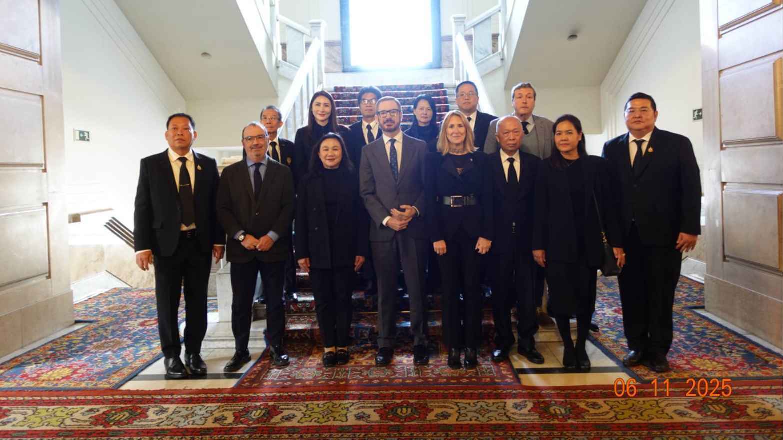 นางสาวเข็มรัตน์ สุรเมธีมาณพ สมาชิกวุฒิสภา ในฐานะประธานกลุ่มมิตรภาพสมาชิกรัฐสภาไทย – สเปน พร้อมด้วยคณะผู้แทนกลุ่มมิตรภาพสมาชิกรัฐสภาไทย - สเปน ประกอบด้วย นายนิเวศ พันธ์เจริญวรกุล สมาชิกวุฒิสภา ในฐานะกรรมการบริหารกลุ่มมิตรภาพฯ นายพิศูจน์ รัตนวงศ์ สมาชิกวุฒิสภา ในฐานะกรรมการบริหารกลุ่มมิตรภาพฯ นางจุฑารัตน์ นิลเปรม สมาชิกวุฒิสภา ในฐานะกรรมการบริหารกลุ่มมิตรภาพฯ นางเจียระนัย ตั้งกีรติ สมาชิกวุฒิสภา ในฐานะกรรมการบริหารกลุ่มมิตรภาพฯ และเลขานุการ นายธัชชญาณ์ณัช เจียรธนัทกานนท์ สมาชิกวุฒิสภาในฐานะที่ปรึกษากลุ่มมิตรภาพฯ นายชวภณ วัธนเวคิน สมาชิกวุฒิสภาในฐานะที่ปรึกษา นายโสภณ มะโนมะยา สมาชิกวุฒิสภาในฐานะที่ปรึกษา และนายพูนศักดิ์ จันทร์จำปี สมาชิกสภาผู้แทนราษฎร ในฐานะสมาชิกกลุ่มมิตรภาพฯ เข้าเยี่ยมคารวะนายฮาเวียร์ มาโรโต อรันซาบัล (Hon. Mr. Javier Moroto Aranzabal) รองประธานวุฒิสภาราชอาณาจักรสเปน คนที่หนึ่ง ณ อาคารวุฒิสภา กรุงมาดริด ราชอาณาจักรสเปน เมื่อวันที่ 6 พ.ย. ที่ผ่านมา โอกาสนี้รองประธานวุฒิสภาราชอาณาจักรสเปน คนที่หนึ่ง ได้กล่าวแสดงความอาลัยต่อการสวรรคตของสมเด็จพระนางเจ้าสิริกิติ์ พระบรมราชินีนาถ พระบรมราชชนนีพันปีหลวง โดยคณะผู้แทนกลุ่มมิตรภาพฯ ไทย-สเปน กล่าวขอบคุณและแสดงความซาบซึ้งใจที่ สมเด็จพระราชินีโซเฟีย พระบรมราชชนนีแห่งสเปนได้เสด็จพระราชดำเนินมาทรงลงพระนามแสดงความอาลัยต่อการสวรรคตของ สมเด็จพระนางเจ้าสิริกิติ์ พระบรมราชินีนาถ พระบรมราชชนนีพันปีหลวง เมื่อวันที่ 30 ตุลาคม พ.ศ. 2568 ณ สถานเอกอัครราชทูต ณ กรุงมาดริด