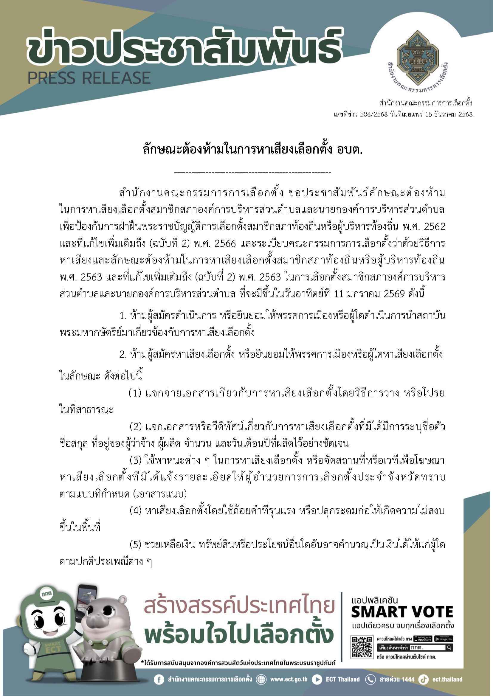 สํานักงานคณะกรรมการการเลือกตั้ง เผยแพร่ข้อมูลประชาสัมพันธ์ลักษณะต้องห้ามในการหาเสียงเลือกตั้งสมาชิกสภาองค์การบริหารส่วนตําบลและนายกองค์การบริหารส่วนตําบล เพื่อป้องกันการฝ่าฝืนพระราชบัญญัติการเลือกตั้งสมาชิกสภาท้องถิ่นหรือผู้บริหารท้องถิ่น พ.ศ. 2562 และที่แก้ไขเพิ่มเติมถึง (ฉบับที่ 2) พ.ศ. 2566 และระเบียบคณะกรรมการการเลือกตั้งว่าด้วยวิธีการหาเสียงและลักษณะต้องห้ามในการหาเสียงเลือกตั้งสมาชิกสภาท้องถิ่นหรือผู้บริหารท้องถิ่น พ.ศ. 2563 และที่แก้ไขเพิ่มเติมถึง (ฉบับที่ 2) พ.ศ. 2563 ในการเลือกตั้งสมาชิกสภาองค์การบริหารส่วนตําบลและนายกองค์การบริหารส่วนตําบล ที่จะมีขึ้นในวันอาทิตย์ที่ 11 มกราคม 2569 ดังนี้