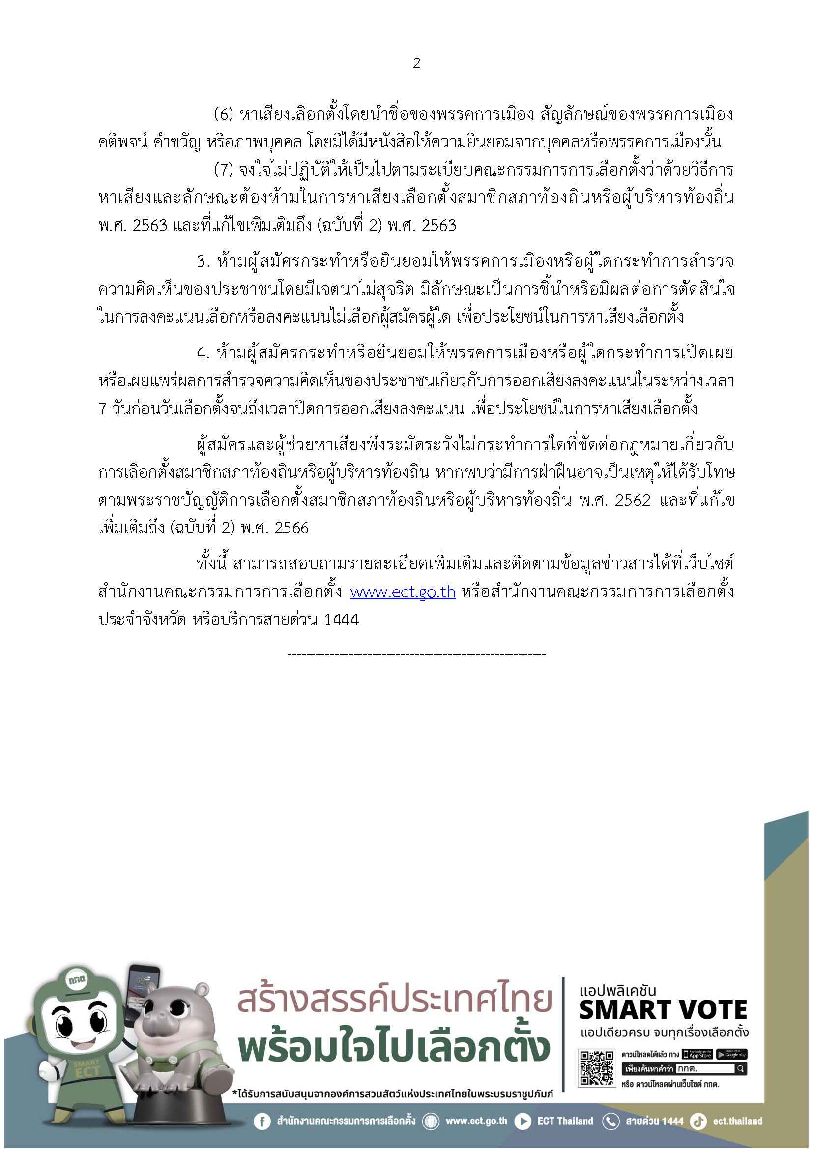 สามารถสอบถามรายละเอียดเพิมเติมและติดตามข้อมูลข่าวสารได้ที่เว็บไซต์สำนักงานคณะกรรมการการเลือกตั้ง www.ect.go.th หรือสํานักงานคณะกรรมการการเลือกตั้ง ประจําจังหวัด หรือบริการสายด่วน 1444