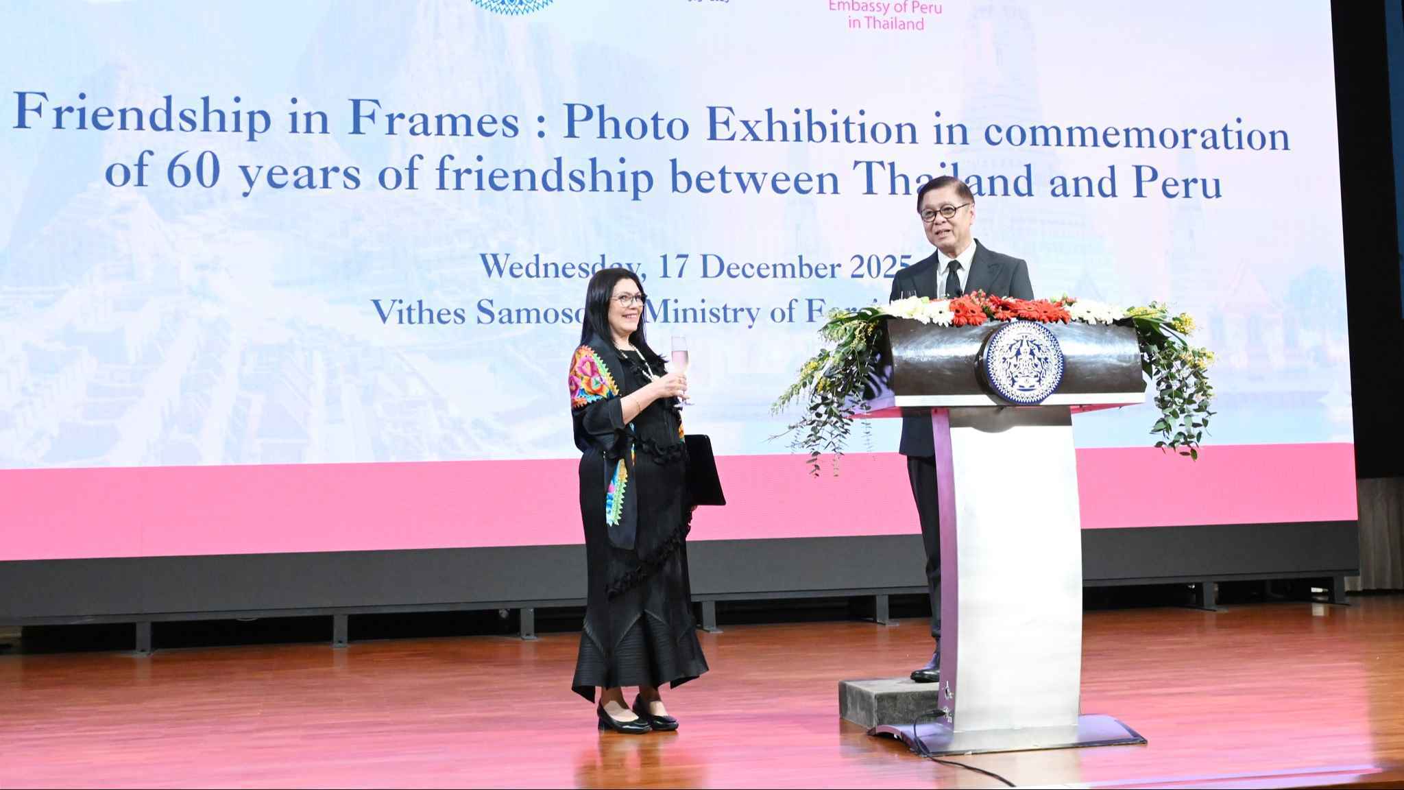 นายนิรัตน์ อยู่ภักดี ประธานคณะกรรมาธิการ (กมธ.) การต่างประเทศ วุฒิสภา ในฐานะผู้แทนประธานวุฒิสภา พร้อมด้วยนายพรชัย วิทยเลิศพันธุ์ รองเลขานุการคณะกรรมาธิการการต่างประเทศ เข้าร่วมงาน "นิทรรศการภาพถ่ายรำลึกถึงมิตรภาพ 60 ปี ความสัมพันธ์ทางการทูตระหว่างไทยกับเปรู" ณ ห้องวิเทศสโมสร กระทรวงการต่างประเทศ จัดโดย กระทรวงการต่างประเทศ ร่วมกับสถานเอกอัครราชทูตสาธารณรัฐเปรูประจำประเทศไทย โดยก่อนพิธีการจะเริ่มขึ้น ผู้เข้าร่วมงานได้ยืนสงบนิ่งถวายอาลัยแด่สมเด็จพระนางเจ้าสิริกิติ์ พระบรมราชินีนาถ พระบรมราชชนนีพันปีหลวง