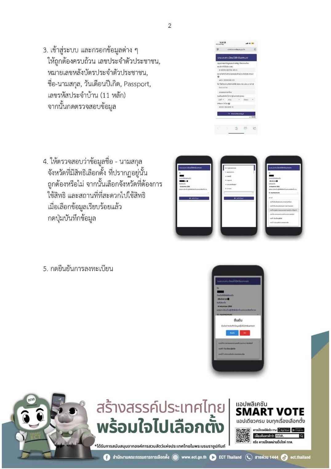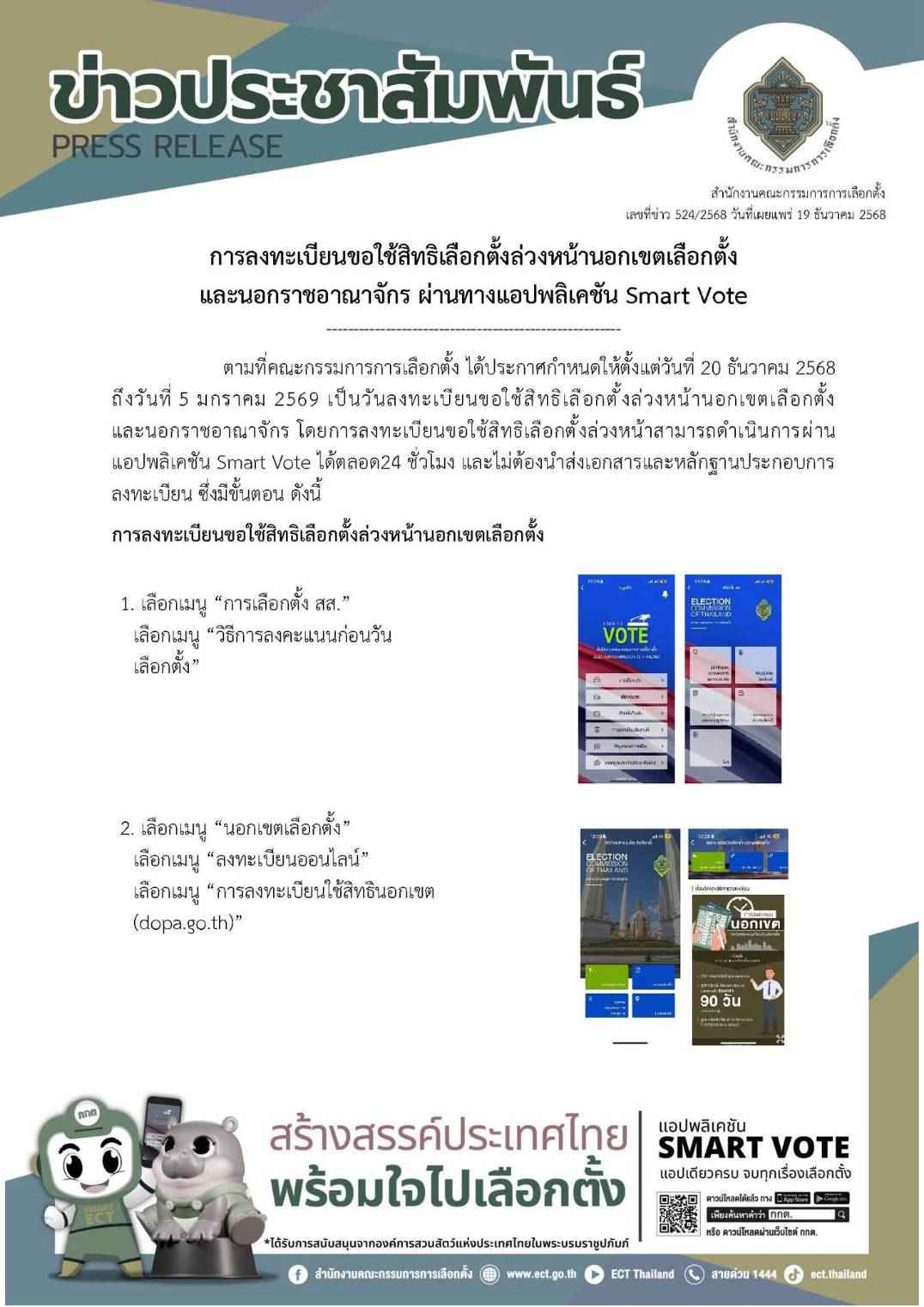 สำนักงานคณะกรรมการการเลือกตั้ง (กกต.) เผยแพร่ข่าวประชาสัมพันธ์เลขที่ 524/2568 วันที่ 19 ธันวาคม พ.ศ. 2568 เรื่องการลงทะเบียนขอใช้สิทธิ์เลือกตั้งล่วงหน้านอกเขตเลือกตั้ง และนอกราชอาณาจักร ผ่านทางแอปพลิเคชัน smart vote ตามที่ กกต. ได้ประกาศกำหนดให้ตั้งแต่วันที่ 20 ธันวาคม พ.ศ. 2568 ถึงวันที่ 5 มกราคม พ.ศ. 2569 เป็นวันลงทะเบียนขอใช้สิทธิ์เลือกตั้งล่วงหน้านอกเขตเลือกตั้งและนอกราชอาณาจักร โดยการลงทะเบียนขอใช้สิทธิ์เลือกตั้งล่วงหน้าสามารถดำเนินการผ่านแอปพลิเคชัน smart vote ได้ตลอด 24 ชั่วโมง และไม่ต้องนำส่งเอกสารหรือหลักฐานประกอบการลงทะเบียน มีขั้นตอนดังนี้