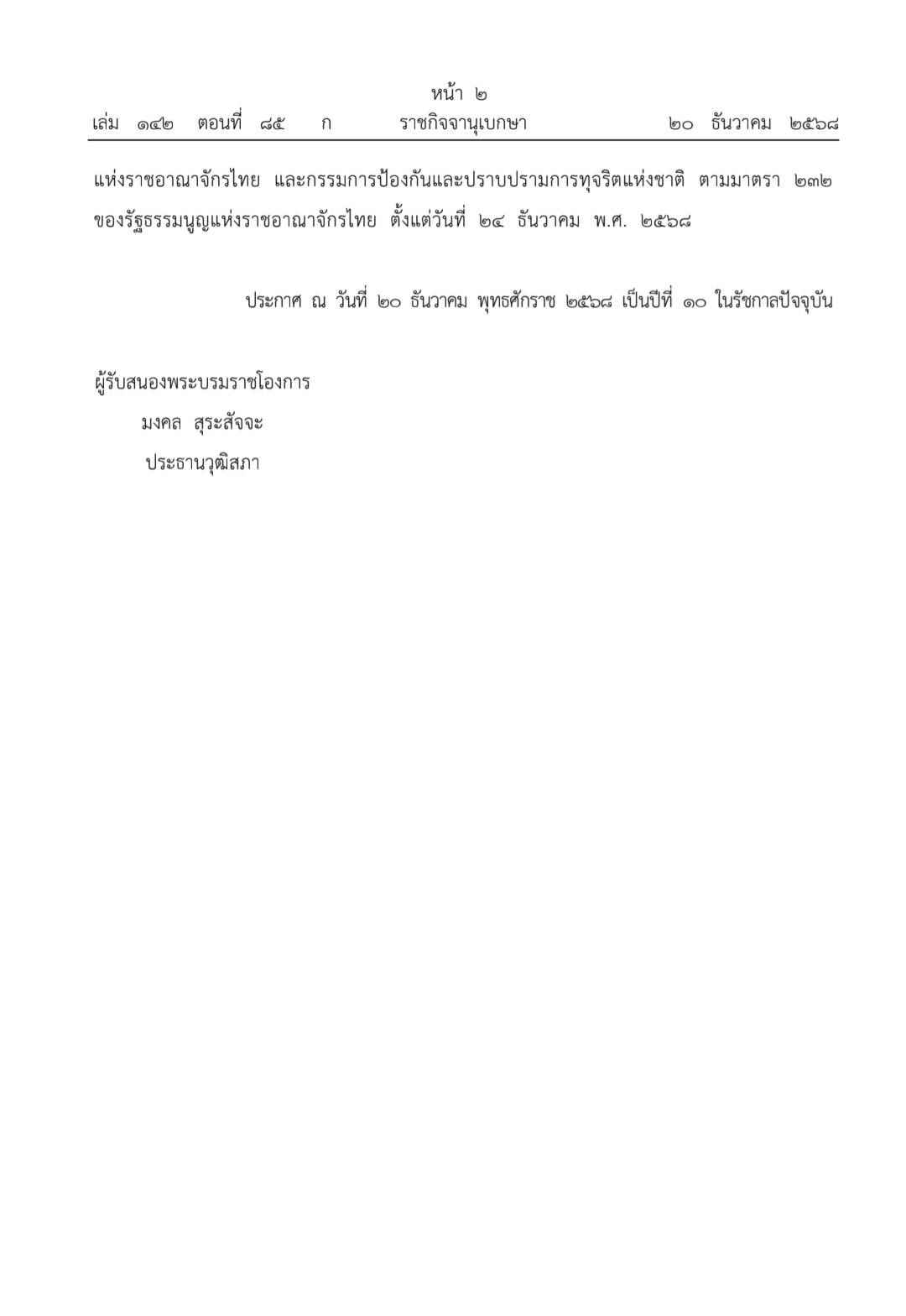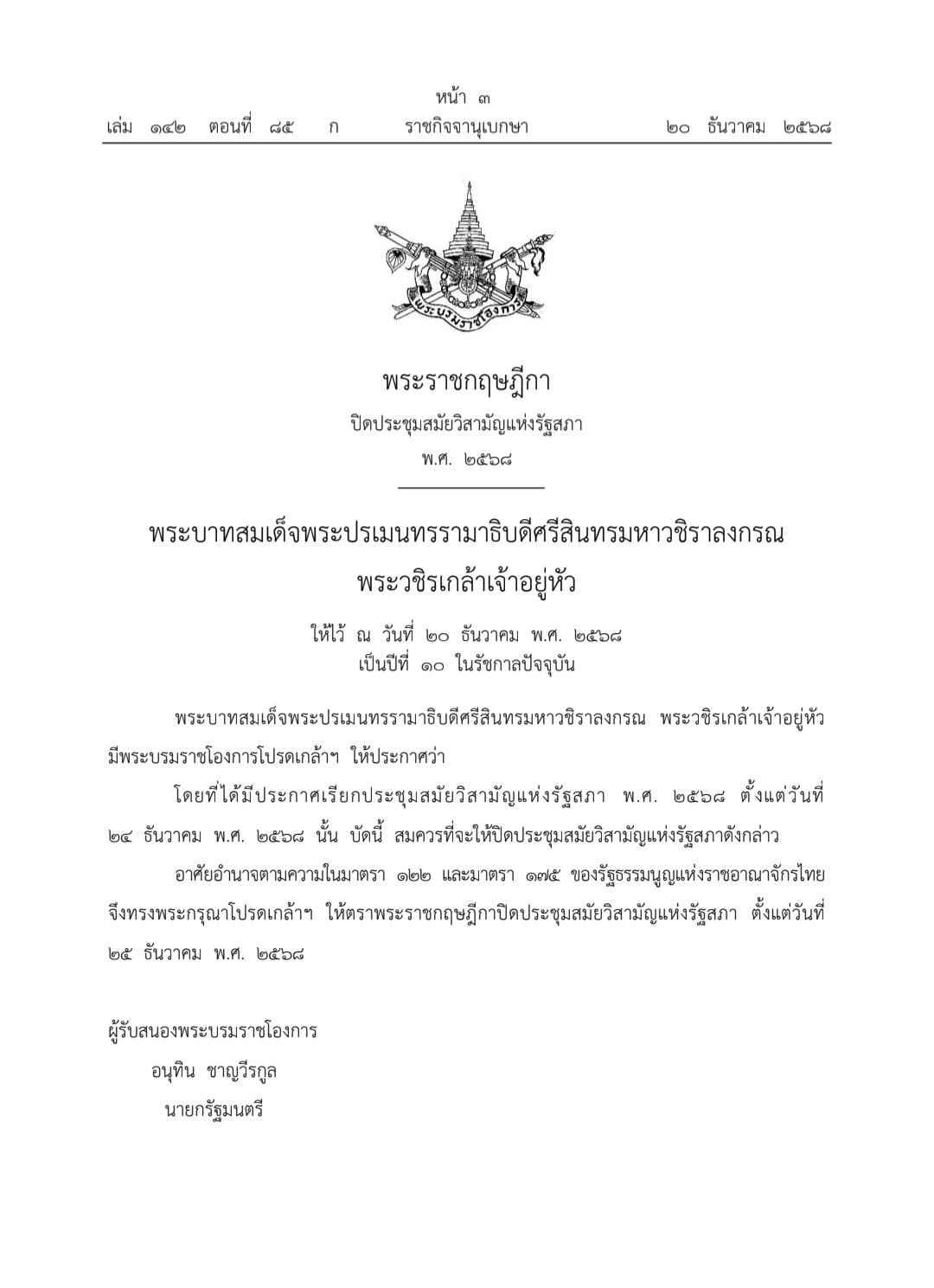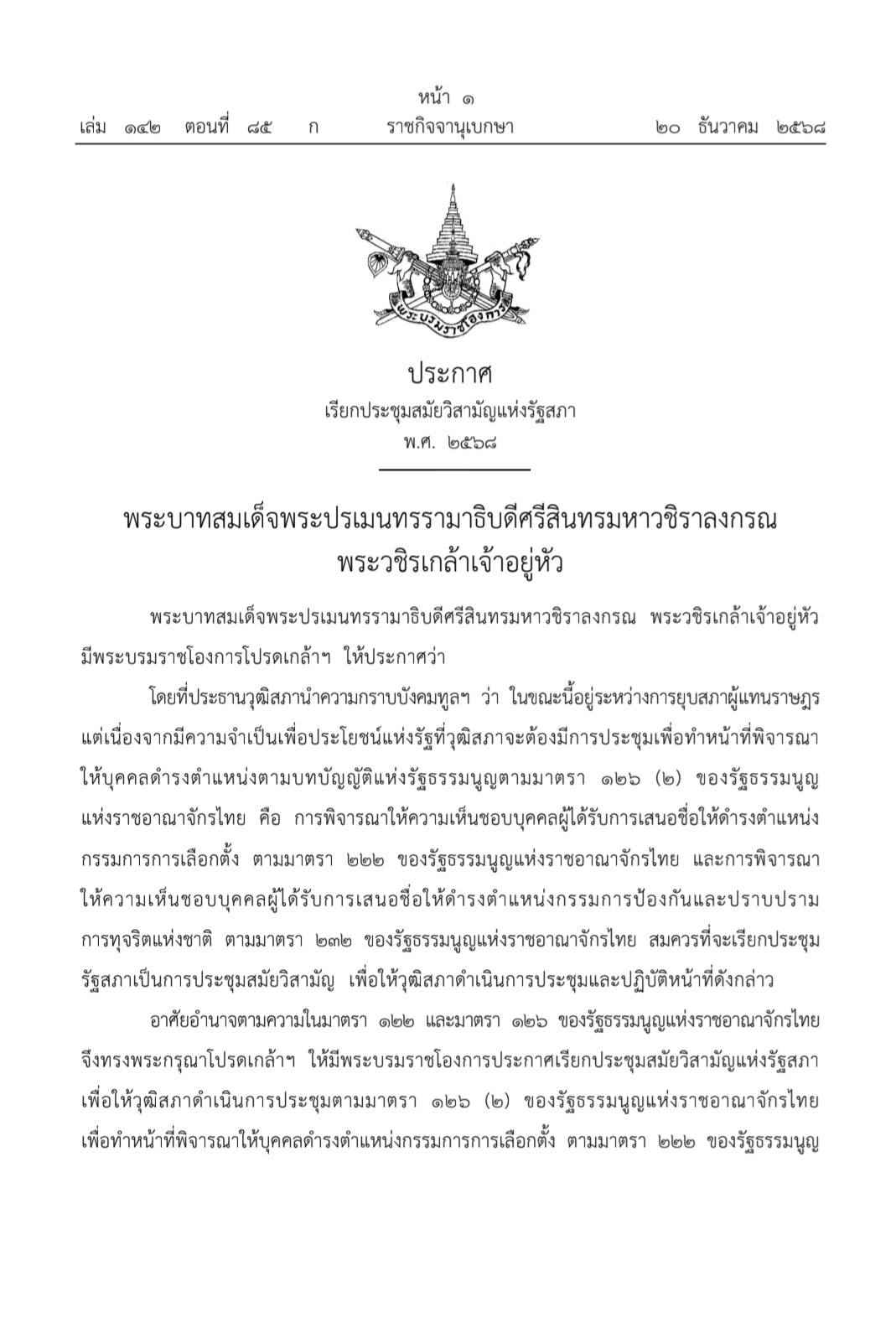 ราชกิจจานุเบกษาเผยแพร่ ประกาศเรียกประชุมสมัยวิสามัญแห่งรัฐสภา พ.ศ. 2568 และ พระราชกฤษฎีกาปิดประชุมสมัยวิสามัญแห่งรัฐสภา พ.ศ. 2568 ซึ่งมีผลตั้งแต่วันที่ 24 ธันวาคม พ.ศ. 2568 โดยมีวัตถุประสงค์เพื่อให้วุฒิสภาสามารถปฏิบัติหน้าที่ตามบทบัญญัติของรัฐธรรมนูญ ในช่วงที่สภาผู้แทนราษฎรสิ้นสุดลงจากการยุบสภา สาระสำคัญของพระราชกฤษฎีกาฉบับดังกล่าว ระบุว่า แม้อยู่ในระหว่างการยุบสภาผู้แทนราษฎร แต่เพื่อประโยชน์แห่งรัฐ ยังมีความจำเป็นต้องให้รัฐสภาประชุม เพื่อพิจารณาให้ความเห็นชอบบุคคลซึ่งได้รับการเสนอชื่อให้ดำรงตำแหน่งตามที่รัฐธรรมนูญกำหนด ได้แก่ กรรมการการเลือกตั้ง (กกต.) และกรรมการป้องกันและปราบปรามการทุจริตแห่งชาติ (ป.ป.ช.) ซึ่งเป็นอำนาจหน้าที่ของวุฒิสภาตามรัฐธรรมนูญ มาตรา 126 (2) ขณะเดียวกัน มี พระราชกฤษฎีกาปิดประชุมสมัยวิสามัญแห่งรัฐสภา ตั้งแต่วันที่ 25 ธันวาคม พ.ศ. 2568