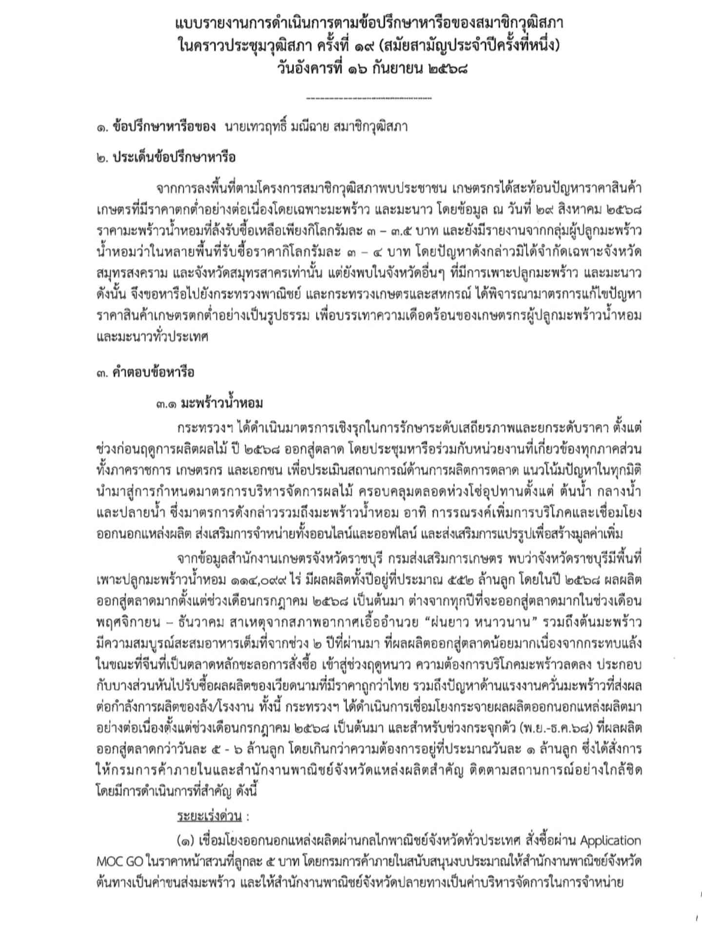 นายเทวฤทธิ์ มณีฉาย สมาชิกวุฒิสภา (สว.) เปิดเผยผ่านทางเพจเฟซบุ๊กส่วนตัว ว่า เมื่อวันที่ 16 กันยายน ที่ผ่านมา ได้ปรึกษาหารือต่อที่ประชุมวุฒิสภาในประเด็นราคามะพร้าวและมะนาวตกต่ำ ซึ่งเป็นเสียงสะท้อนจากประชาชน จากการลงพื้นที่กิจกรรม “สว.พบประชาชน” ในภาคกลางตอนล่าง จังหวัดสมุทรสาครและสมุทรสงคราม ระหว่างวันที่ 28–29 สิงหาคม 2568 โดยเมื่อวันที่ 1 ธันวาคม 2568 นางศุภจี สุธรรมพันธุ์ รัฐมนตรีว่าการกระทรวงพาณิชย์ ได้มีหนังสือด่วนที่สุดถึงประธานวุฒิสภา รายงานผลการดำเนินการตามข้อปรึกษาหารือของตน โดยรายงานของกระทรวงพาณิชย์ ระบุสาเหตุสำคัญที่ทำให้ราคามะพร้าวน้ำหอมปรับตัวลดลงมาจากปริมาณผลผลิตที่ออกสู่ตลาดในช่วงเวลาเดียวกันที่มีจำนวนมาก โดยเฉพาะในจังหวัดสมุทรสาคร สมุทรสงคราม และพื้นที่ใกล้เคียงซึ่งเป็นแหล่งผลิตสำคัญ ประกอบกับสภาพอากาศที่เอื้ออำนวยในช่วงที่ผ่านมาส่งผลให้ผลผลิตออกมากกว่าปกติ ขณะที่โครงสร้างการตลาดยังมีข้อจำกัดทำให้การระบายผลผลิตไม่ทันต่อปริมาณที่เพิ่มขึ้น ส่งผลให้ราคาหน้าสวนปรับลดลงเหลือเพียงประมาณ 3–4 บาทต่อผล ซึ่งต่ำกว่าระดับที่เกษตรกรสามารถรับภาระต้นทุนได้