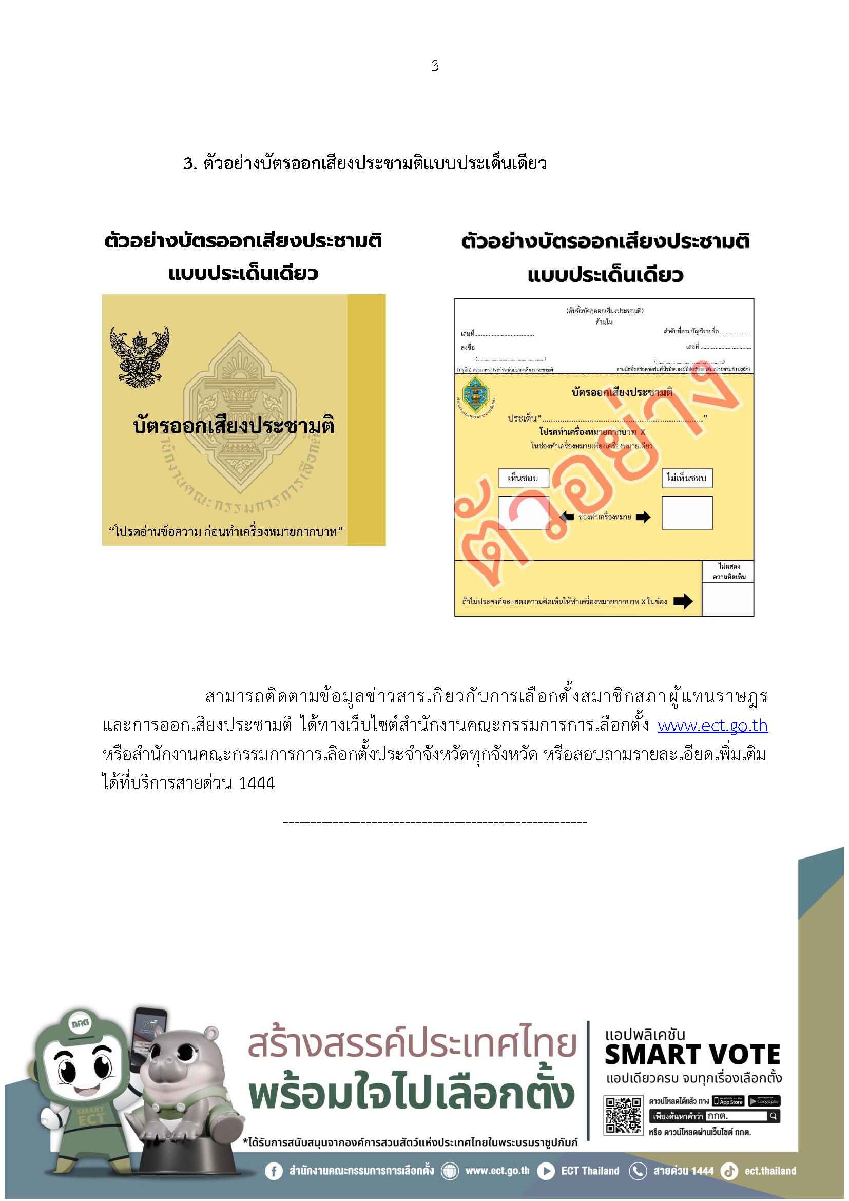 สำนักงานคณะกรรมการการเลือกตั้ง (สำนักงาน กกต.) ขอประชาสัมพันธ์ตัวอย่างบัตรเลือกตั้งสมาชิกสภาผู้แทนราษฎรแบบแบ่งเขตเลือกตั้งและแบบบัญชีรายชื่อ และบัตรออกเสียงประชามติ