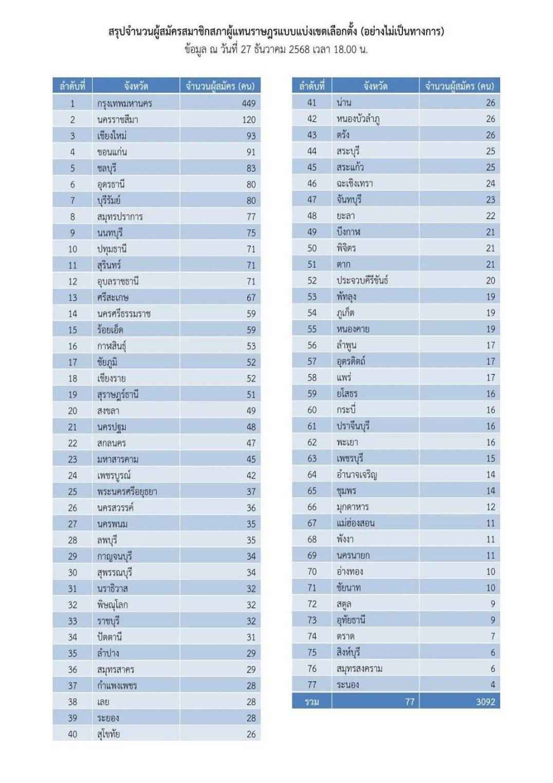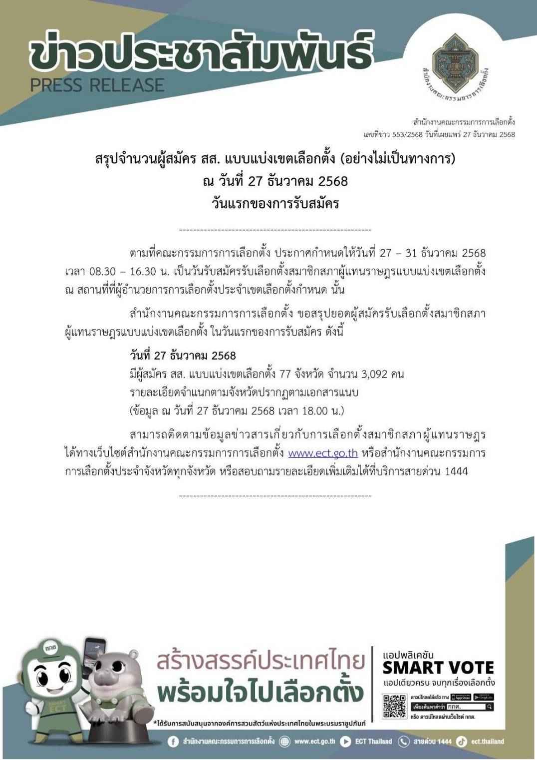 สำนักงานคณะกรรมการการเลือกตั้ง (กกต.) เผยแพร่ข่าวประชาสัมพันธ์เลขที่ 553/2568 วันที่ 27 ธันวาคม พ.ศ. 2568 สรุปยอดจำนวนผู้สมัครรับเลือกตั้งสมาชิกสภาผู้แทนราษฎร (สส.) แบบแบ่งเขตเลือกตั้ง วันแรกของการรับสมัคร (27 ธ.ค. 68) มีผู้สมัคร สส.แบบแบ่งเขตเลือกตั้ง 77 จังหวัด จำนวน 3,092 คน (ข้อมูลวันที่ 27 ธ.ค. 68 เวลา 18.00 น. จังหวัดที่มีจำนวนผู้สมัครมากที่สุดได้แก่กรุงเทพมหานคร จำนวน 449 คน รองลงมาคือจังหวัดนครราชสีมา 120 คน เชียงใหม่ 93 คน ขอนแก่น 91 คน และชลบุรี 83 คน ทั้งนี้ กกต. ยังคงเปิดรับการสมัครรับเลือกตั้ง สส. ไปจนถึงวันที่ 31 ธ.ค. 68 เวลา 08.30 - 16.30 น. ณสถานที่ที่ผู้อำนวยการการเลือกตั้งประจำเขตเลือกตั้งกำหนด โดยสามารถติดตามข้อมูลข่าวสารเกี่ยวกับการเลือกตั้ง สส. ได้ทางเว็บไซต์ กกต. www.ect.go.th หรือ สำนักงาน กกต. ประจำจังหวัดทุกจังหวัด หรือสอบถามรายละเอียดเพิ่มเติมที่สายด่วน 1444