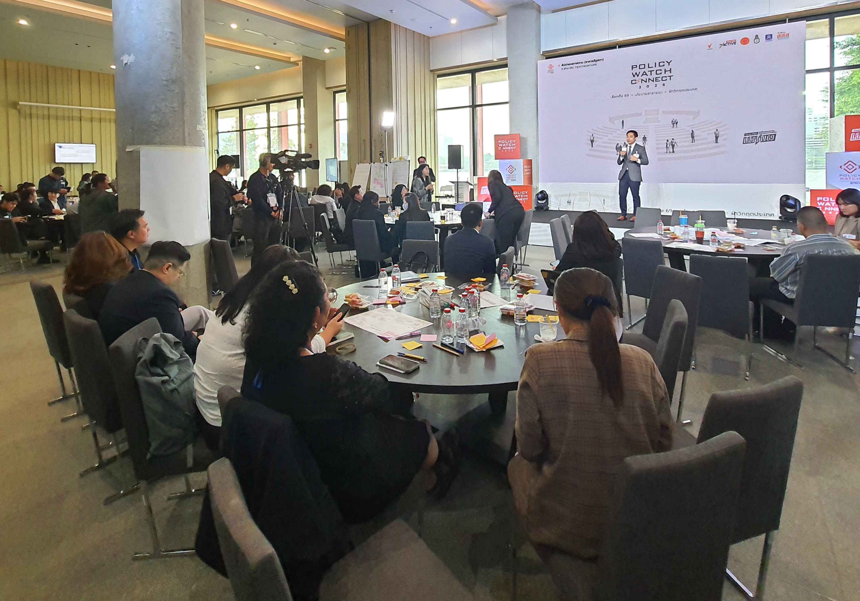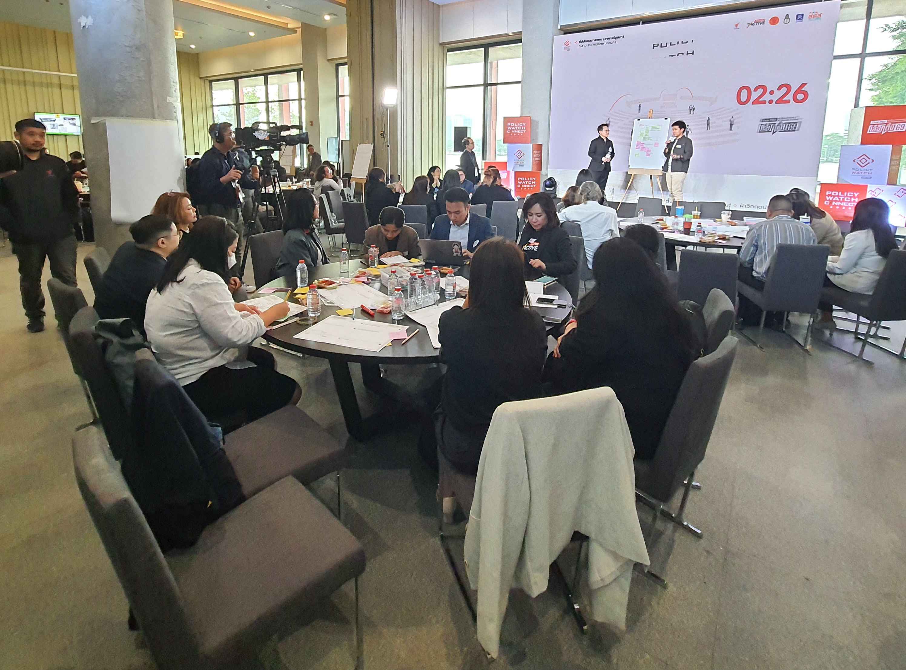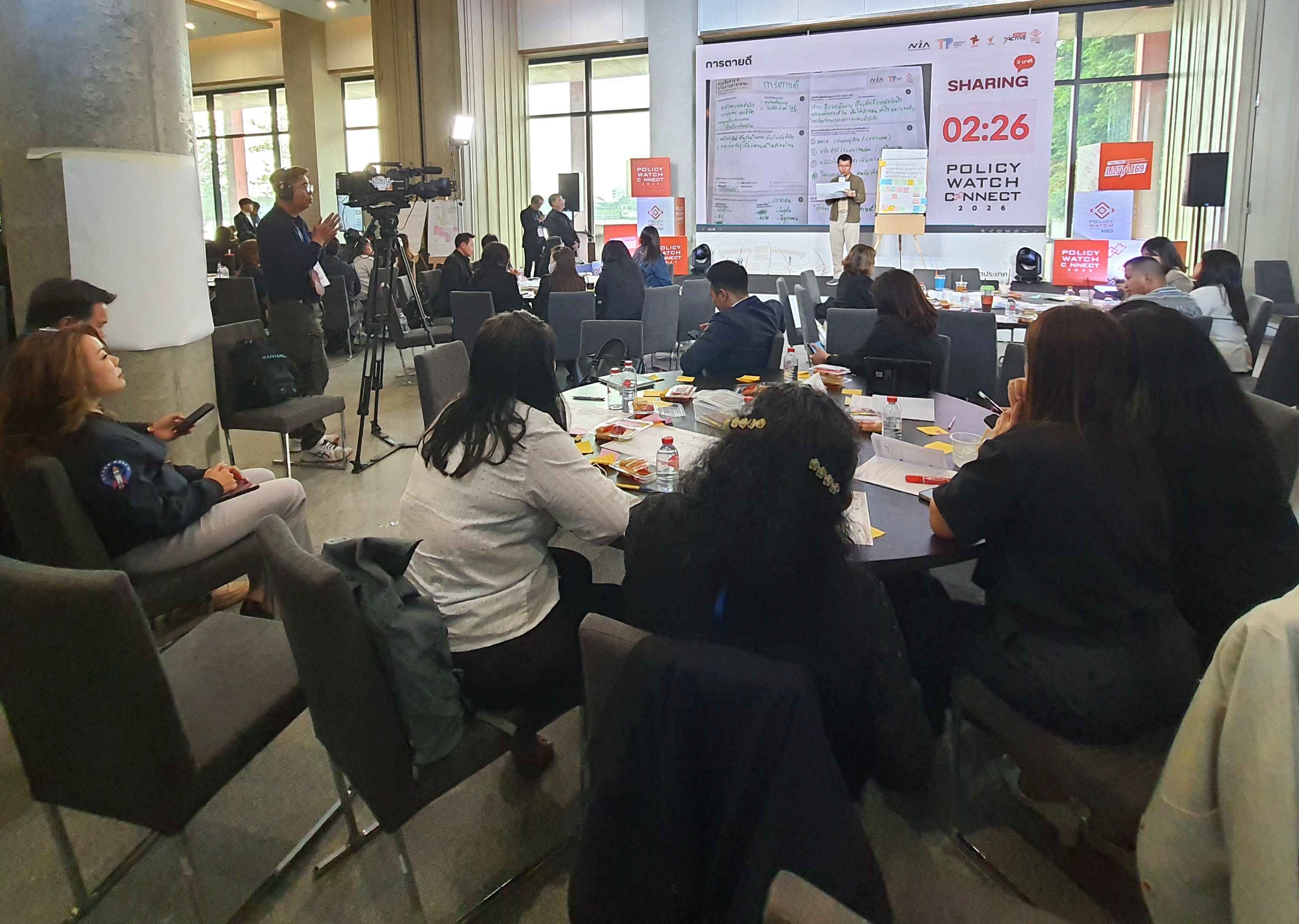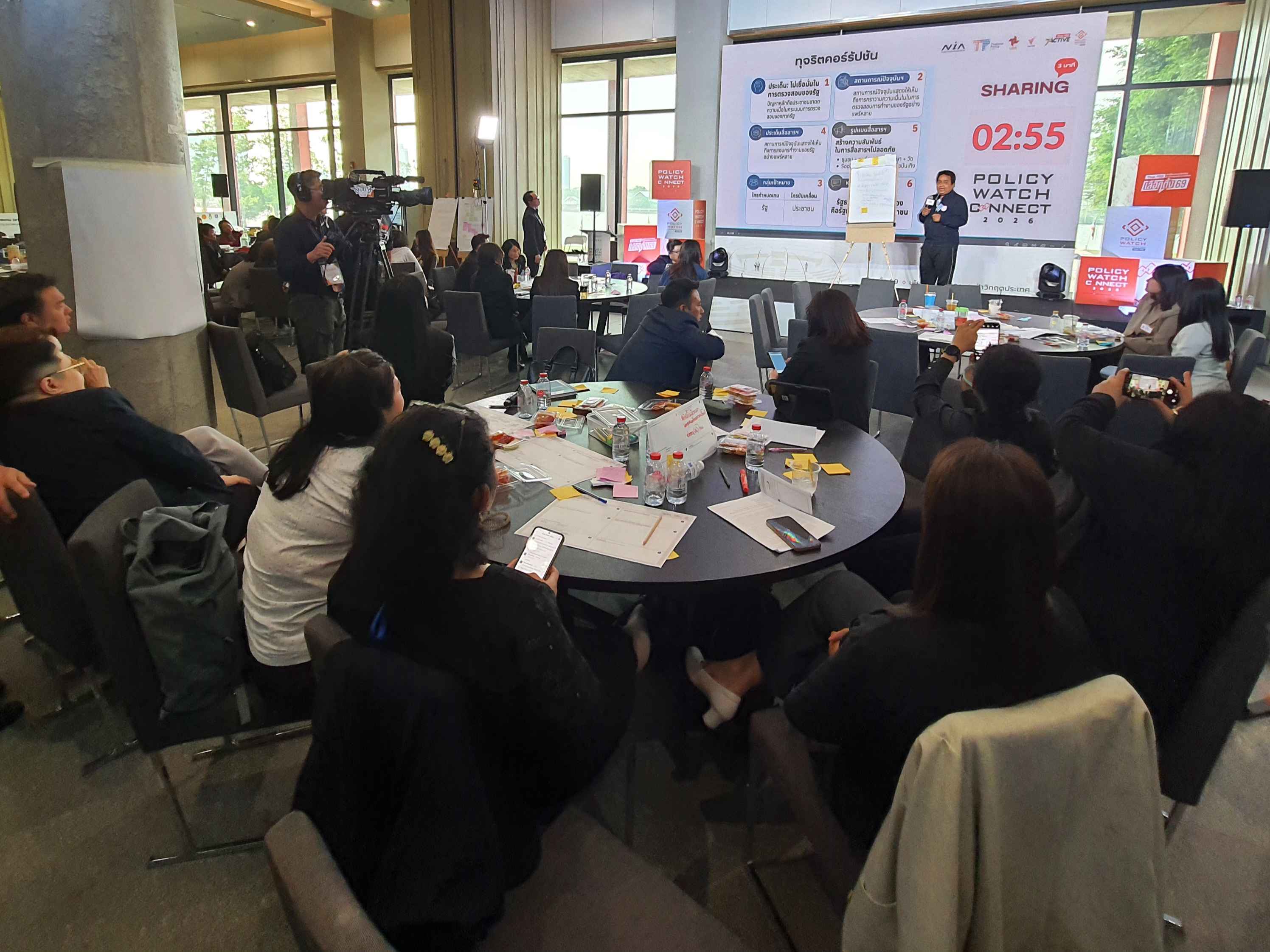 บรรยากาศการจัดโครงการ Policy Watch Connect 2026 เลือกตั้ง 69 นโยบายสาธารณะ ฝ่าวิกฤตประเทศ โดย คณะกรรมาธิการ (กมธ.) การพัฒนาการเมือง การมีส่วนร่วมของประชาชน สิทธิมนุษยชน สิทธิ เสรีภาพ และการคุ้มครองผู้บริโภค วุฒิสภา ร่วมกับ มูลนิธิฮันส์ ไซเดล ประเทศไทย ศูนย์สื่อสารวาระทางสังคมและนโยบายสาธารณะ (The Active) ไทยพีบีเอส สถาบันพระปกเกล้า สำนักงานกองทุนสนับสนุนการสร้างเสริมสุขภาพ (สสส.) และสำนักงานนวัตกรรมแห่งชาติ (NIA) ณ อาคารรัฐสภา ในช่วงบ่ายถึงช่วงเย็นวันนี้ (15 ม.ค.69) ซึ่งเป็นวันที่สี่ของการจัดกิจกรรม มีการจัดกิจกรรมภายใต้แนวคิดหลัก Policy Innovation in Action: Policy Watch Dating มีการทำกิจกรรมกลุ่ม ด้วยการประชุมเชิงปฏิบัติการ (Workshop) แบ่งออกเป็น 9 กลุ่ม ครอบคลุม 7 ประเด็น ได้แก่ ตายดี การคุ้มครองสิทธิและส่งเสริมวิถีชีวิตชาติพันธุ์ สมรสเท่าเทียม สังคมสูงวัย ภัยพิบัติ การปฏิรูปการศึกษา และทุจริตคอร์รัปชัน ภายใต้หัวข้อ Public Policy Communication: Innovation in Action กรอบแนวคิดและกรณีศึกษา โดยมี ผศ.ธีรพัฒน์ อังศุชวาล เป็นผู้ให้ข้อมูล และหัวข้อ Designing Policy Communication Innovation การออกแบบการสื่อสารนโยบายสาธารณะเพื่อสนับสนุนการตัดสินใจและการดำเนินนโยบายอย่างมีประสิทธิภาพ โดยมี ผศ.ธีรพัฒน์ อังศุชวาล คุณฐายิกา จันทร์เทพ และคุณทิฟฟานี เชน เป็นให้ข้อมูล ก่อนเปิดเวทีให้แต่ละกลุ่มได้นำเสนอผลการออกแบบ (Group Sharing) และและแลกเปลี่ยนข้อเสนอแนะ ใน 4 เรื่อง คือ ประเด็น การตั้งโจทย์ แผนการสื่อสาร และ Key Message ของทั้ง 7 ประเด็นในการทำ Workshop ด้วย