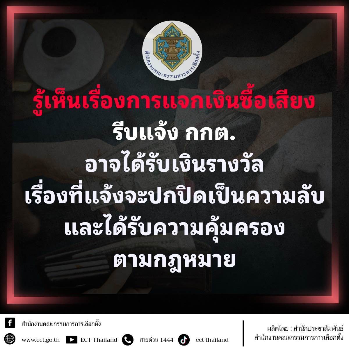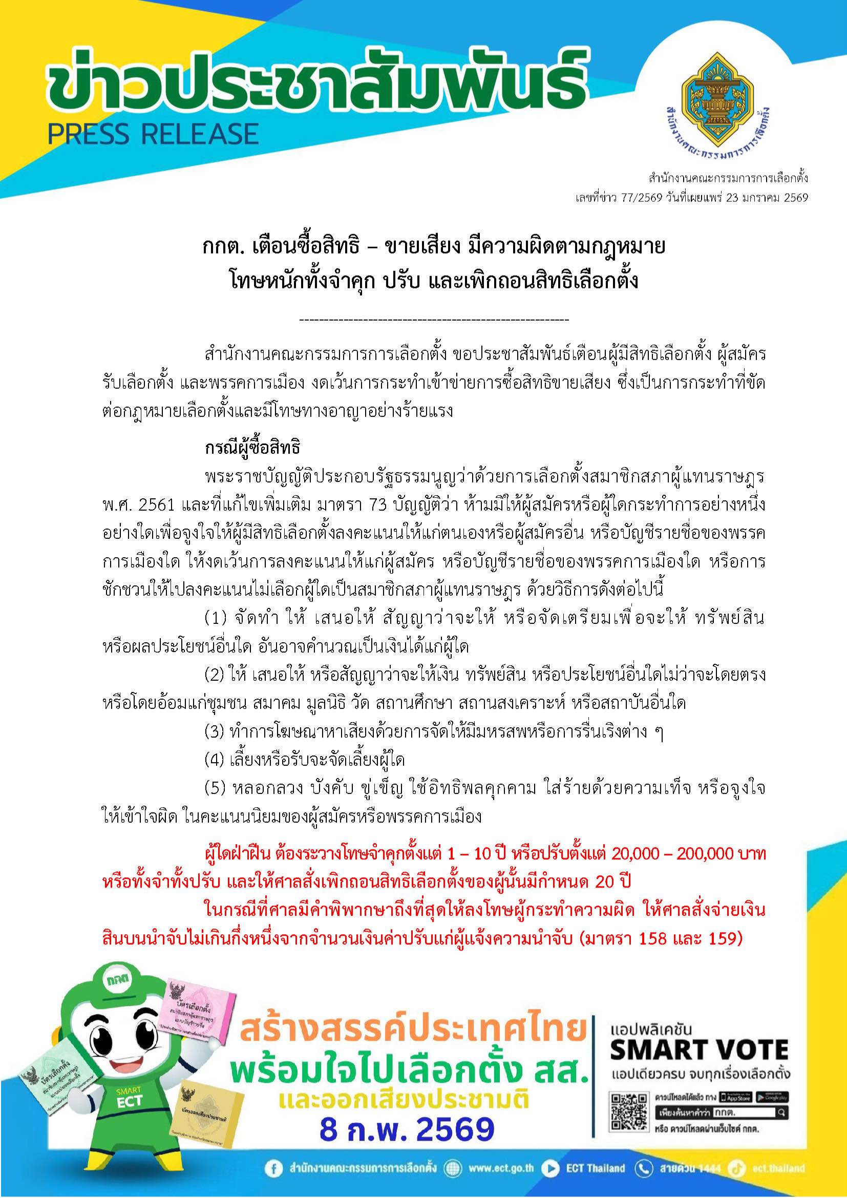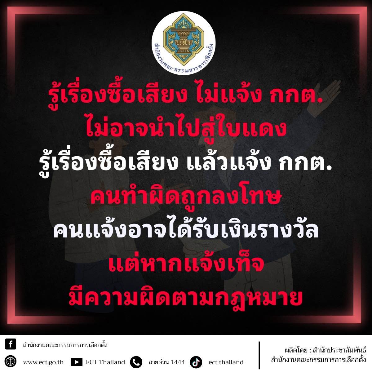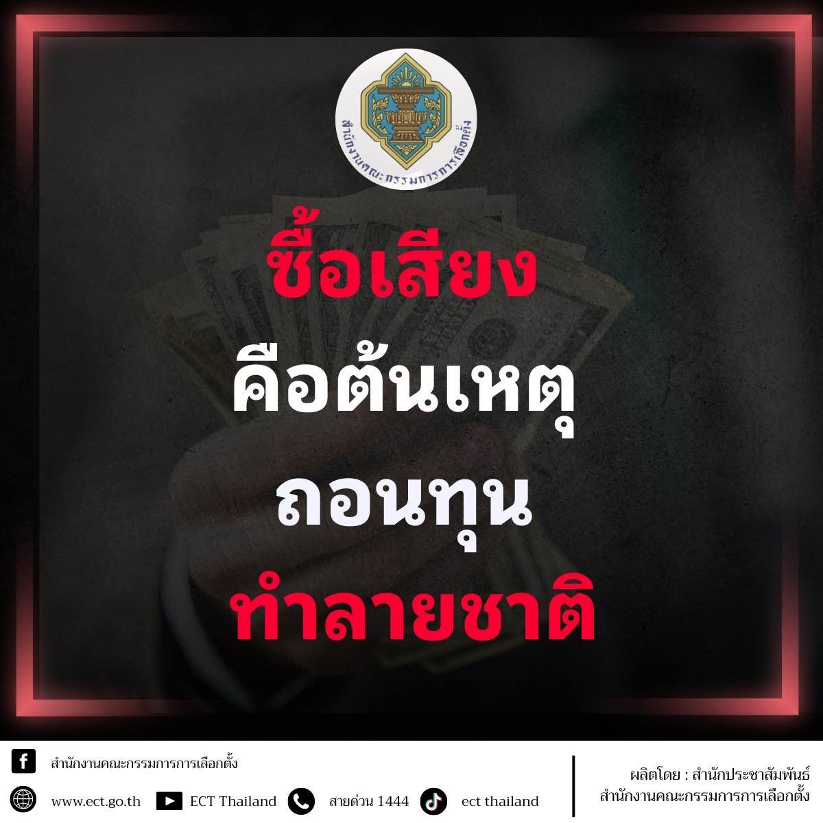 สำนักงานคณะกรรมการการเลือกตั้ง(กกต.) ประชาสัมพันธ์เตือนผู้มีสิทธิเลือกตั้ง ผู้สมัครรับเลือกตั้ง และพรรคการเมือง งดเว้นการกระทำเข้าข่ายการซื้อสิทธิขายเสียง ซึ่งเป็นการกระทำที่ขัดต่อกฎหมายเลือกตั้งและมีโทษทางอาญาอย่างร้ายแรง