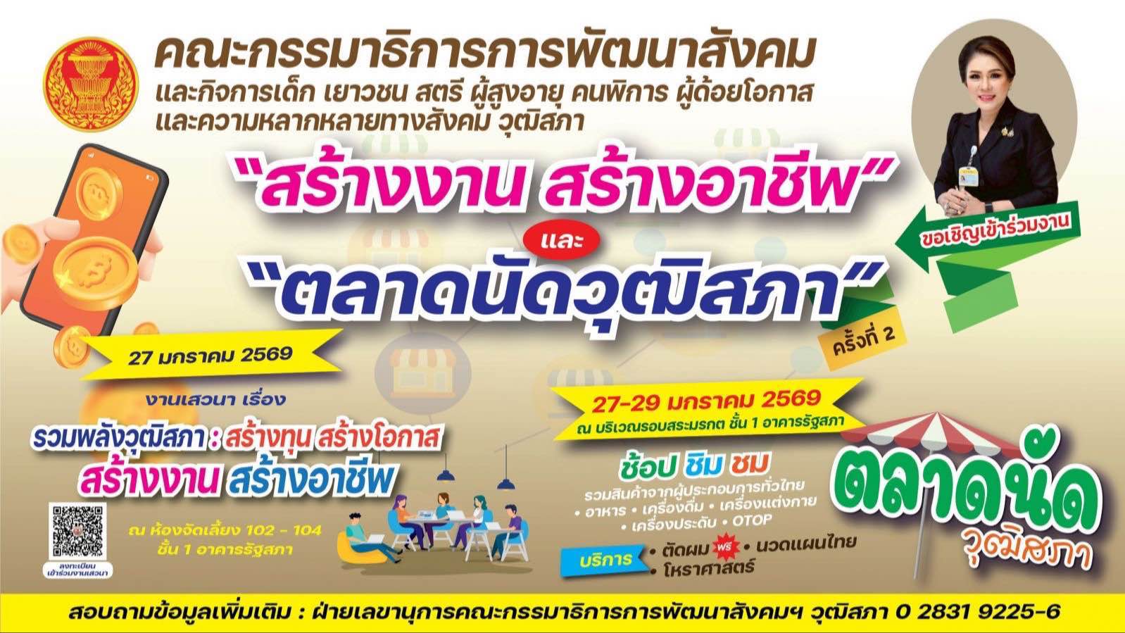 สำหรับโครงการสร้างงาน สร้างอาชีพ ตลาดนัดวุฒิสภา ครั้งที่ 2 จัดขึ้นระหว่างวันที่ 27–29 มกราคม 2569 ณ อาคารรัฐสภา มีวิทยากรจากหน่วยงานภาครัฐ ภาควิชาการ และภาคเอกชน ร่วมให้ความรู้ พร้อมกิจกรรมตลาดนัดวุฒิสภา รวมสินค้าจากผู้ประกอบการกว่า 100 ร้านค้า รวมถึงบริการเพื่อสังคม อาทิ ตัดผมฟรี นวดแผนโบราณ และกิจกรรมเพื่อการผ่อนคลาย เปิดให้ประชาชนเข้าร่วมและรับบริการ