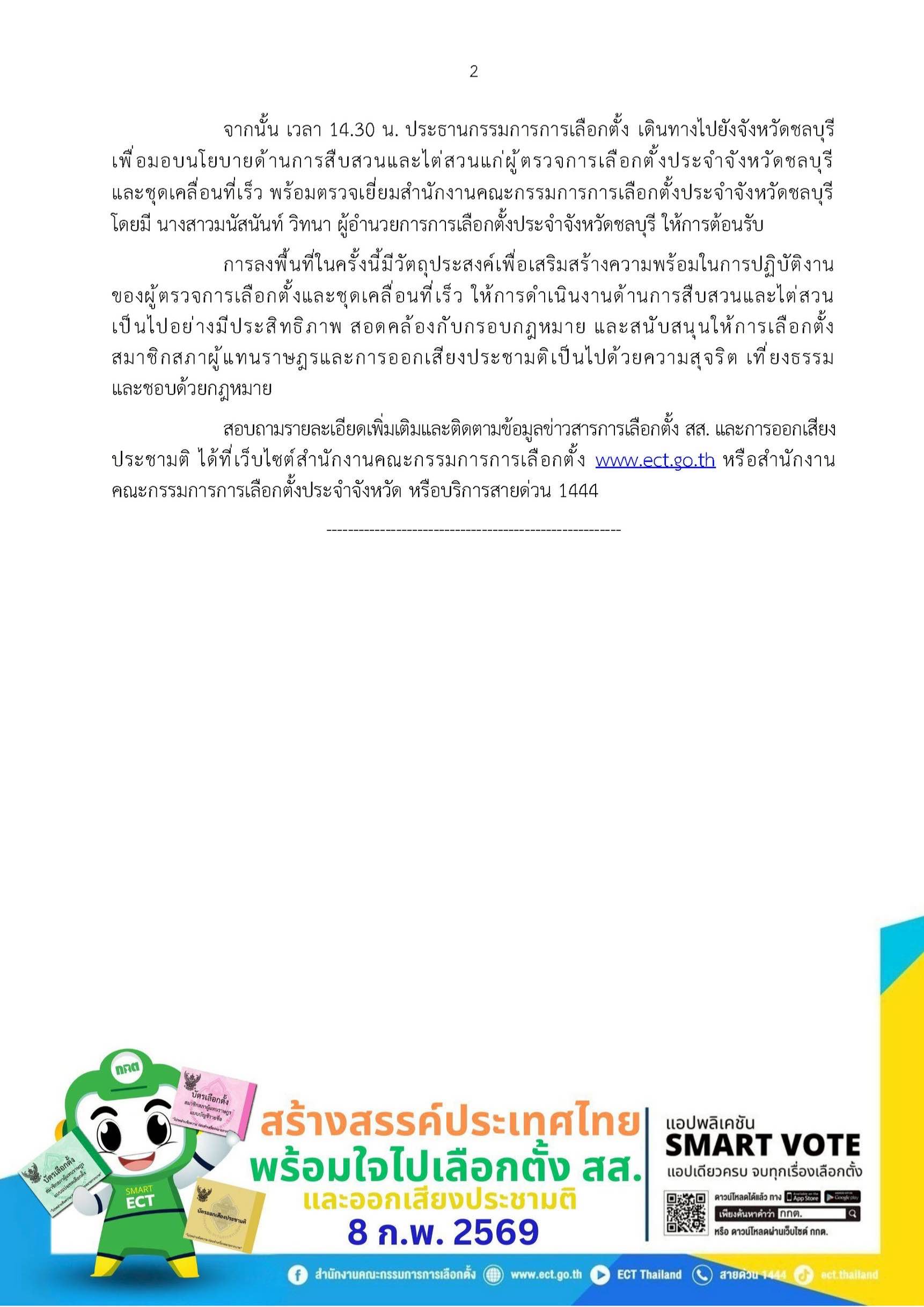 จากนั้น เวลา 14.30 น. ประธานกกต.เดินทางไปยังจังหวัดชลบุรีเพื่อมอบนโยบายด้านการสืบสวนและไต่สวนแก่ผู้ตรวจการเลือกตั้งประจำจังหวัดชลบุรีและชุดเคลื่อนที่เร็ว พร้อมตรวจเยี่ยมสำนักงานคณะกรรมการการเลือกตั้งประจำจังหวัดชลบุรี โดยมี นางสาวมนัสนันท์ วิทนา ผู้อำนวยการการเลือกตั้งประจำจังหวัดชลบุรี ให้การต้อนรับ การลงพื้นที่ในครั้งนี้มีวัตถุประสงค์เพื่อเสริมสร้างความพร้อมในการปฏิบัติงานของผู้ตรวจการเลือกตั้งและชุดเคลื่อนที่เร็ว ให้การดำเนินงานด้านการสืบสวนและไต่สวนเป็นไปอย่างมีประสิทธิภาพ สอดคล้องกับกรอบกฎหมาย และสนับสนุนให้การเลือกตั้งสมาชิกสภาผู้แทนราษฎรและการออกเสียงประชามติเป็นไปด้วยความสุจริต เที่ยงธรรมและชอบด้วยกฎหมาย