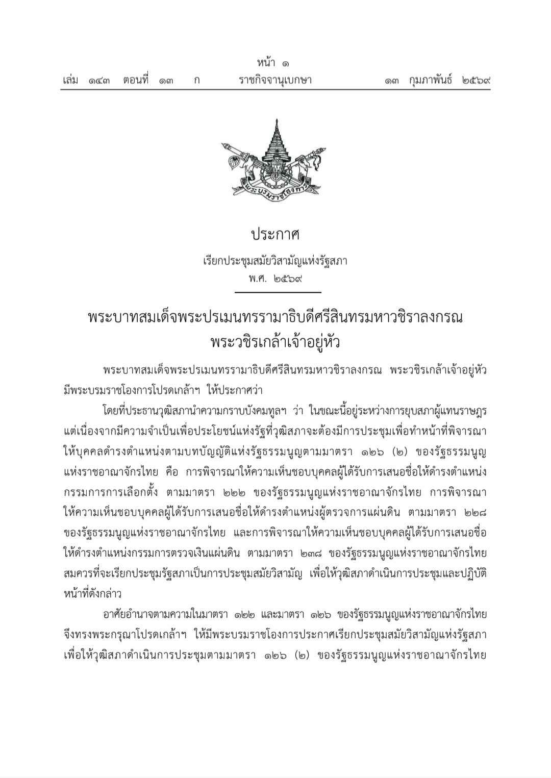 ราชกิจจานุเบกษา เผยแพร่ประกาศเรียกประชุมสมัยวิสามัญแห่งรัฐสภา พ.ศ. 2569 ความว่า พระบาทสมเด็จพระปรเมนทรรามาธิบดีศรีสินทรมหาวชิราลงกรณ พระวชิรเกล้าเจ้าอยู่หัว มีพระบรมราชโองการโปรดเกล้าฯ ให้ประกาศว่า โดยที่ประธานวุฒิสภานำความกราบบังคมทูลฯ ว่า ในขณะนี้อยู่ระหว่างการยุบสภาผู้แทนราษฎร แต่เนื่องจากมีความจำเป็นเพื่อประโยชน์แห่งรัฐที่วุฒิสภาจะต้องมีการประชุมเพื่อทำหน้าที่พิจารณาให้บุคคลดำรงตำแหน่งตามบทบัญญัติแห่งรัฐธรรมนูญ ตามมาตรา 126 (2) ของรัฐธรรมนูญแห่งราชอาณาจักรไทย คือ การพิจารณาให้ความเห็นชอบบุคคลผู้ได้รับการเสนอชื่อให้ดำรงตำแหน่งกรรมการการเลือกตั้ง (กกต.) ตามมาตรา 222 ของรัฐธรรมนูญแห่งราชอาณาจักรไทย การพิจารณาให้ความเห็นชอบบุคคลผู้ได้รับการเสนอชื่อให้ดำรงตำแหน่งผู้ตรวจการแผ่นดิน ตามมาตรา 228 ของรัฐธรรมนูญแห่งราชอาณาจักรไทย และการพิจารณาให้ความเห็นชอบบุคคลผู้ได้รับการเสนอชื่อให้ดำรงตำแหน่งกรรมการตรวจเงินแผ่นดิน ตามมาตรา 238 ของรัฐธรรมนูญแห่งราชอาณาจักรไทย สมควรที่จะเรียกประชุมรัฐสภาเป็นการประชุมสมัยวิสามัญ เพื่อให้วุฒิสภาดำเนินการประชุมและปฏิบัติหน้าที่ดังกล่าว