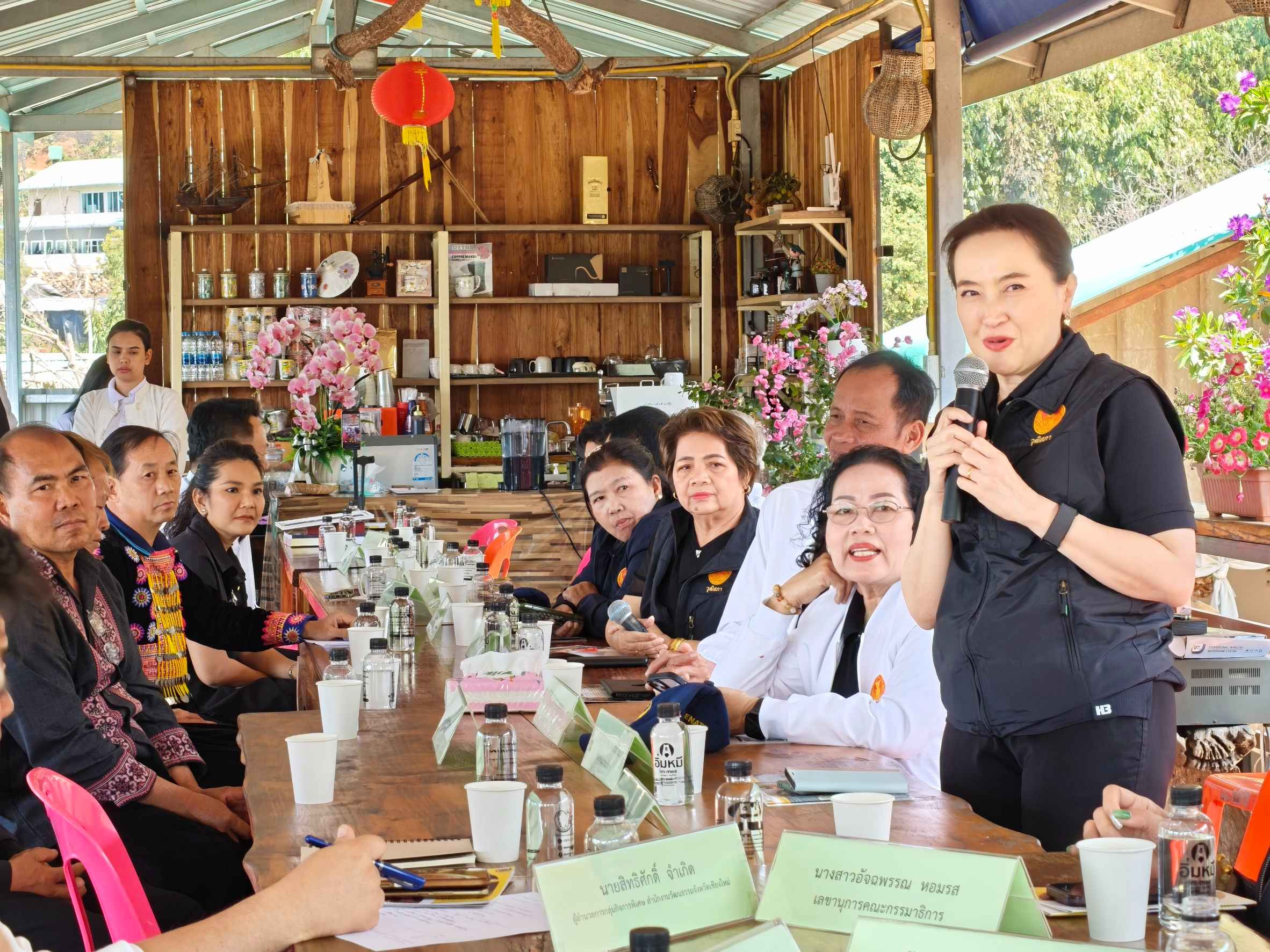 จากนั้น ประธาน กมธ. และคณะ ได้ลงพื้นที่ประชุมร่วมและแลกเปลี่ยนความคิดเห็น ณ หมู่บ้านม้งดอยปุย จังหวัดเชียงใหม่ ร่วมกับผู้บริหารท้องถิ่น ผู้นำชุมชน และผู้ที่เกี่ยวข้อง เพื่อรับฟังความคิดเห็นและศึกษาวิถีชีวิตของชุมชนชาติพันธุ์ม้งจากพื้นที่จริง โดยได้กล่าวขอบคุณผู้นำชุมชนและหน่วยงานในพื้นที่ที่ให้การต้อนรับอย่างอบอุ่น พร้อมกล่าวถึงหมู่บ้านม้งดอยปุยในฐานะชุมชนชาติพันธุ์ที่มีอัตลักษณ์ทางวัฒนธรรมโดดเด่น ทั้งด้านวิถีชีวิต ความเชื่อ ประเพณี และภูมิปัญญาท้องถิ่น โดยเฉพาะงานหัตถกรรมพื้นบ้าน งานทอผ้า และเครื่องแต่งกายประจำเผ่าม้ง ซึ่งสะท้อนการสืบทอดองค์ความรู้จากรุ่นสู่รุ่น และคุณค่าทางศิลปวัฒนธรรมของประเทศ