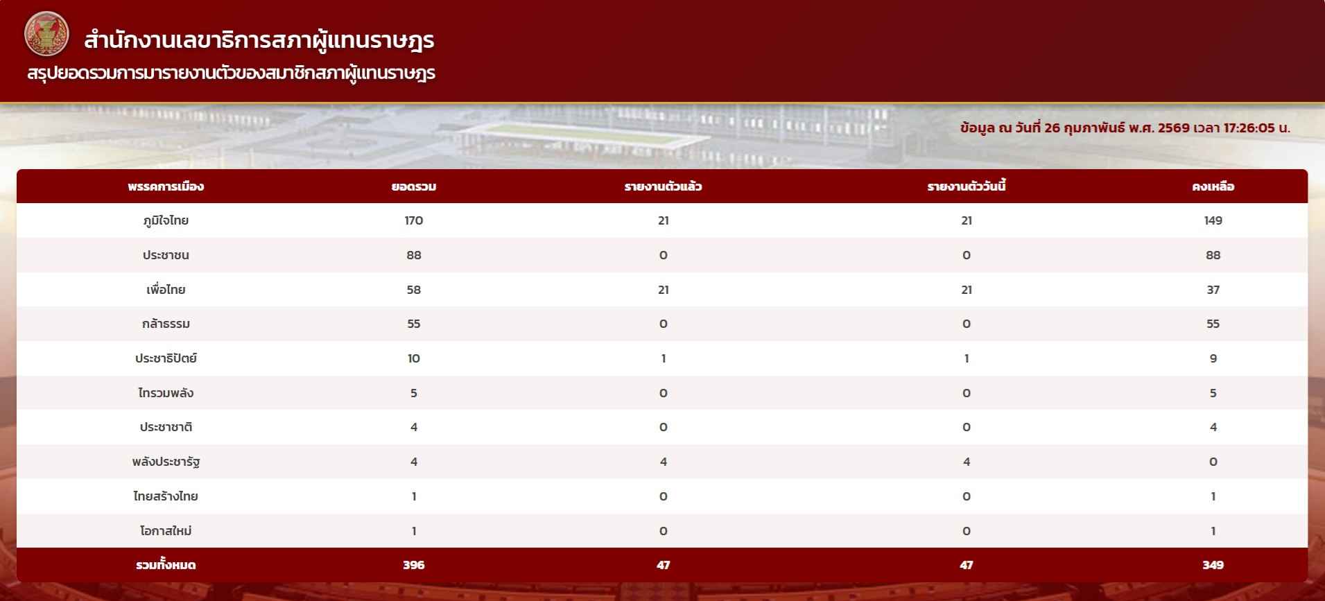 ทั้งนี้ สส. ที่เดินทางมารายงานตัวต่อสำนักงานเลขาธิการสภาผู้แทนราษฎร 47 คน แบ่งเป็น สส.จากพรรคภูมิใจไทย (ภท.) จำนวน 21 คน พรรคเพื่อไทย (พท.) จำนวน 21 คน และพรรคประชาธิปัตย์ (ปชป.) จำนวน 1 คน และพรรคพลังประชารัฐ (พปชร.) จำนวน 4 คน คงเหลือ สส.แบบแบ่งเขตเลือกตั้งที่ยังไม่มารายงานตัว จำนวน 349 คน ซึ่งเบื้องต้นมีรายงานจากพรรคเพื่อไทยว่าในวันพรุ่งนี้ (27 ก.พ. 69) มีนัดรวมตัว สส. ณ ที่ทำการพรรค ก่อนแกนนำของพรรคจะนำคณะ สส.แบบแบ่งเขต เดินทางมารายงานตัวต่อสำนักงานเลขาธิการสภาผู้แทนราษฎรในเวลา 10.00 น.