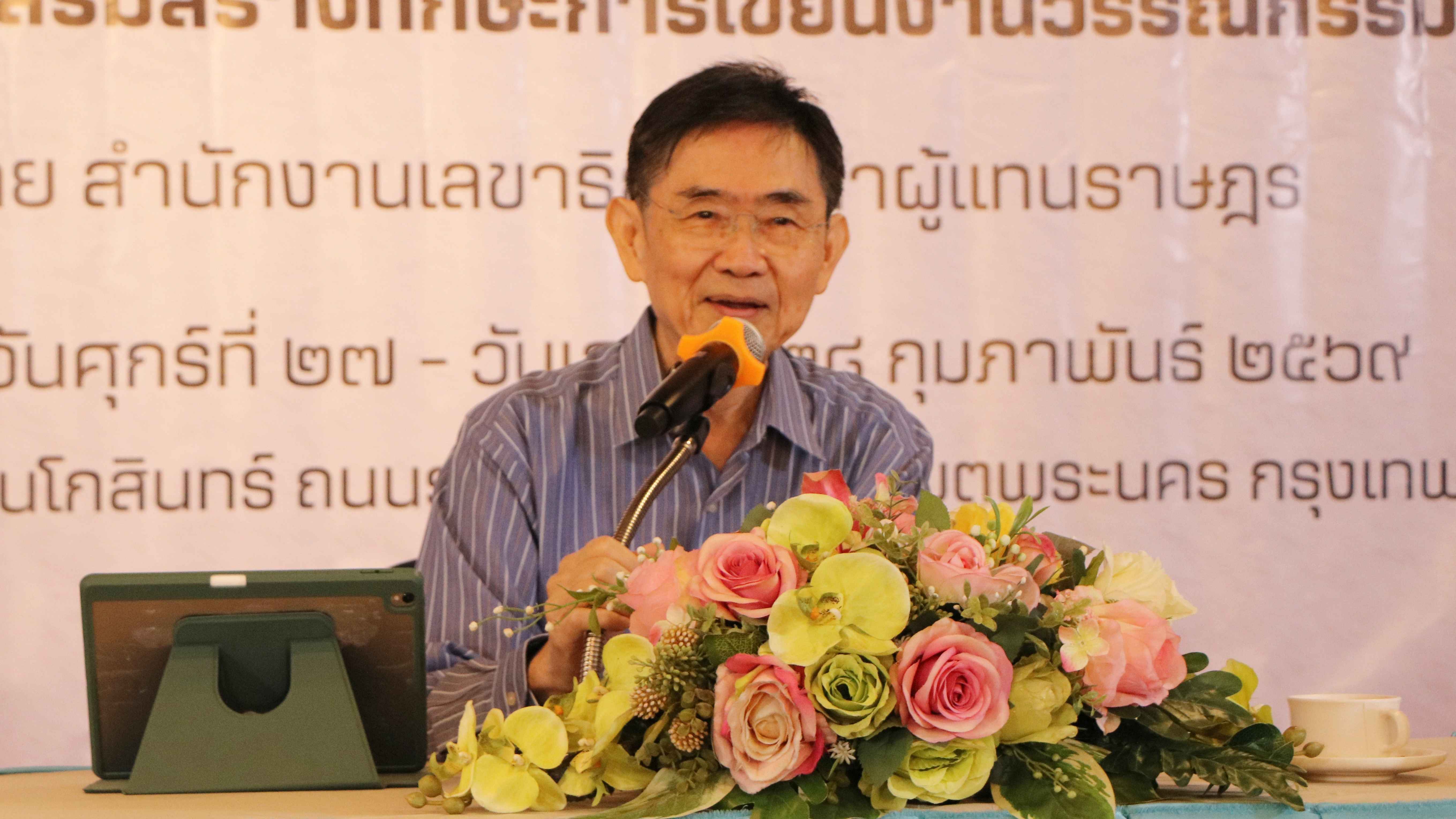 จากนั้นเป็นการบรรยายในหัวข้อ “วรรณกรรมในเส้นทางประวัติศาสตร์การเมืองไทย” โดย ศาสตราจารย์เกียรติคุณ ดร.ธเนศ อาภรณ์สุวรรณ นักเขียนรางวัลศรีบูรพา ประจำปี 2568